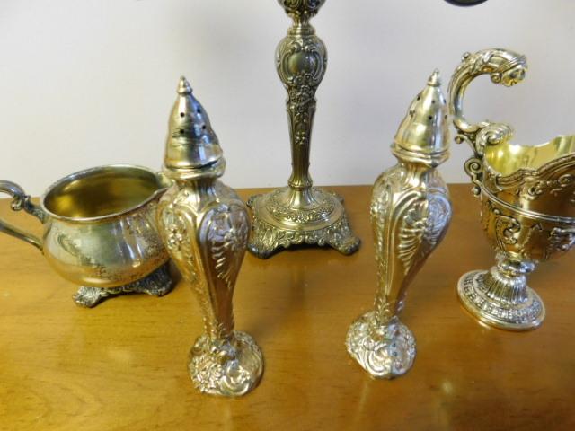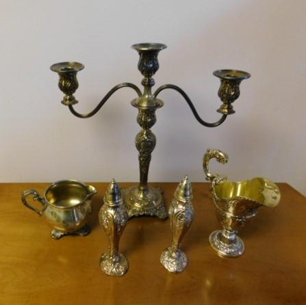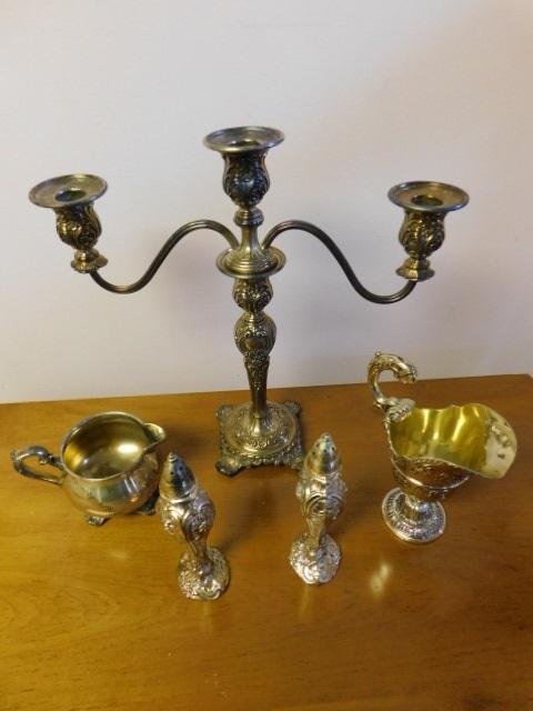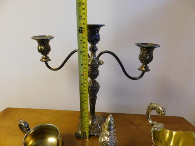 Nice Collection of Silver Plate Items includes Candelabra, Salt and Pepper Shakers and Other