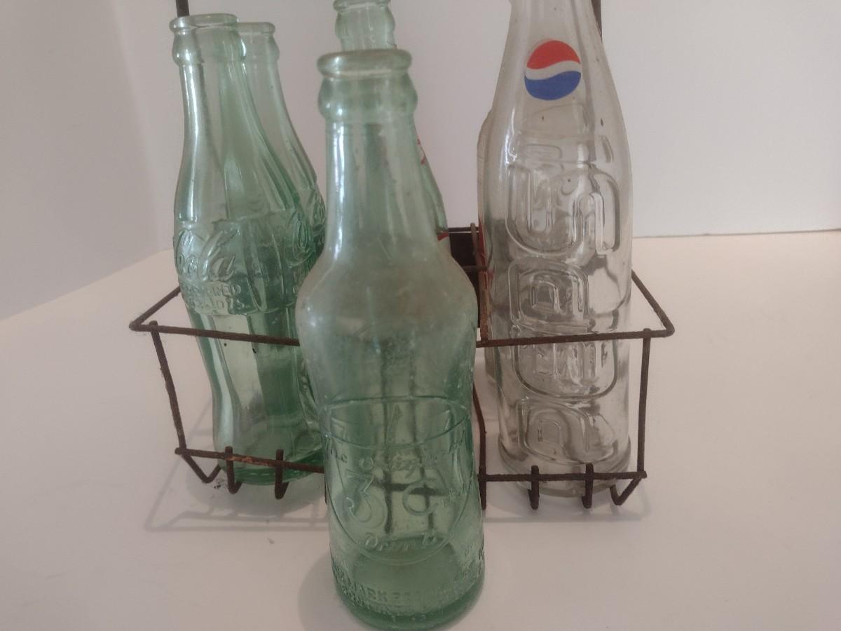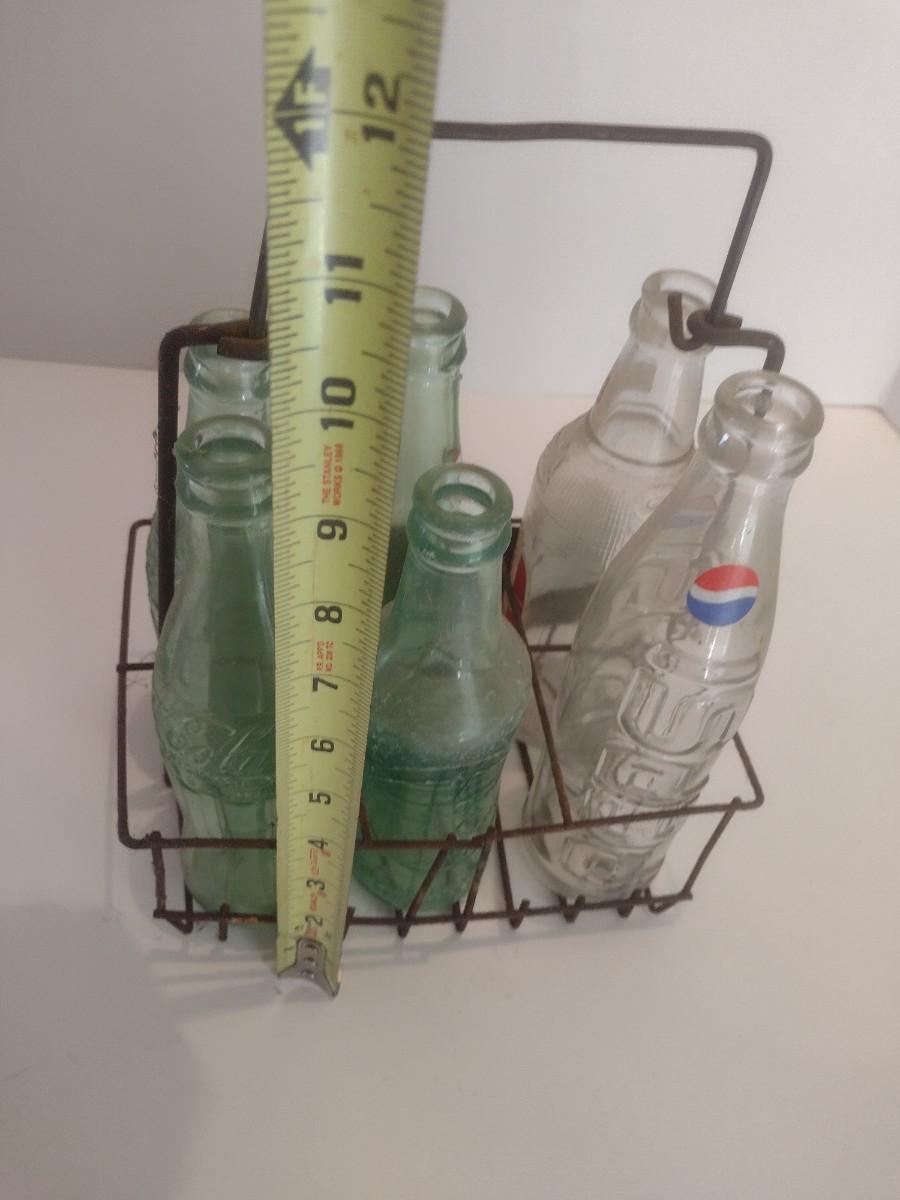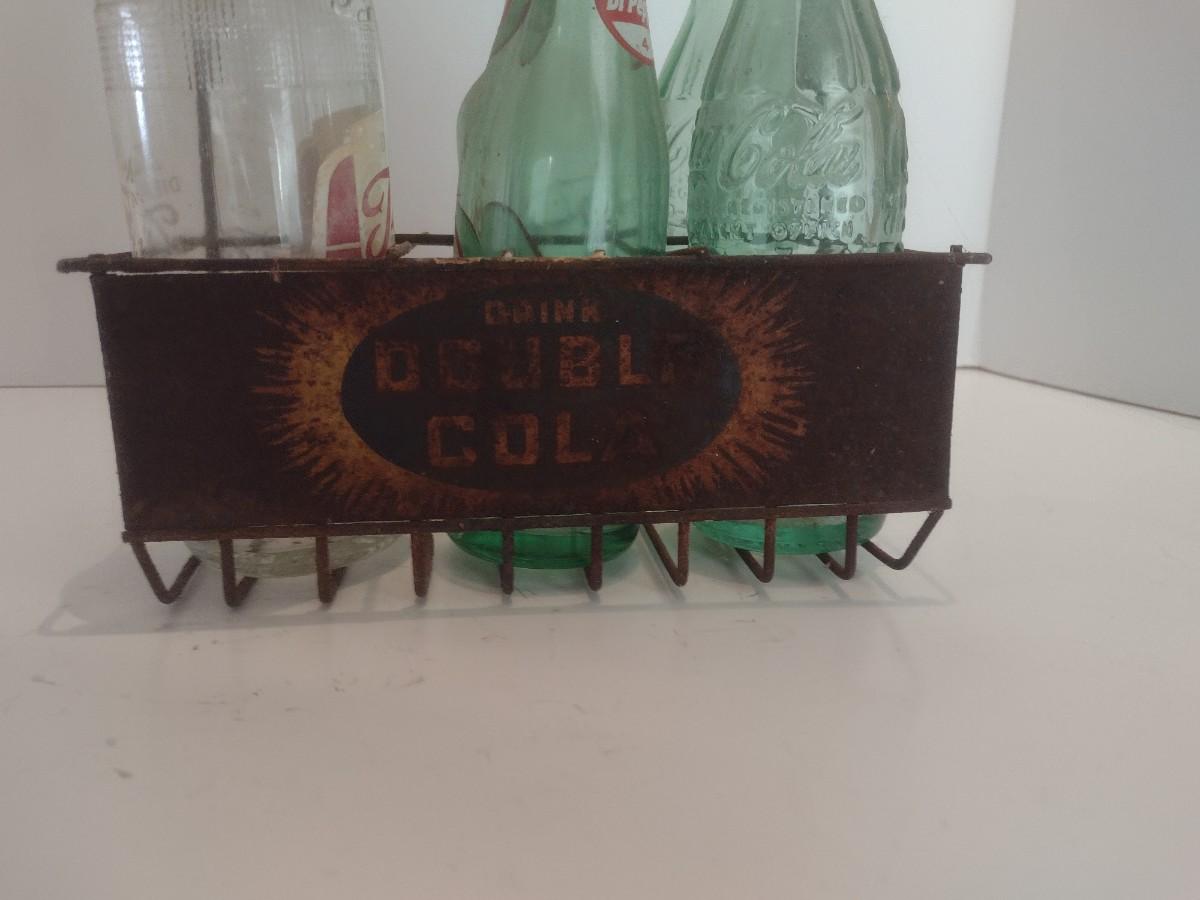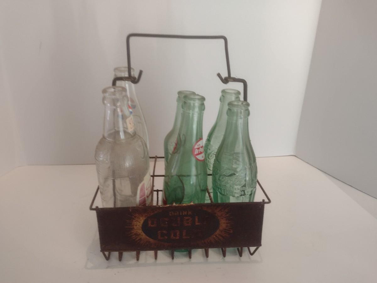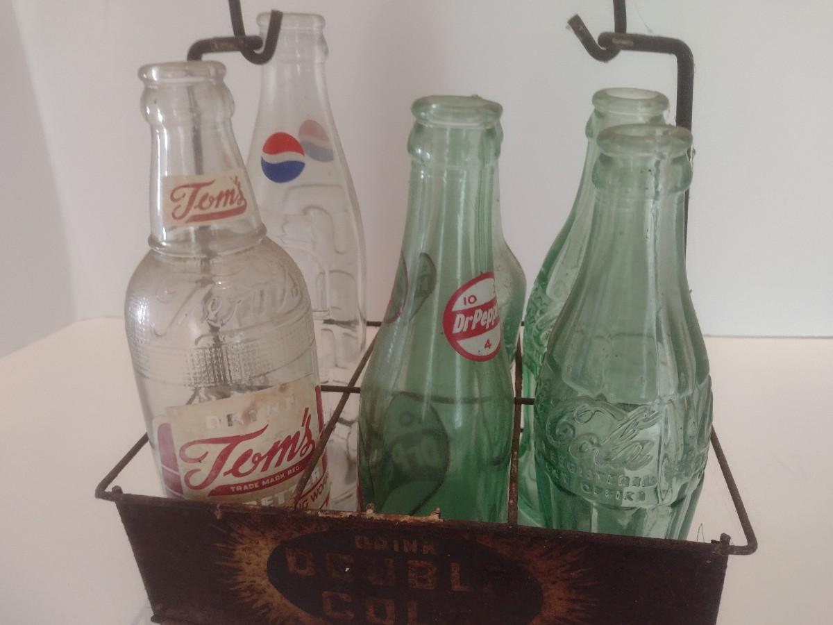 Nice Collection of Vintage Soda Bottles Includes Dr. Pepper, Coca-Cola, Tom's and The Original 3 Centa in a Double Cola Wire Carry Caddy