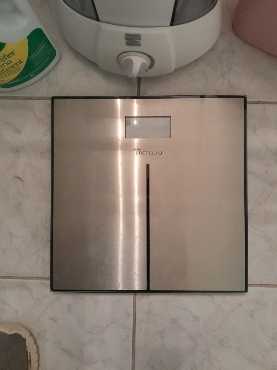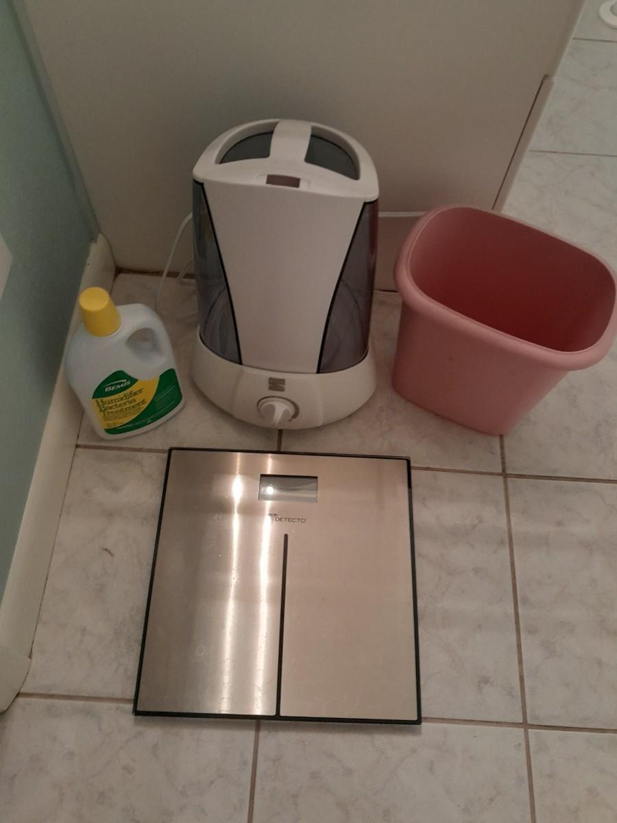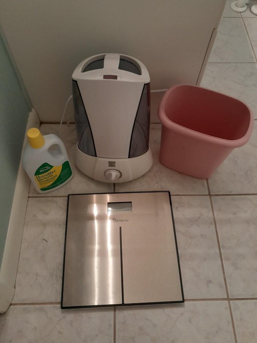 NICE DETECTO DIGITAL WEIGHT SCALE, KENMORE HUMIDIFIER WITH BACTERIA TREATMENT CLEANER AND A TRASHCAN