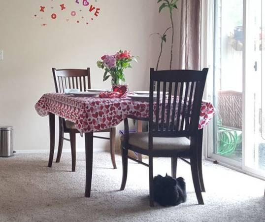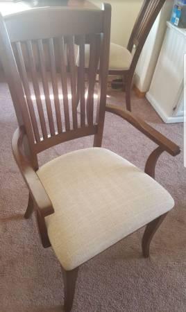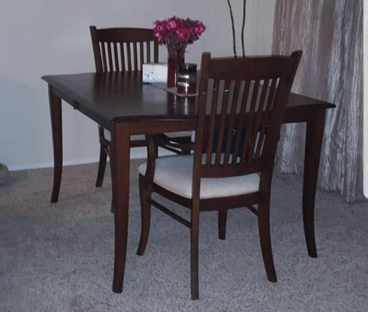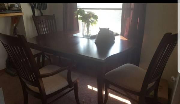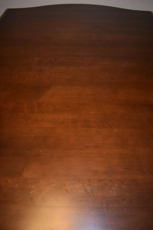 Overall good shape. Does have some light scratches but its still in nice shape chairs may show some small dings an light wear. Comes with 6 Chairs and 2 Leaves. Get the family around the table for Christmas! Pictures show the table without the leaves in it. Standard 4 person size until you put the leaves in.