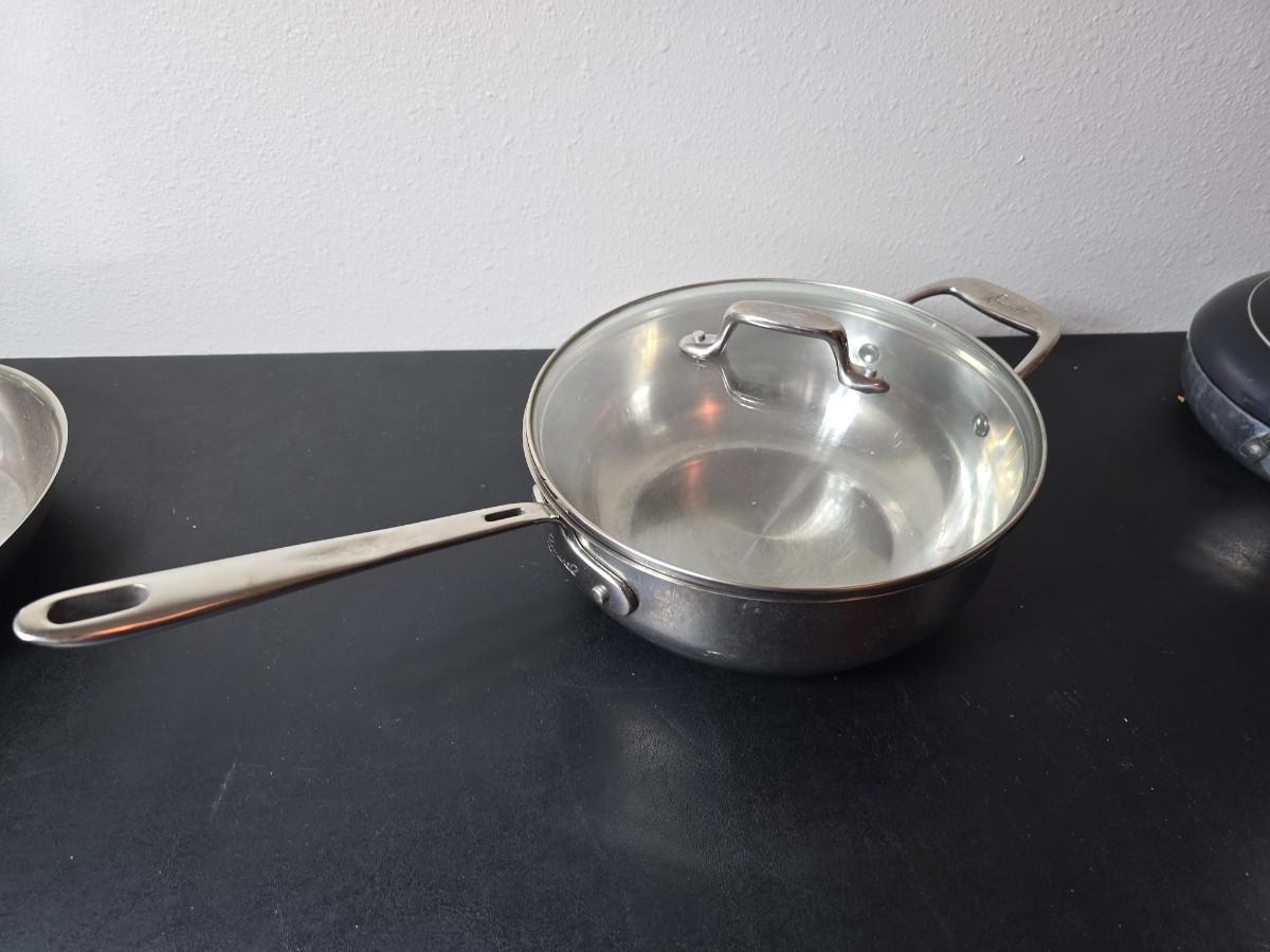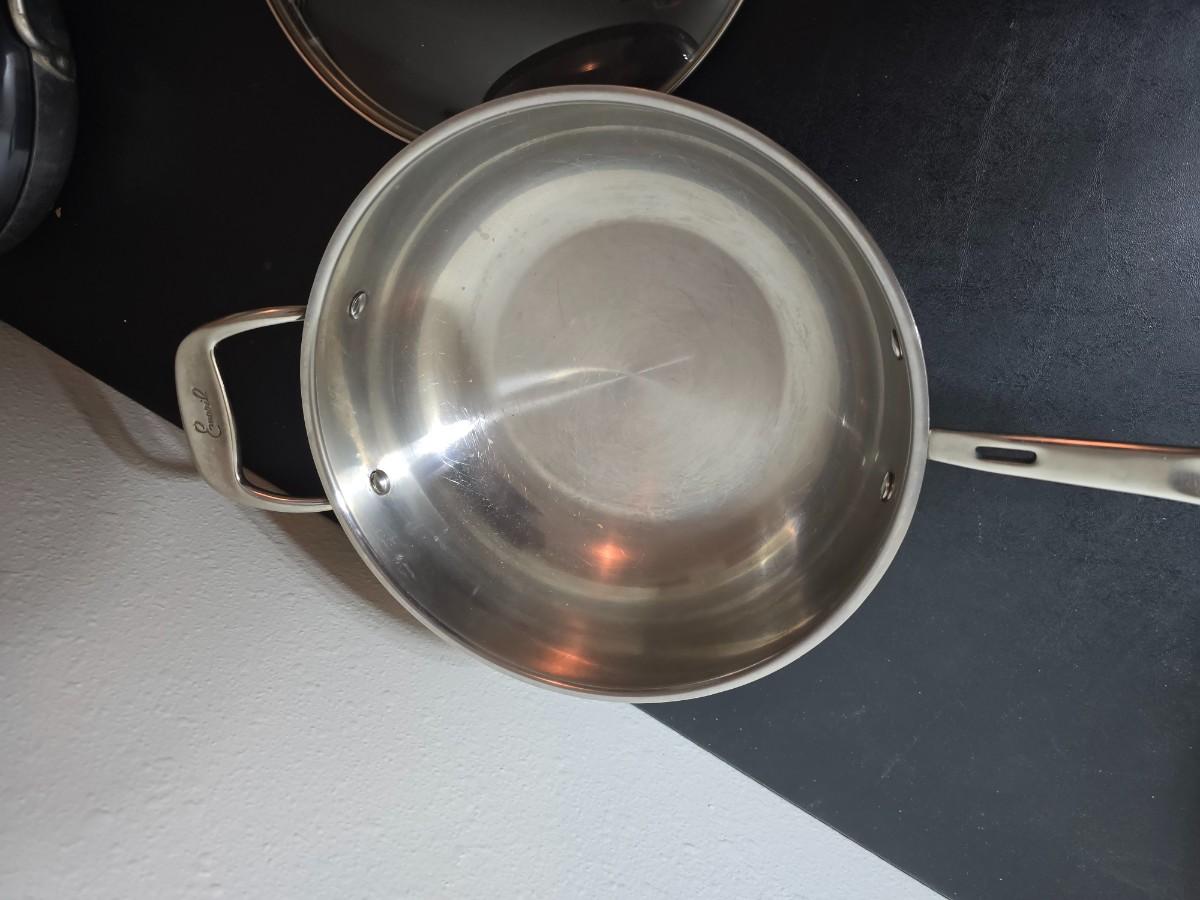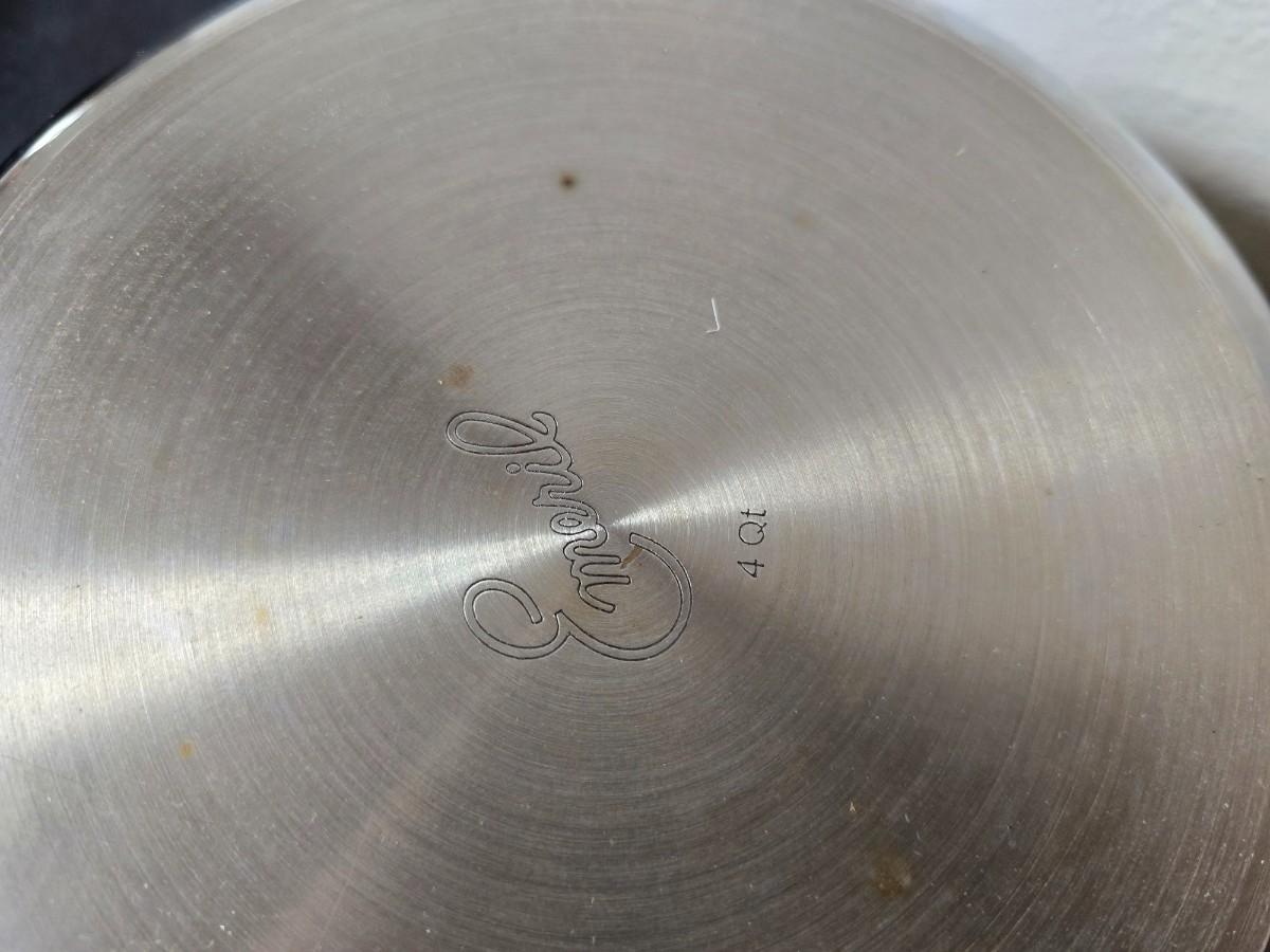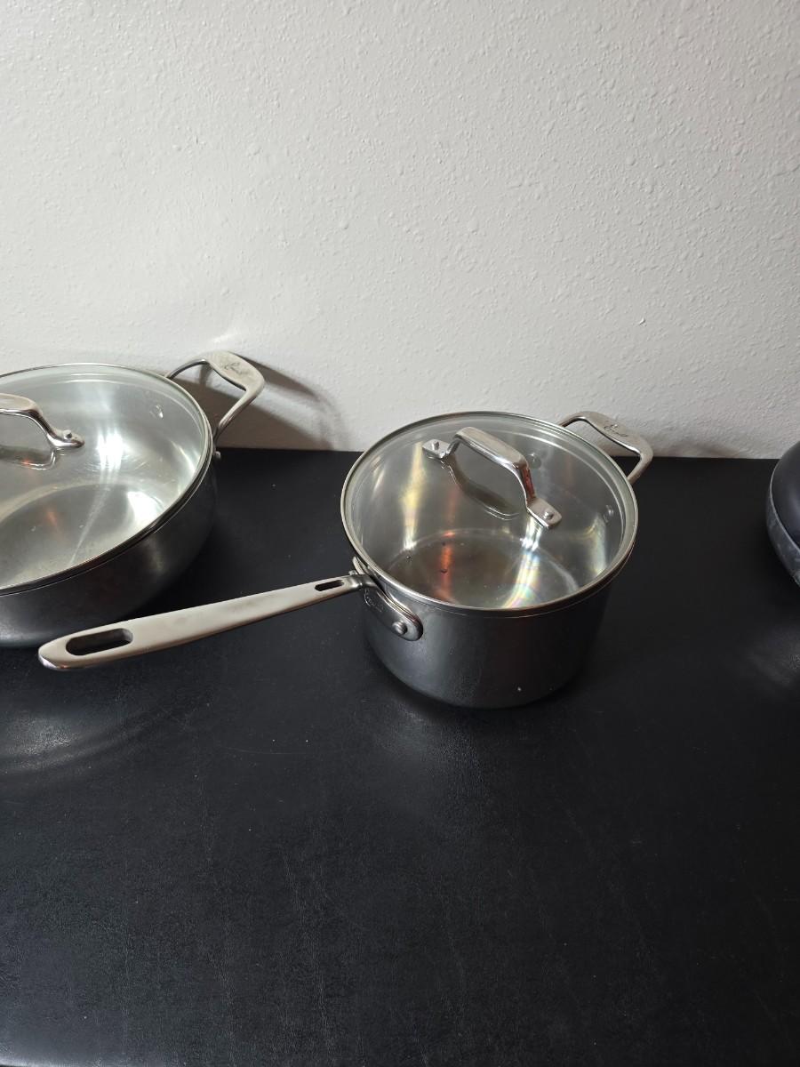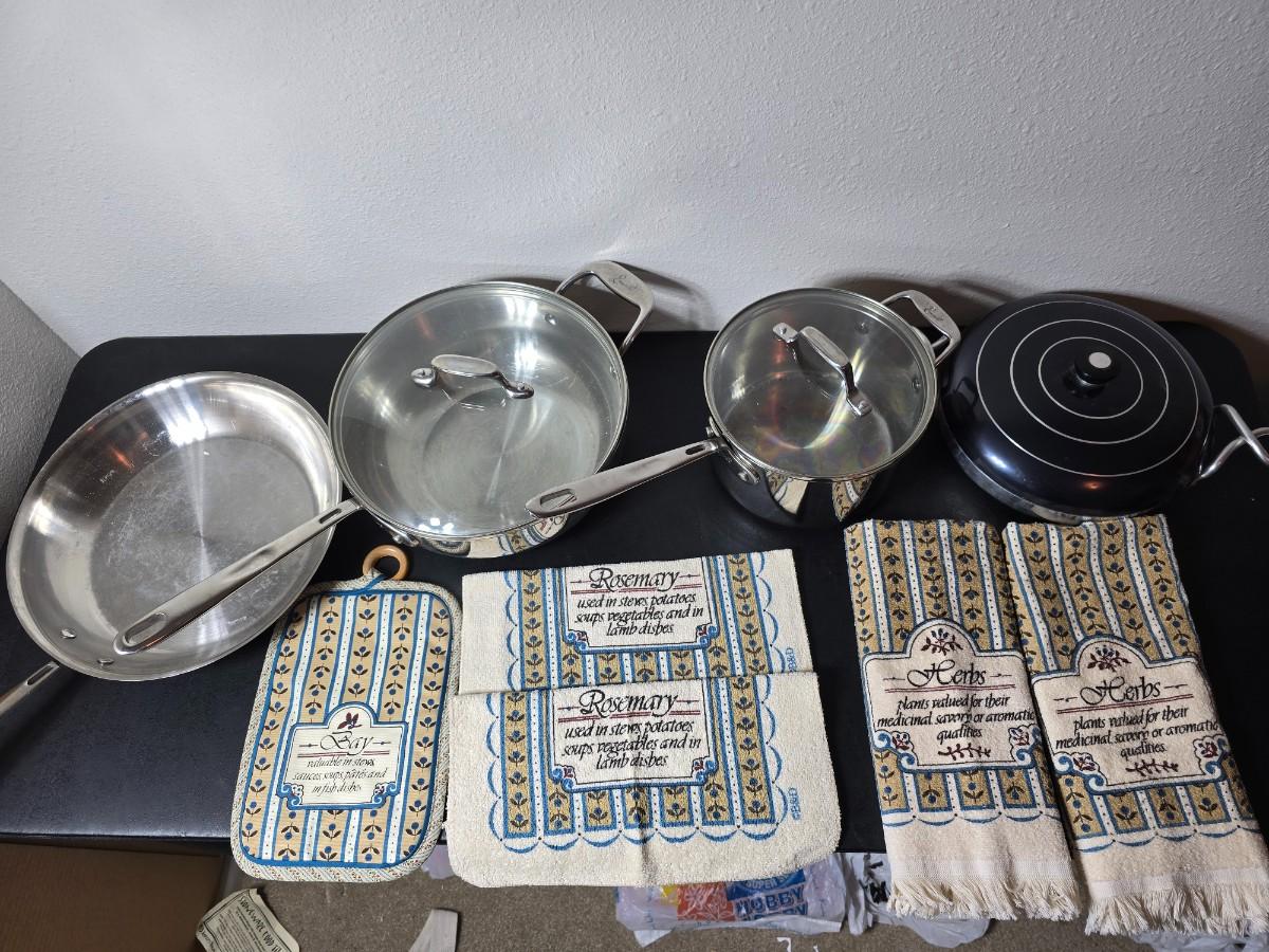 Nice Emeril three-piece pot & pan set, Wear-ever Aluminum pan with lid and a new Kitchen dish towel set