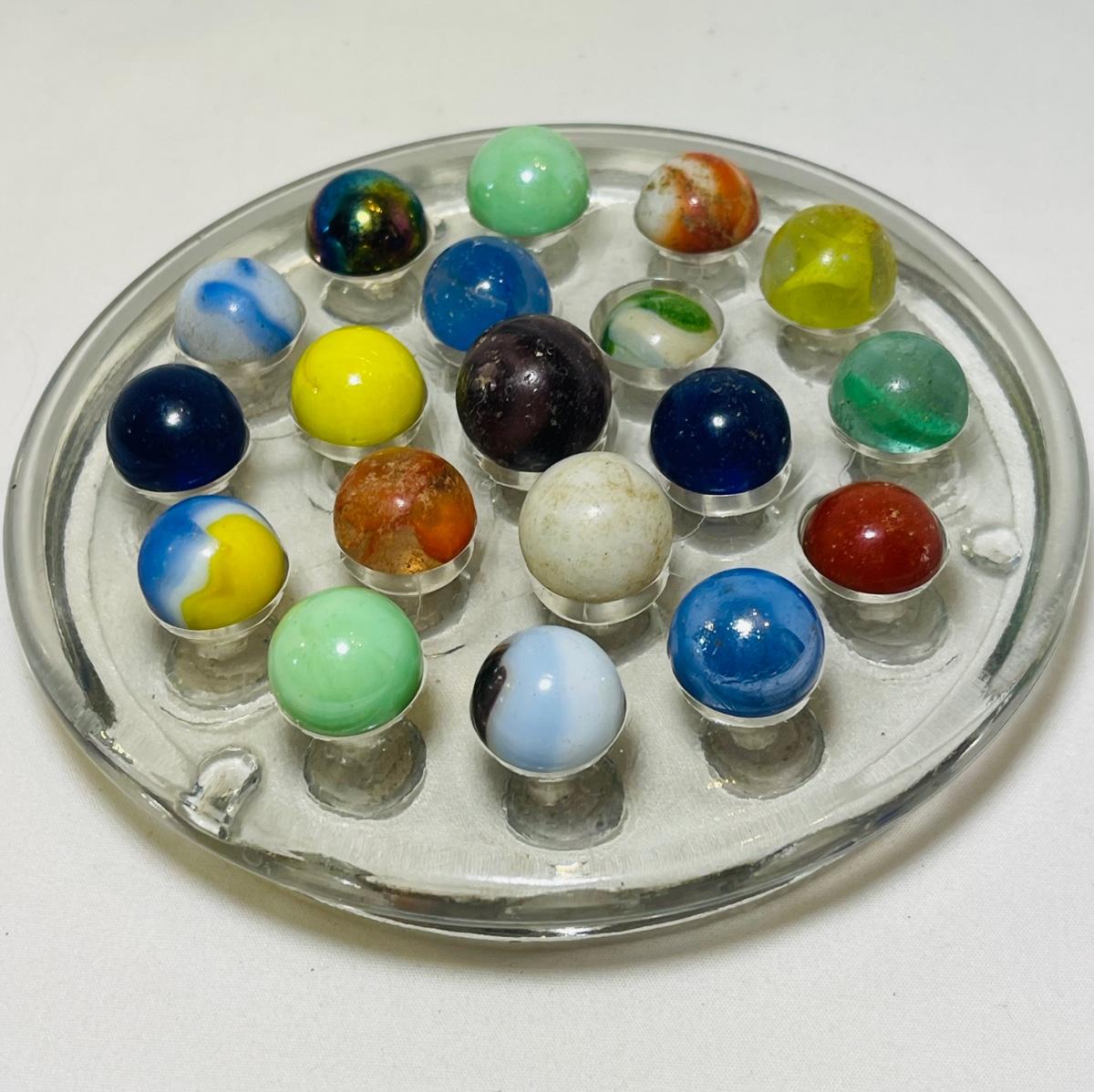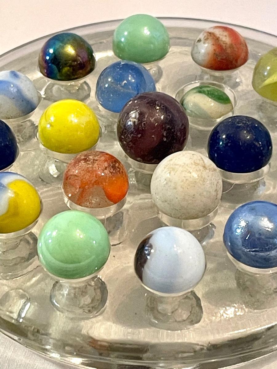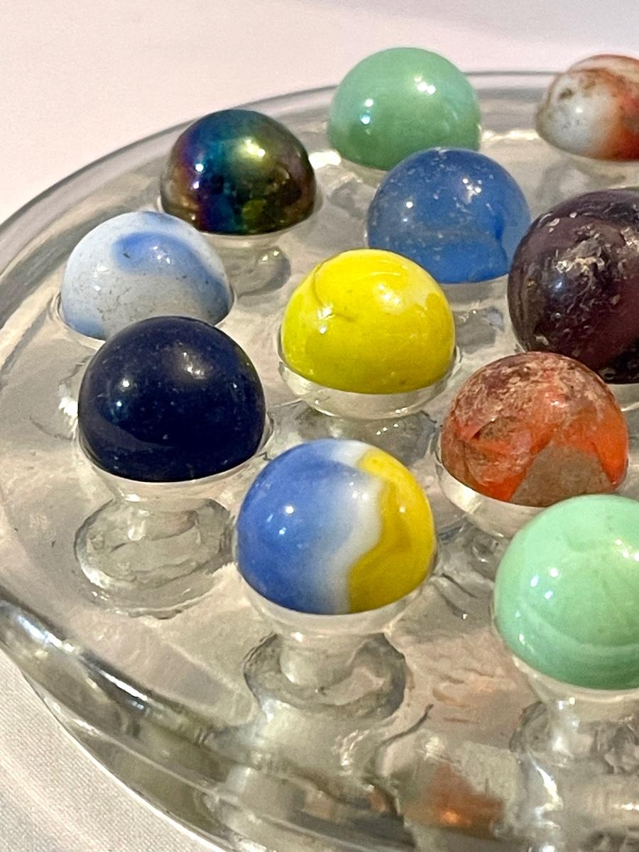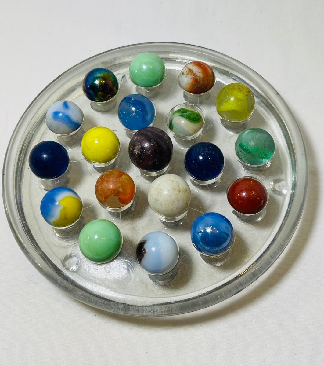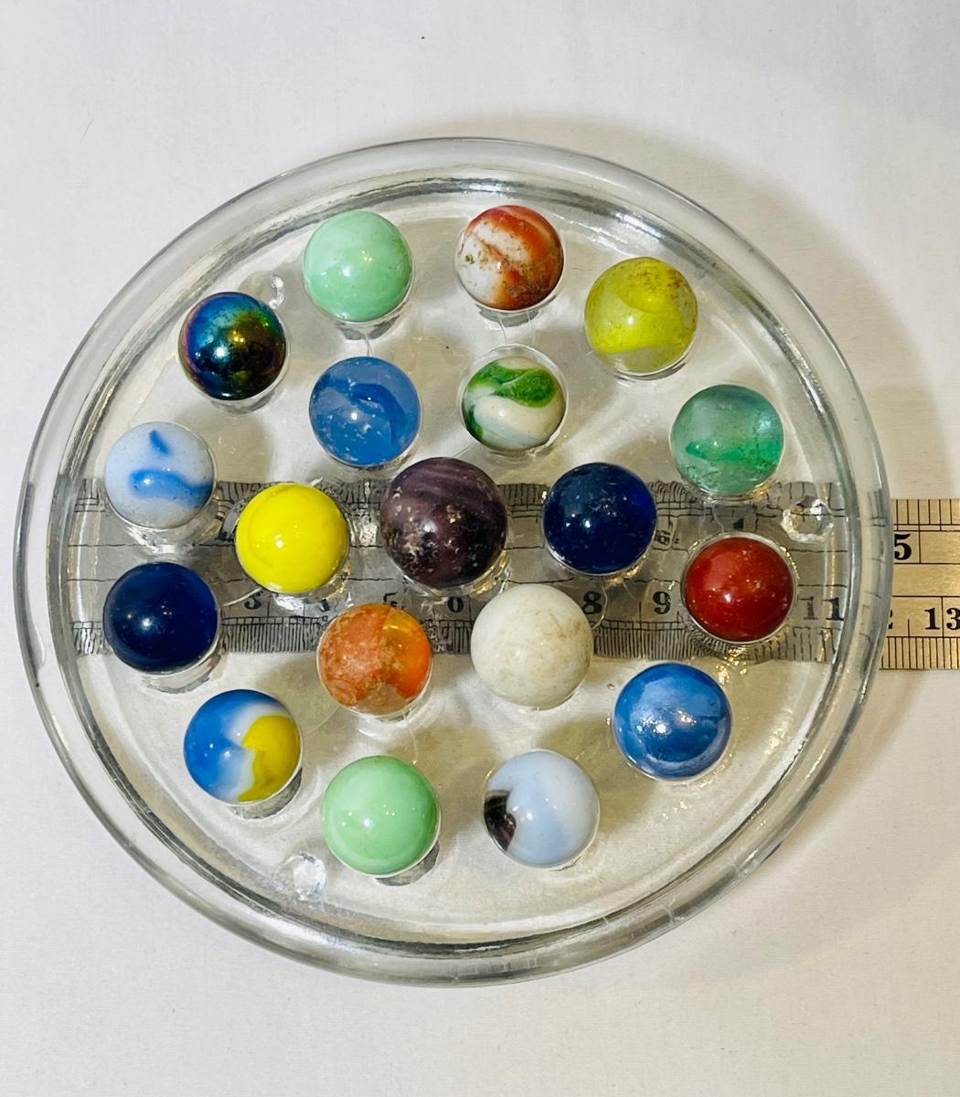 Great larger flower frog with some old marbles. The marbles show signs of use, and some are a bit dirty. Various sizes and colors included. Nice frog and nice marbles.