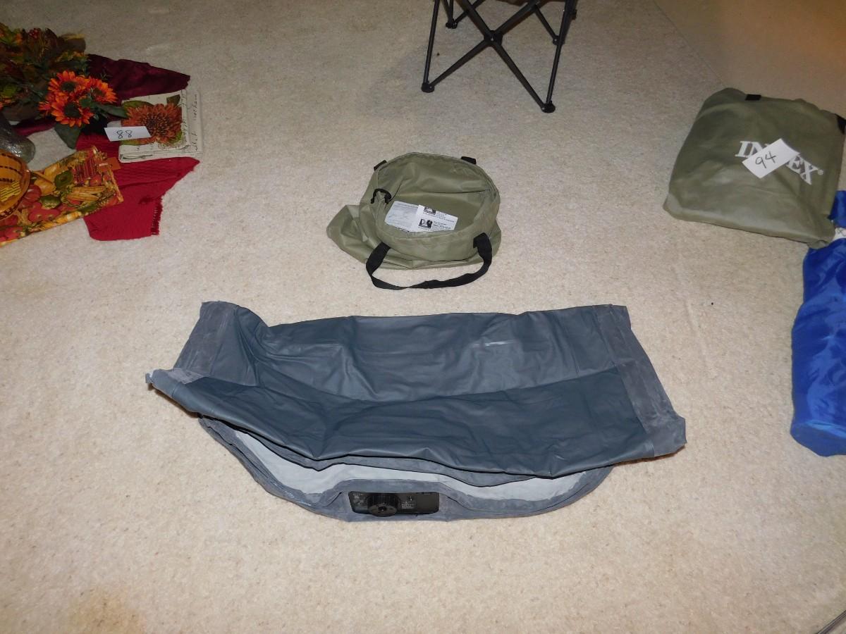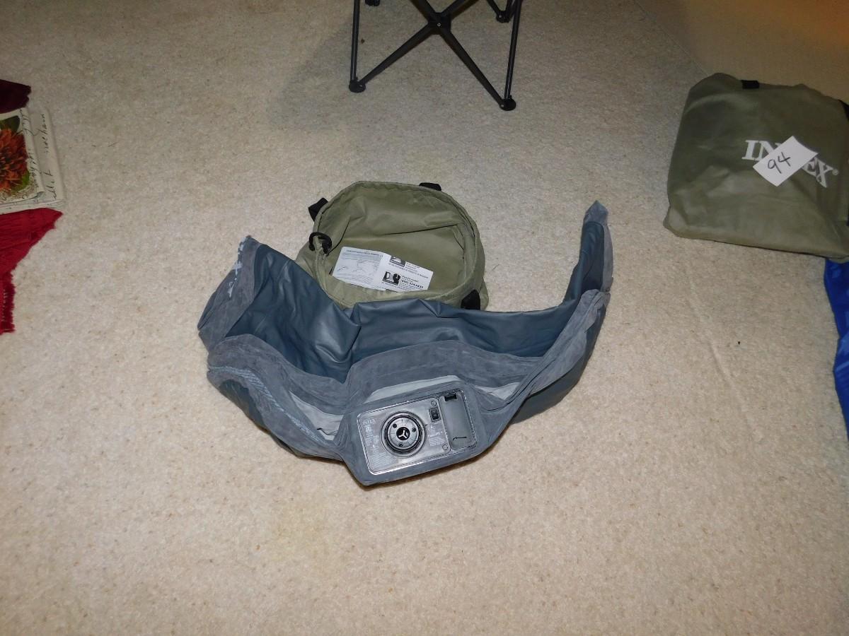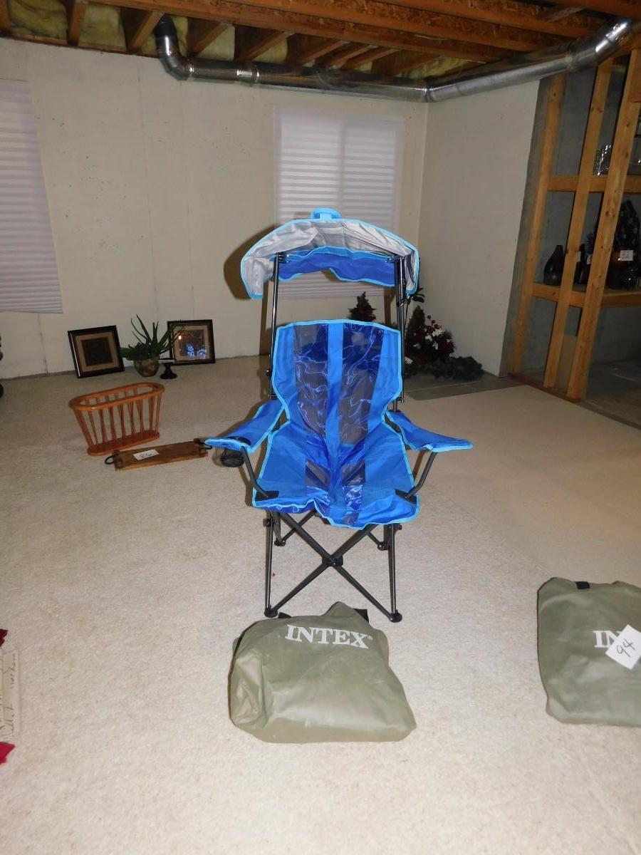 USED 1 TIME FOLDING CHAIR WITH ATTACHED CANOPY AND INTEX TWIN SELF INFLATING AIR MATTRESS