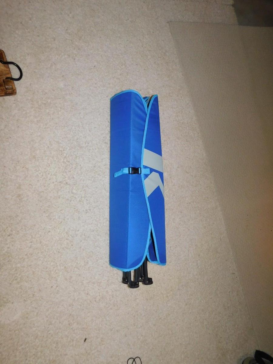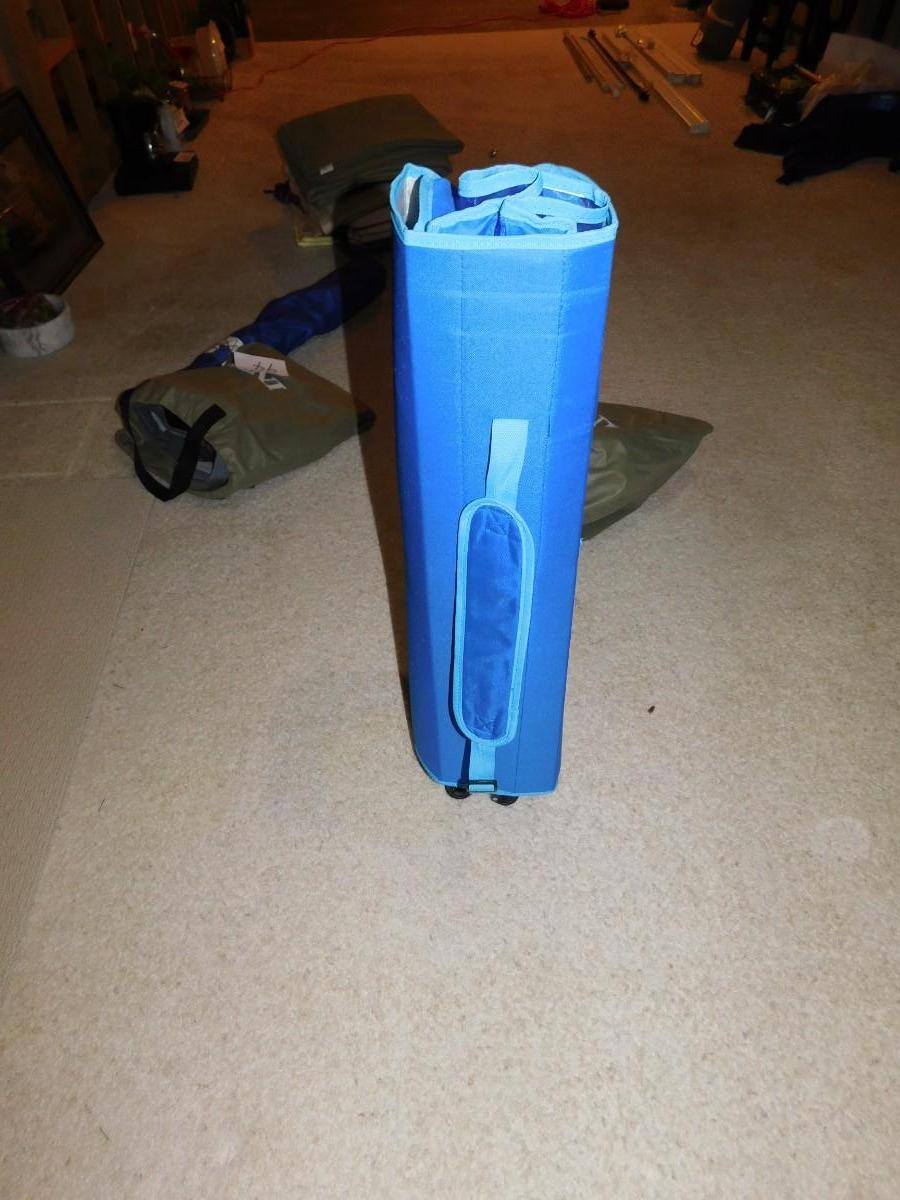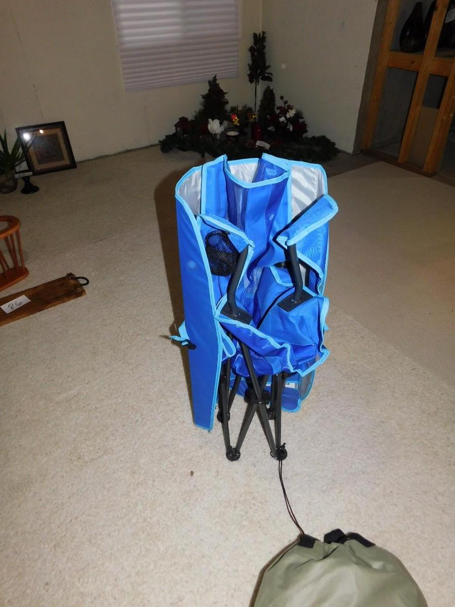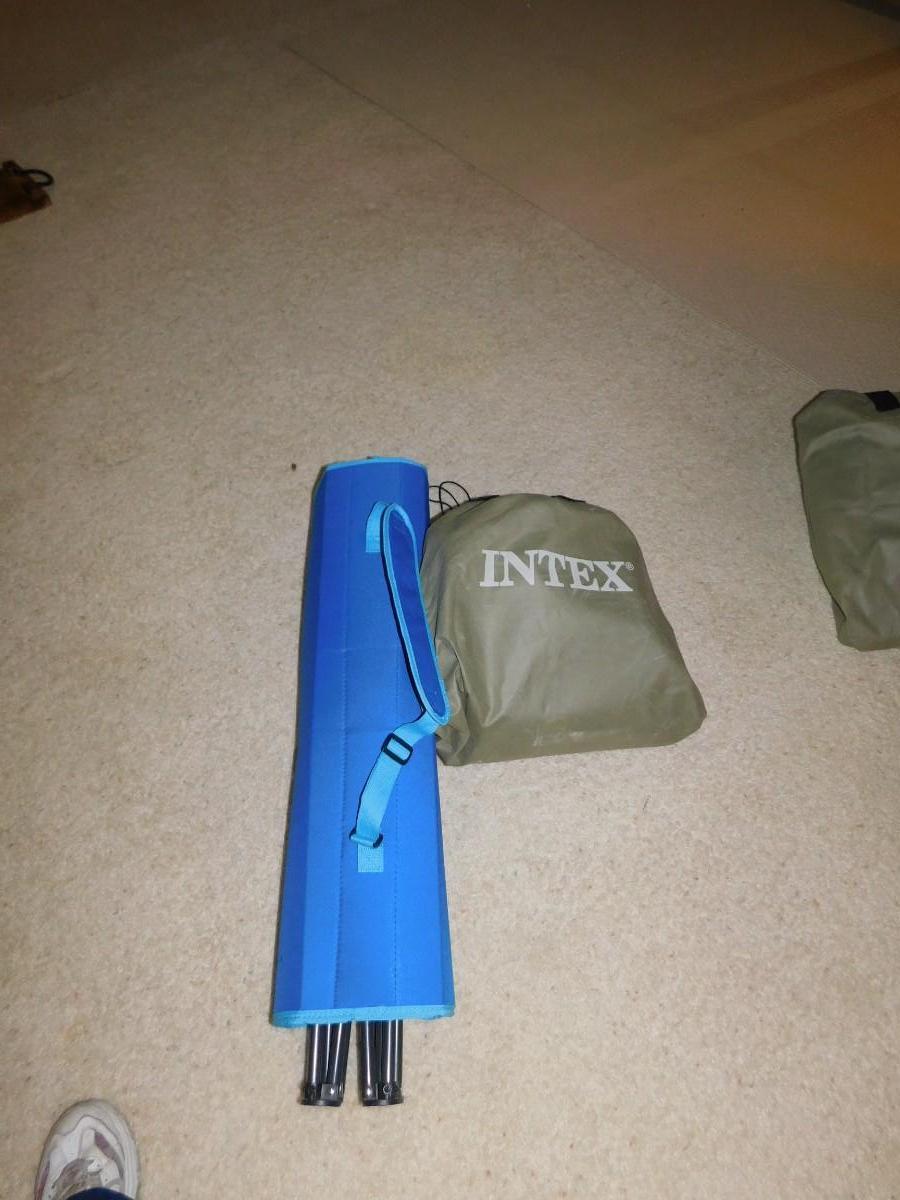 USED 1 TIME FOLDING CHAIR WITH ATTACHED CANOPY AND INTEX TWIN SELF INFLATING AIR MATTRESS