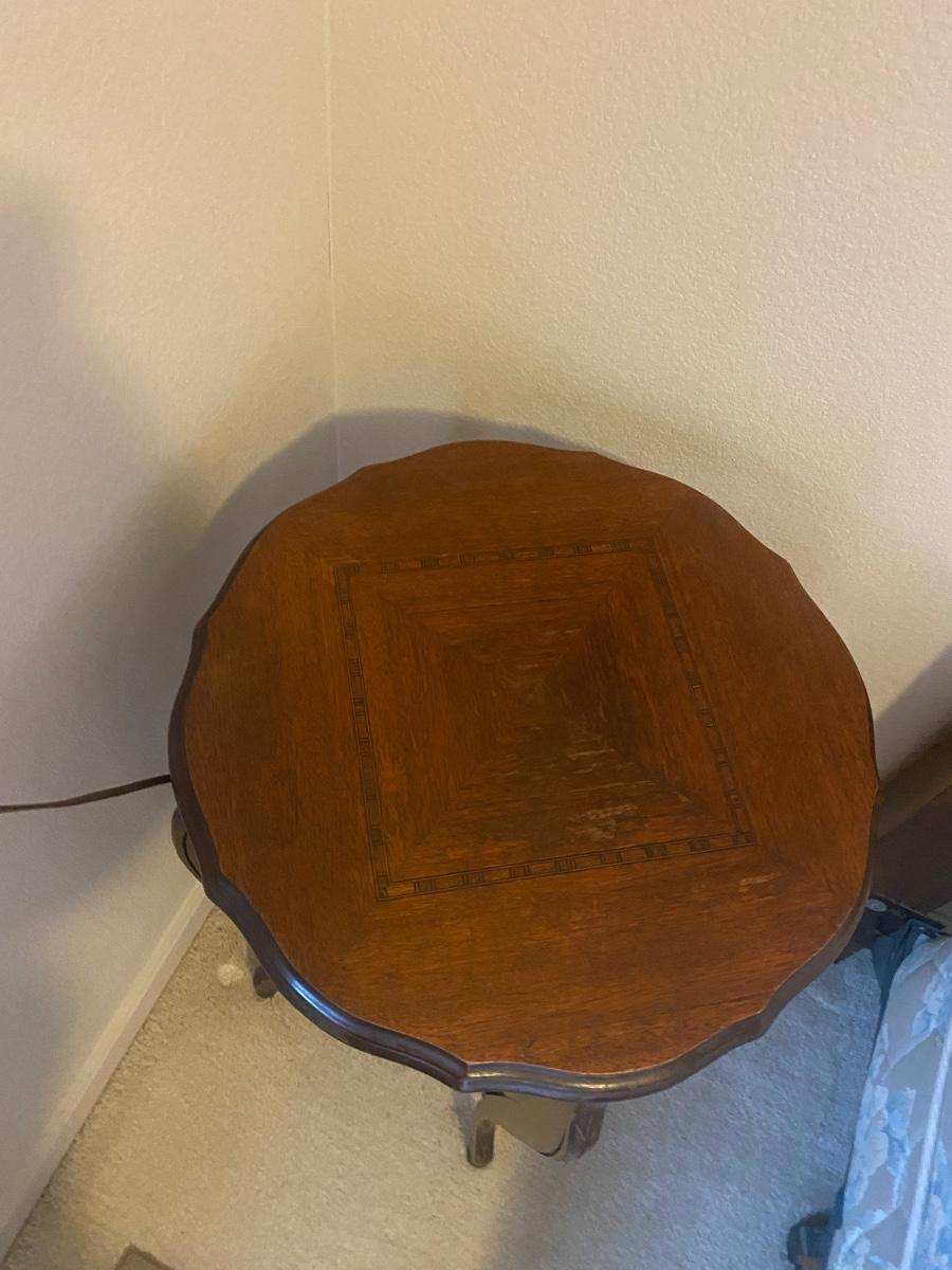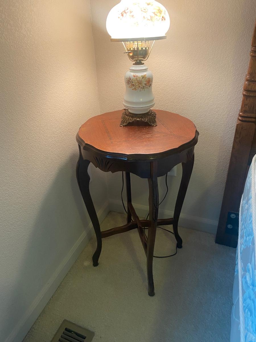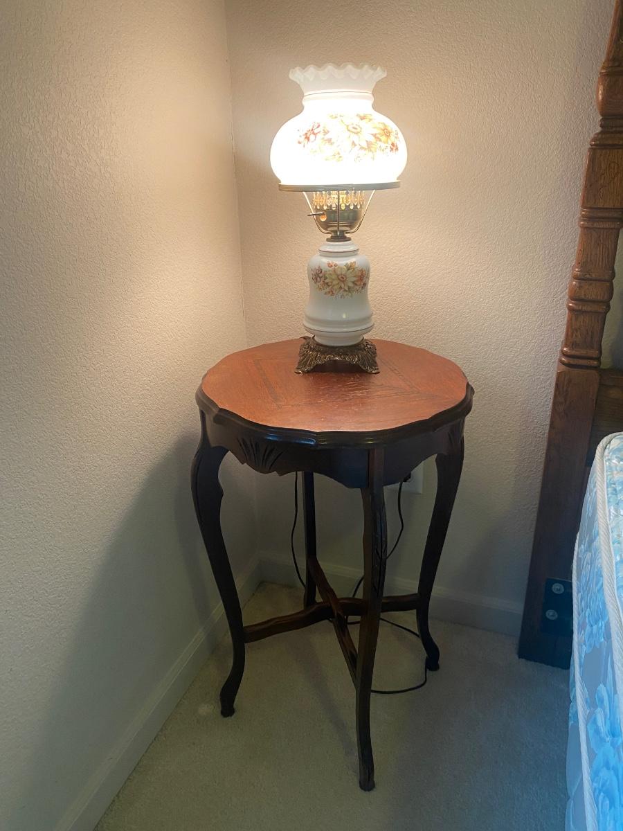 NICE LITTLE INLAID WOOD SIDE TABLE WITH GLASS GLOBE LAMP