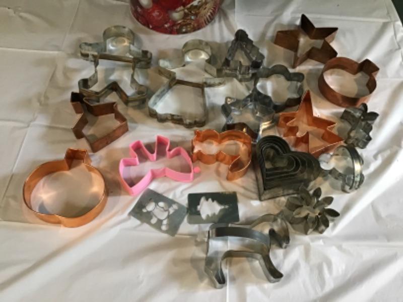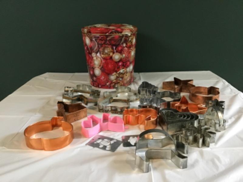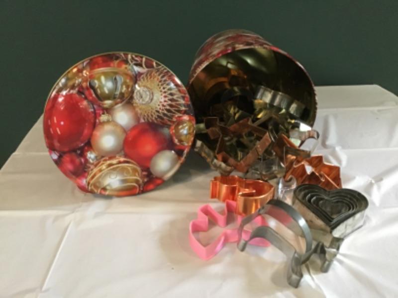 F-139 Nice Lot of Christmas Holiday Cookie Dough Cutters in a Festive Tin Can