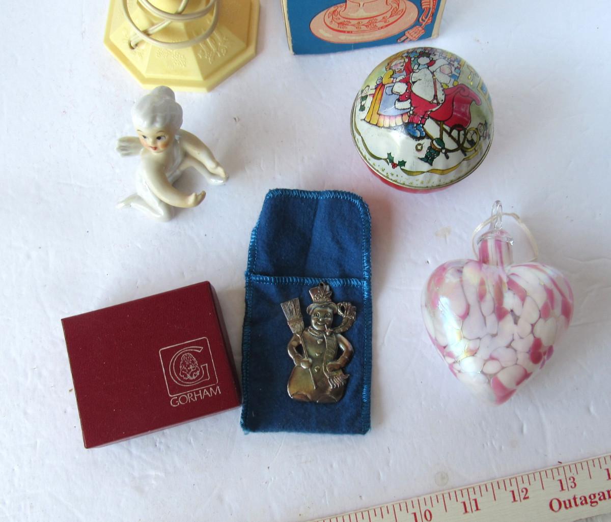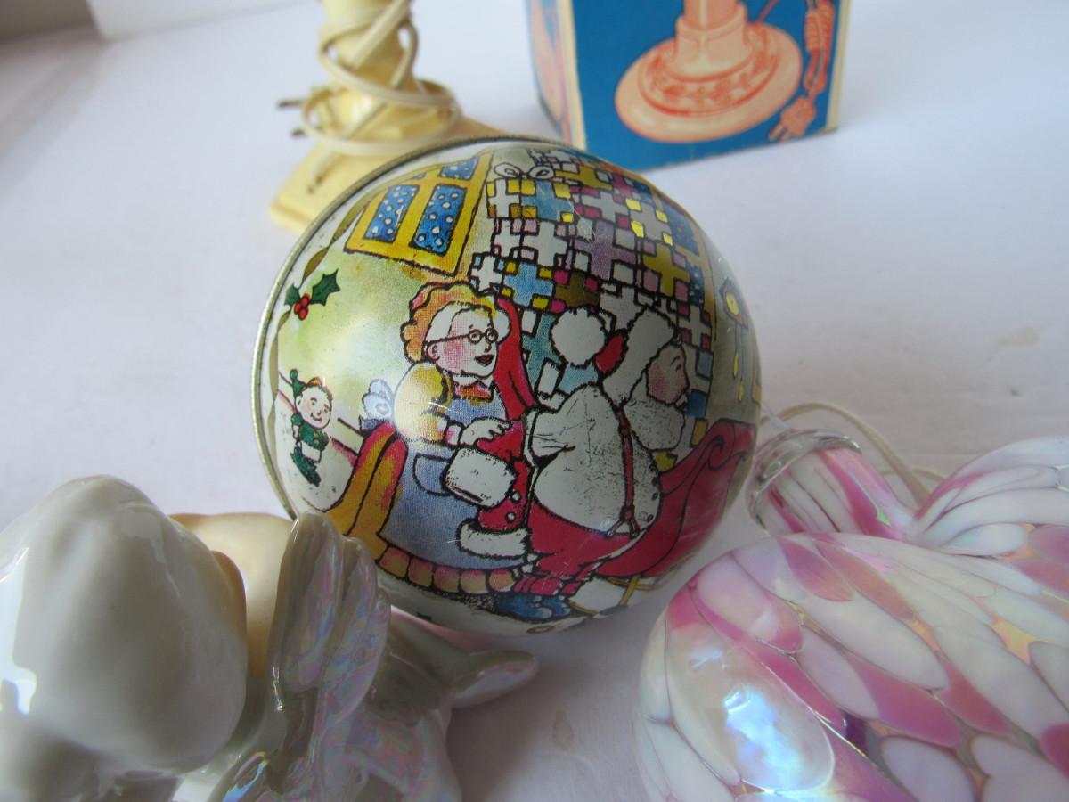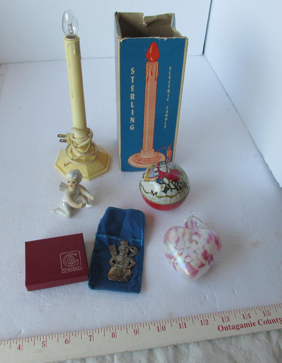 Nice lusterware candle climber, vintage plastic light works, Gorham silver plate snowman ornament is tarnished but nice, in box. Art glass heart ornament is good. Older tin candy box is a little worn but good. Shipping is available at actual shipping cost plus $5.00 handling fee per box for supplies/labor. See our terms for details. All sales are final. Condition notes may not be all inclusive, we may miss some issues as most vintage items are not in mint condition and have some degree of wear, paint loss, etc, but we always try to note obvious damage.