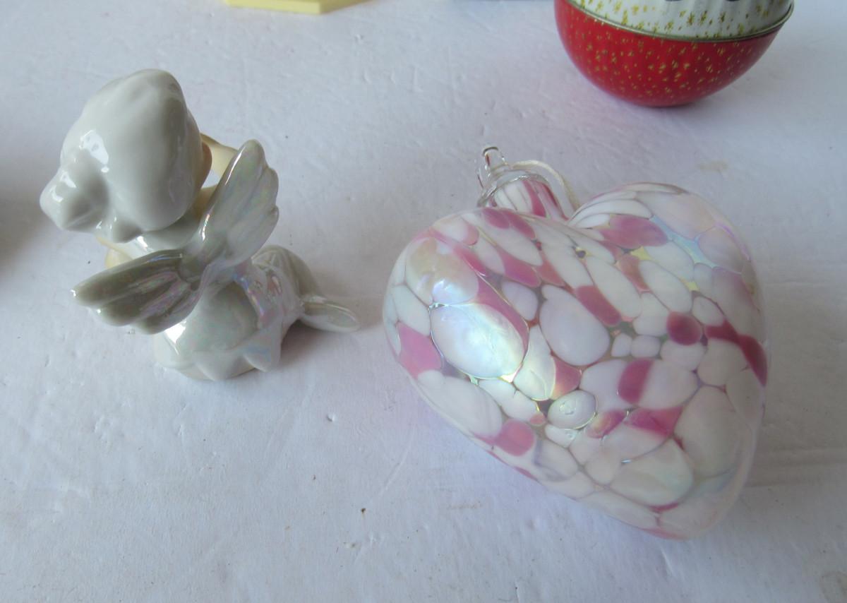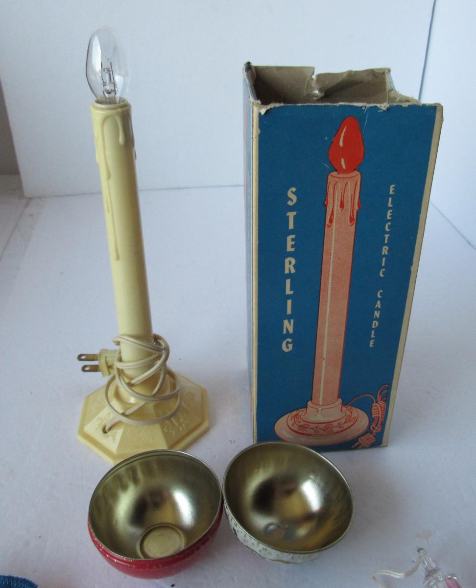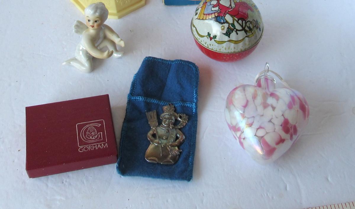 Nice lusterware candle climber, vintage plastic light works, Gorham silver plate snowman ornament is tarnished but nice, in box. Art glass heart ornament is good. Older tin candy box is a little worn but good. Shipping is available at actual shipping cost plus $5.00 handling fee per box for supplies/labor. See our terms for details. All sales are final. Condition notes may not be all inclusive, we may miss some issues as most vintage items are not in mint condition and have some degree of wear, paint loss, etc, but we always try to note obvious damage.
