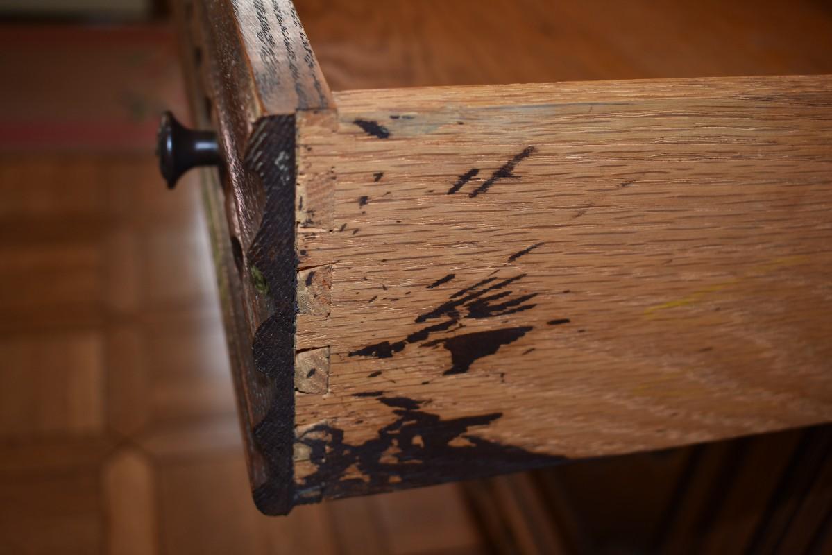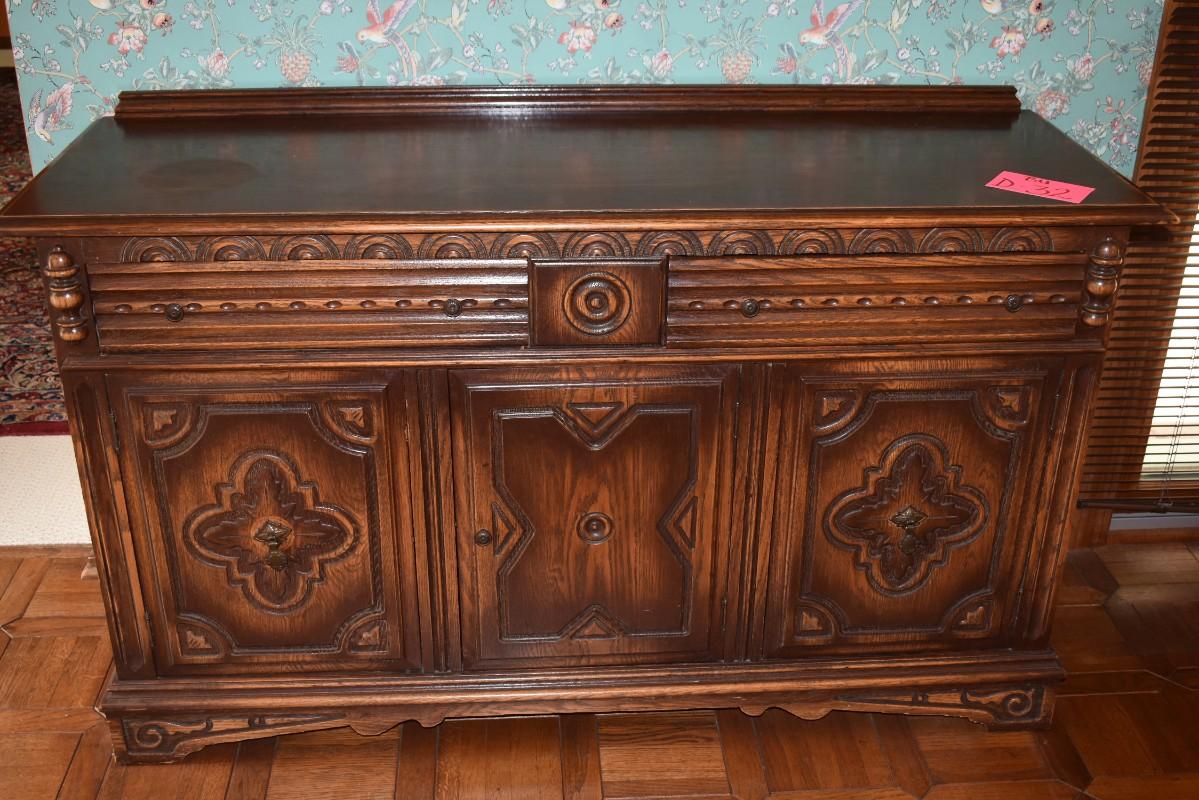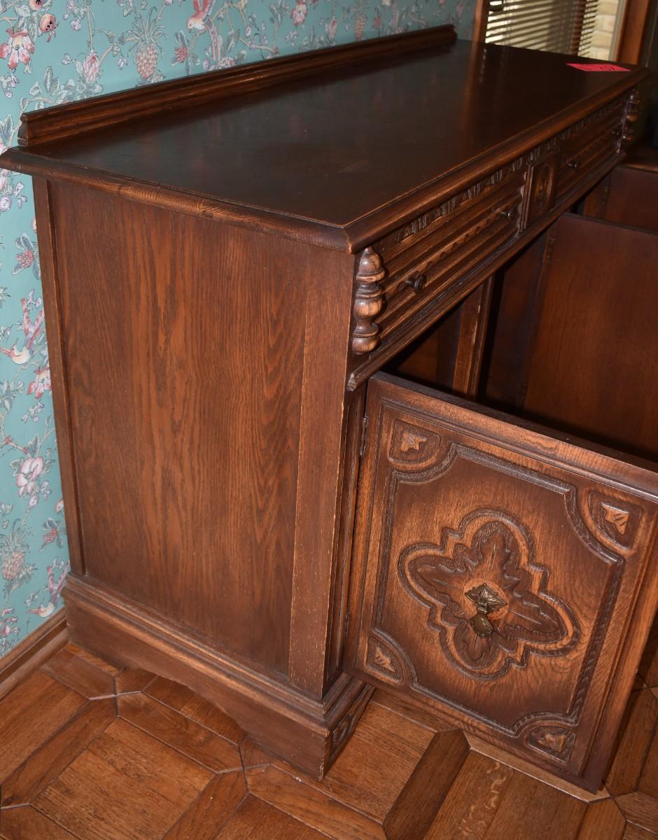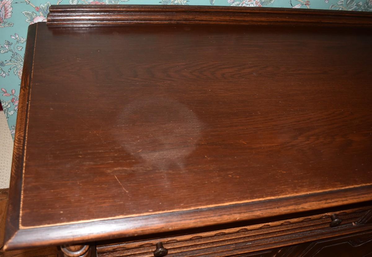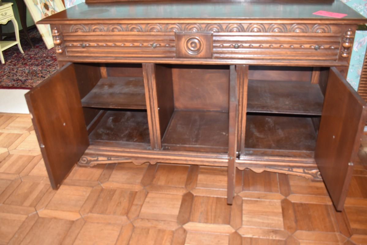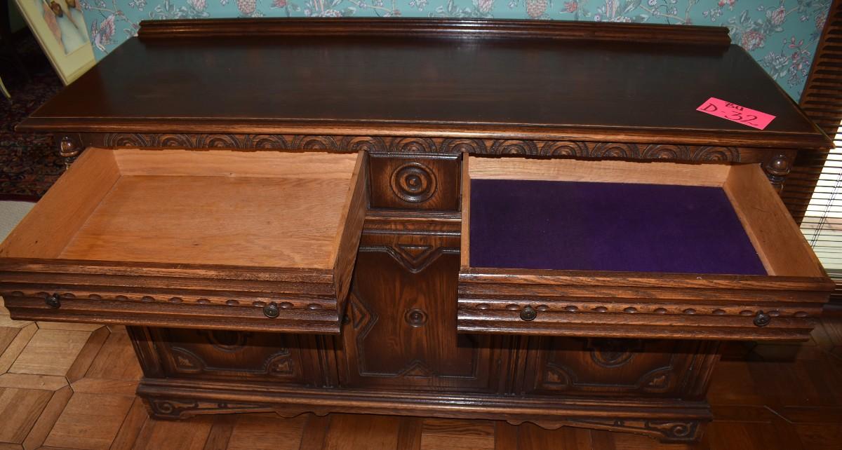 This buffet is one that compliments the dining set nicely. It is solid wood, and in great shape. The top shows some common wear on the edges in the form of finish being worn. The left side of the top does have a moisture ring on it that can easily be remedied by someone who would want to delve into a refinishing project. This is a very nice, ornate piece.