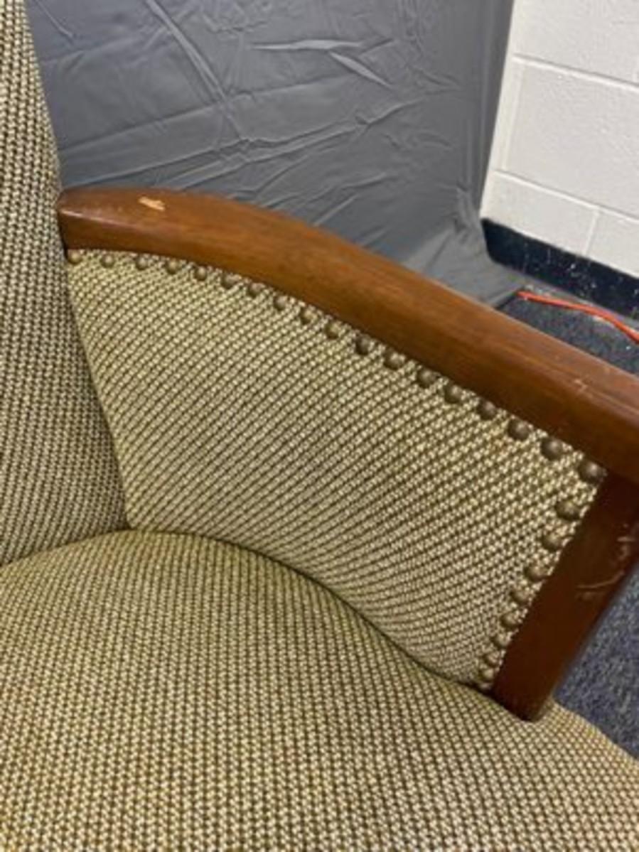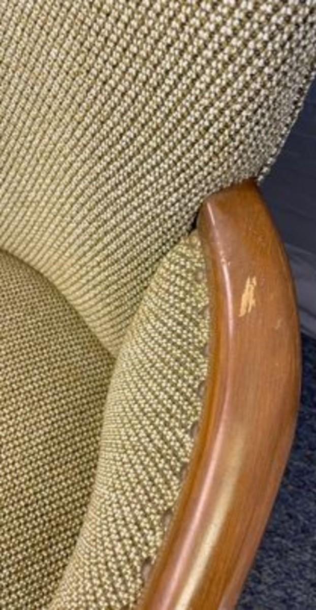 No stains, rips, tears, or other flaws to the fabric. There is a small area on the left armrest that could use a little touchup with a stain pen.