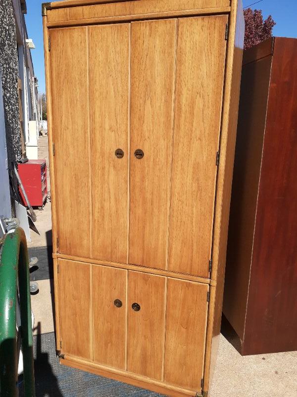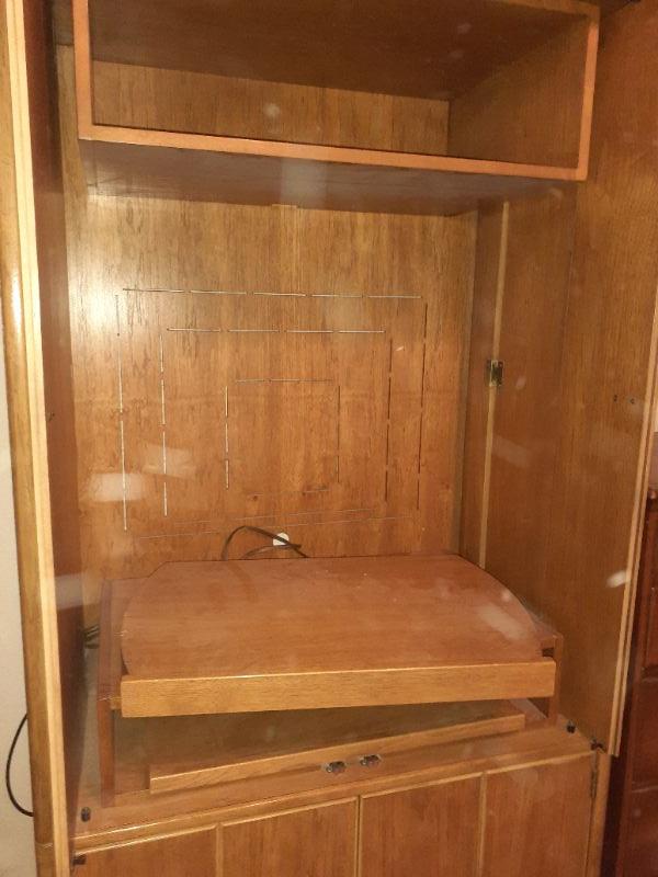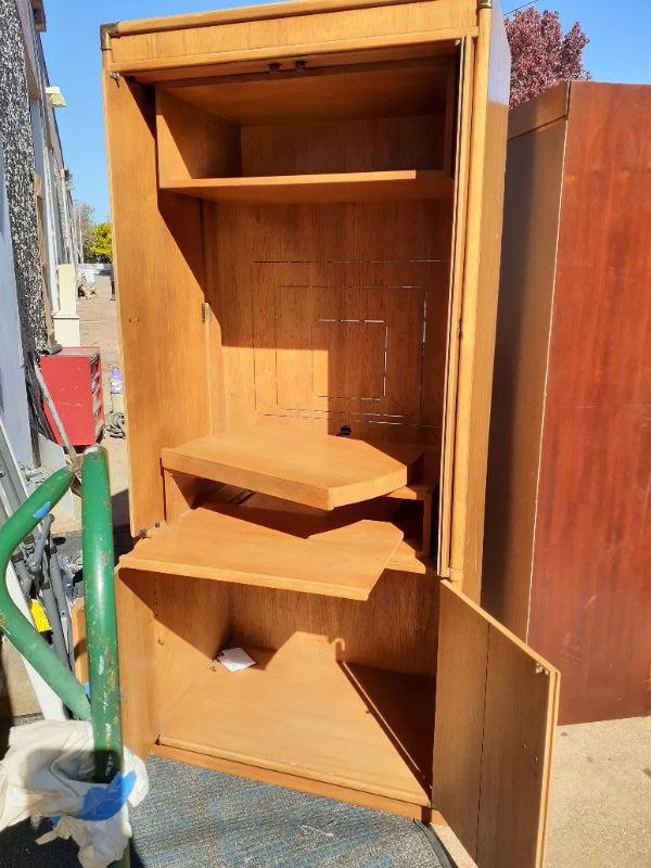 NICE MID CENTURY STYLE MEDIA CABINET IN GREAT CONDITION, HAS FOLD IN DOORS, AND SWIVEL PULL OUT FOR TV