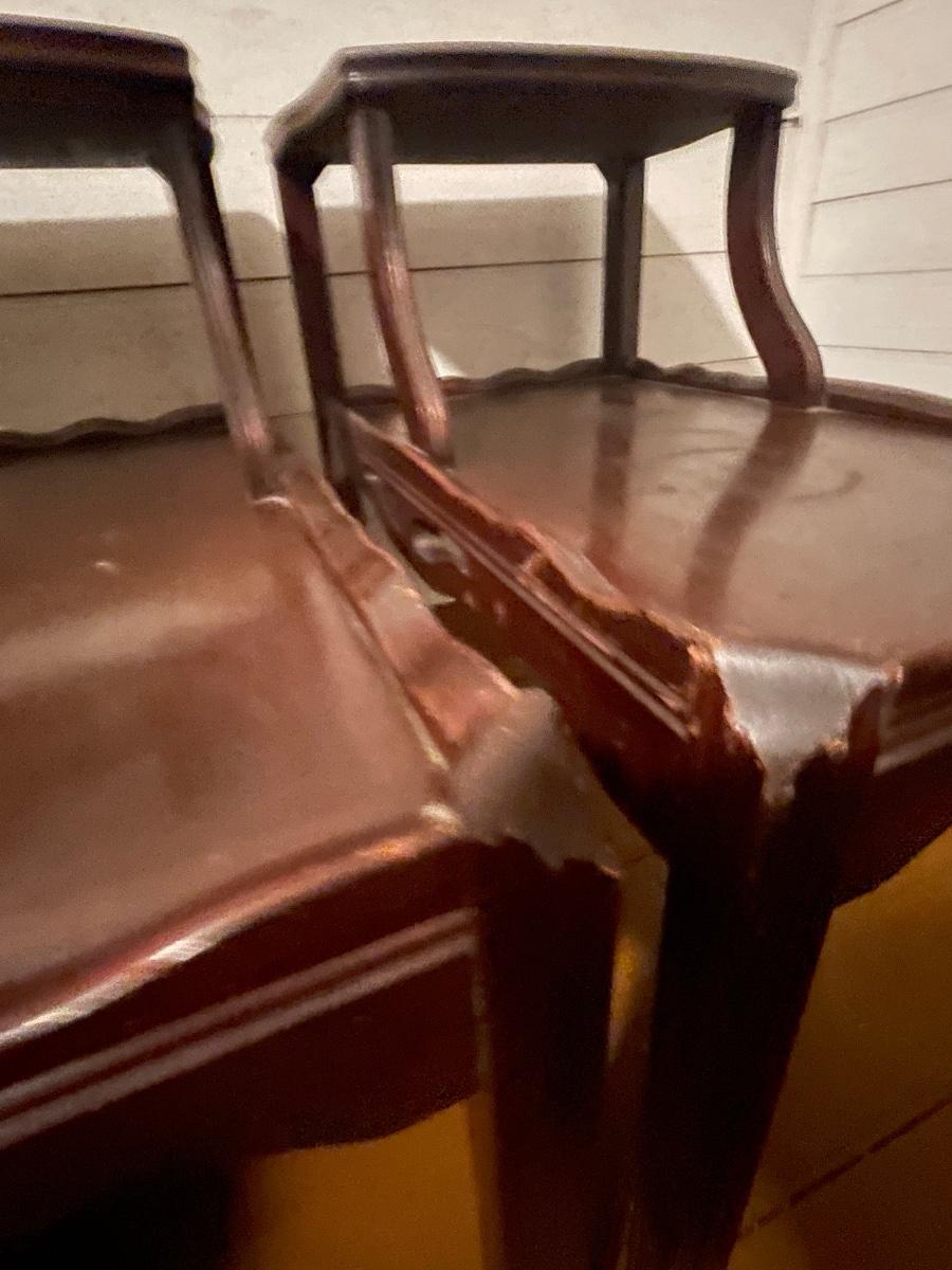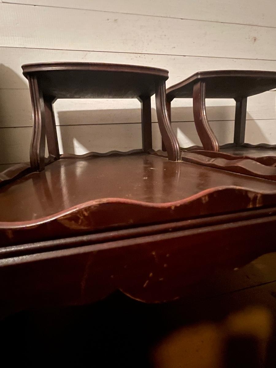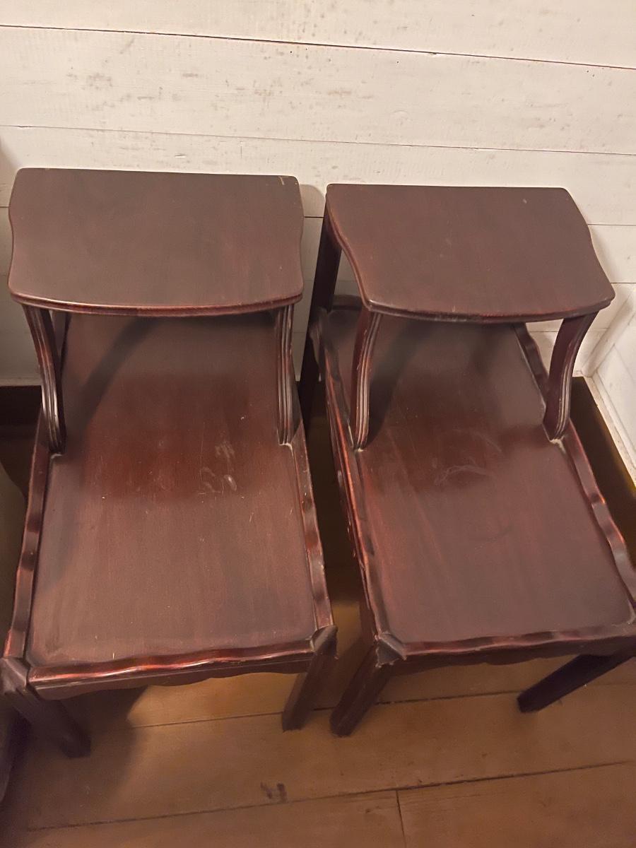 Good solid wood tables. Scratches and scuffs present. Nice curve to the tops. Perfect for a freshen up! Nice set!