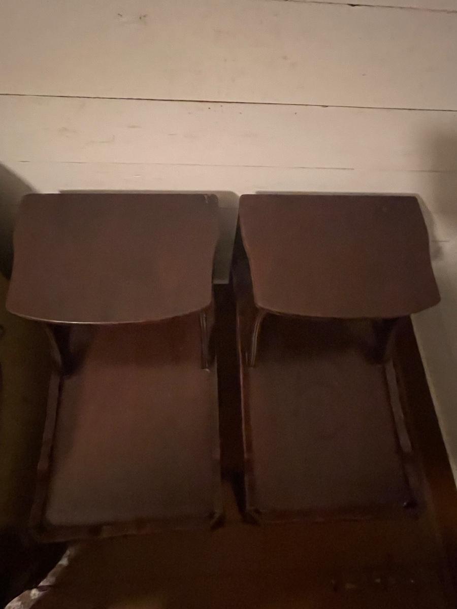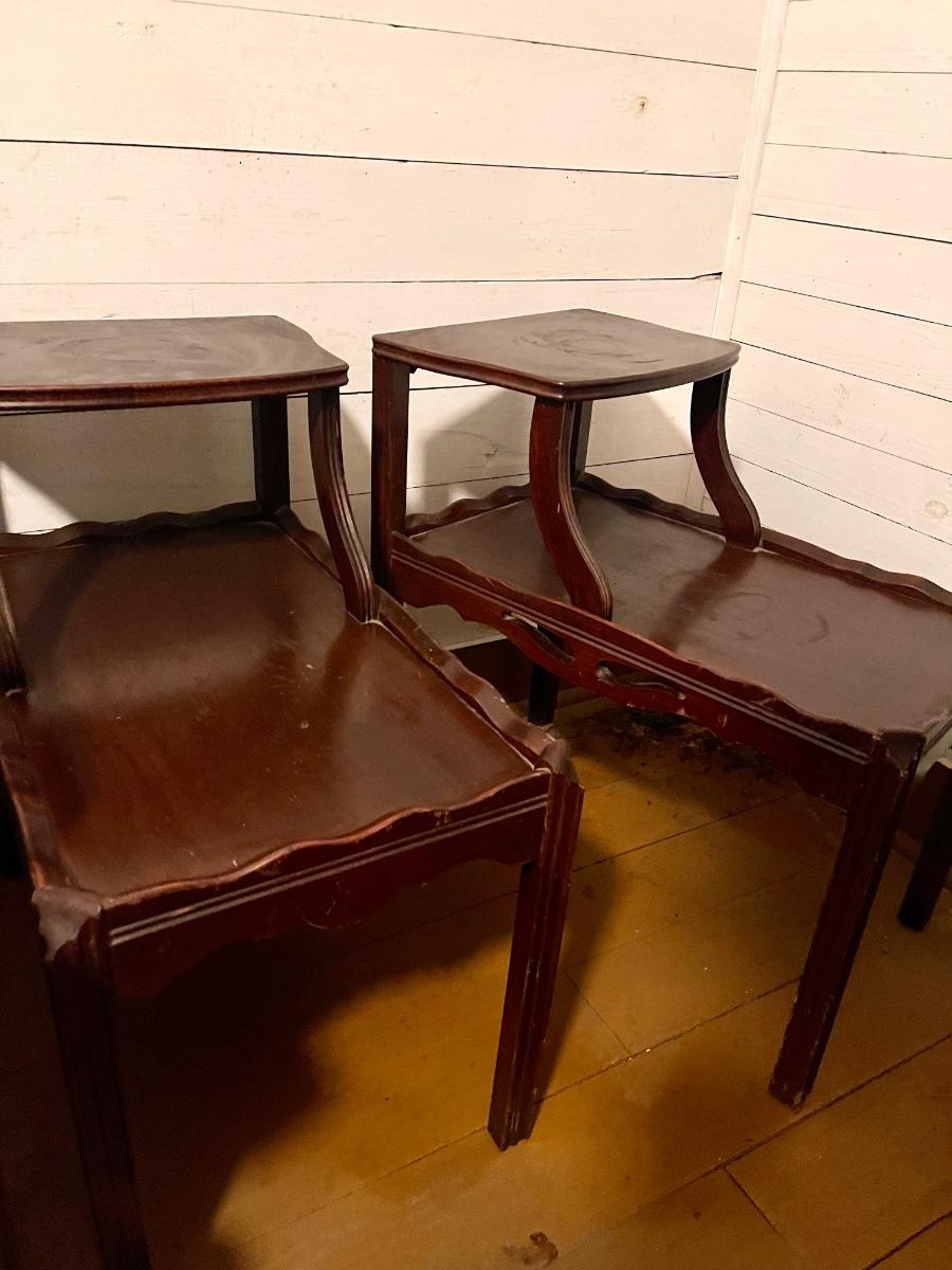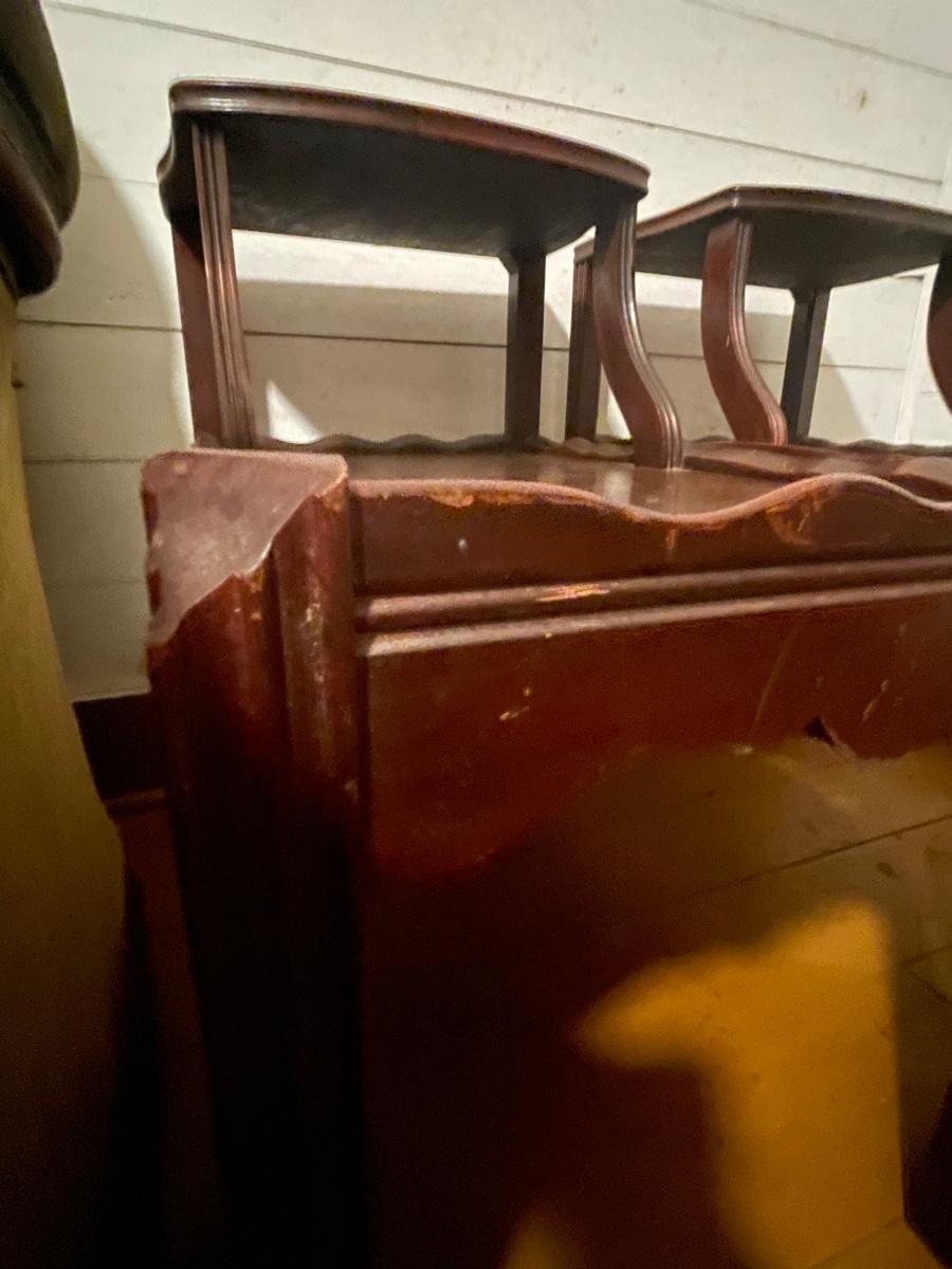 Good solid wood tables. Scratches and scuffs present. Nice curve to the tops. Perfect for a freshen up! Nice set!
