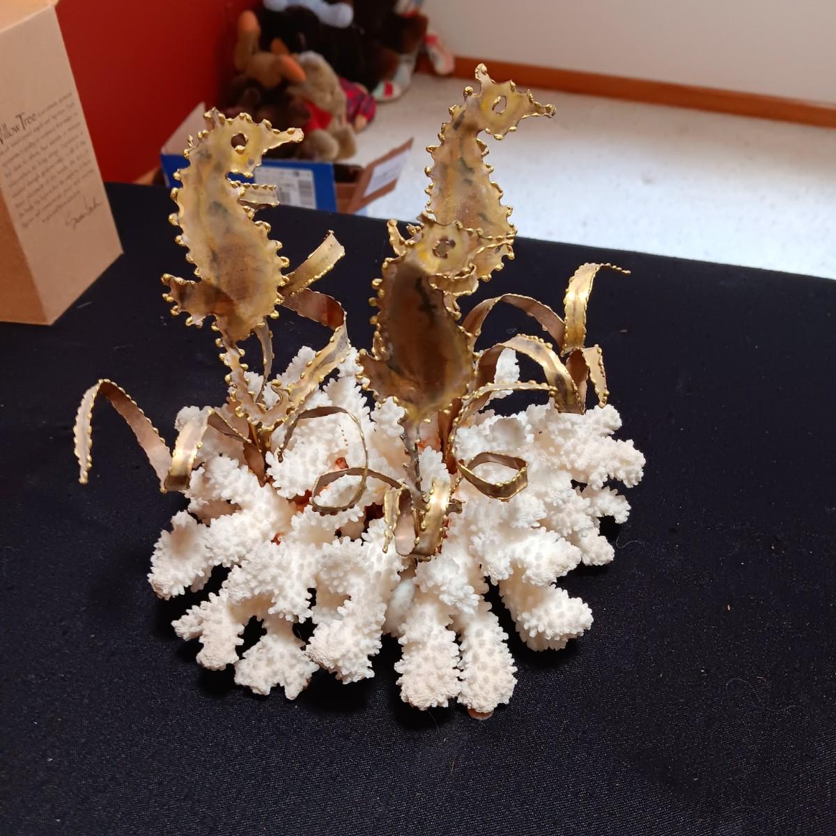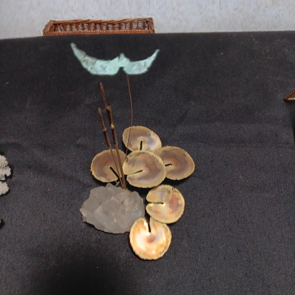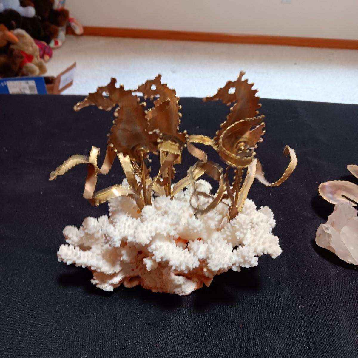 NICE PIECE OF CORAL WITH TIN SEAHORSES AND A CRYSTAL AMONG TIN LILY PADS AND A FLYING BIRD