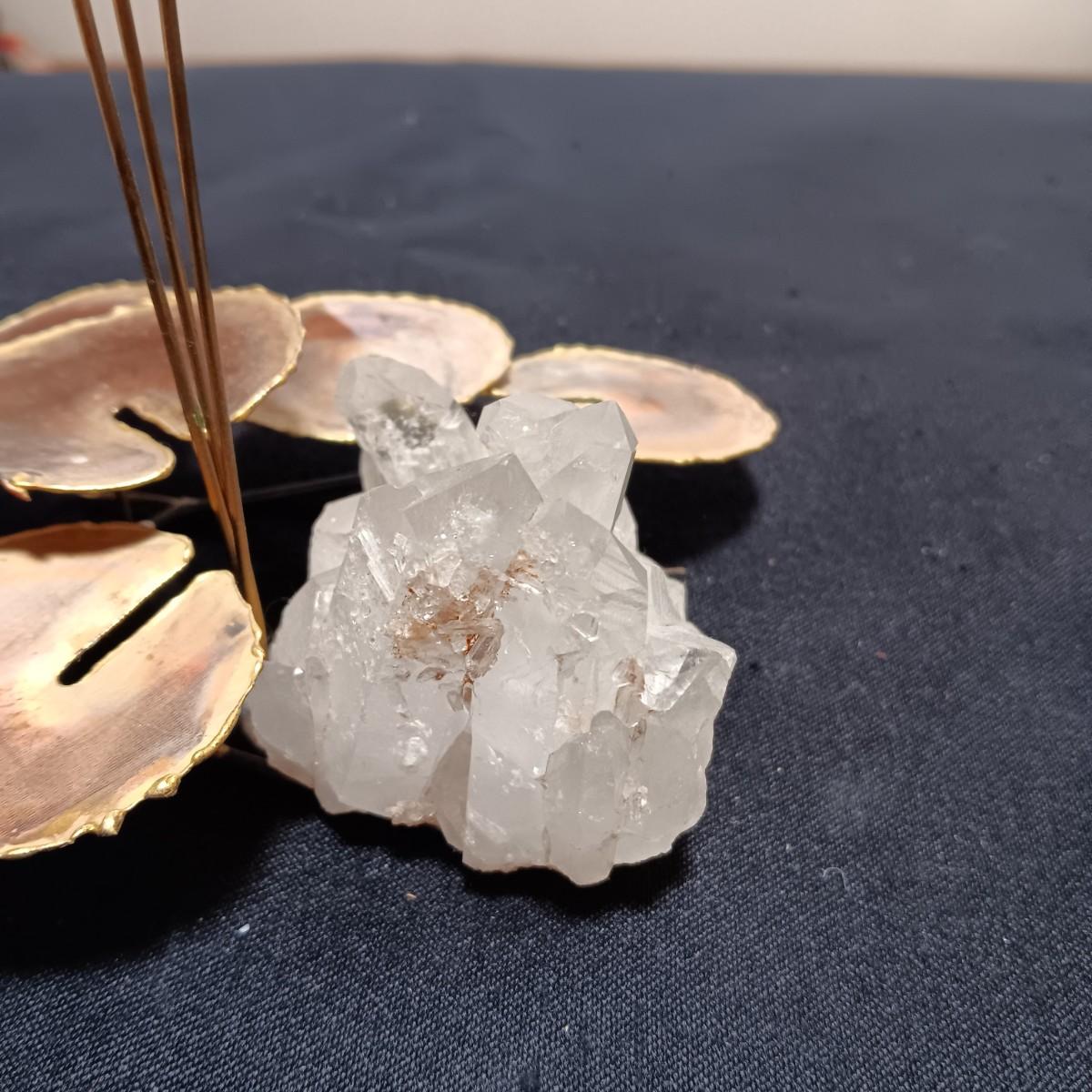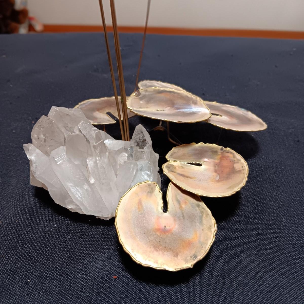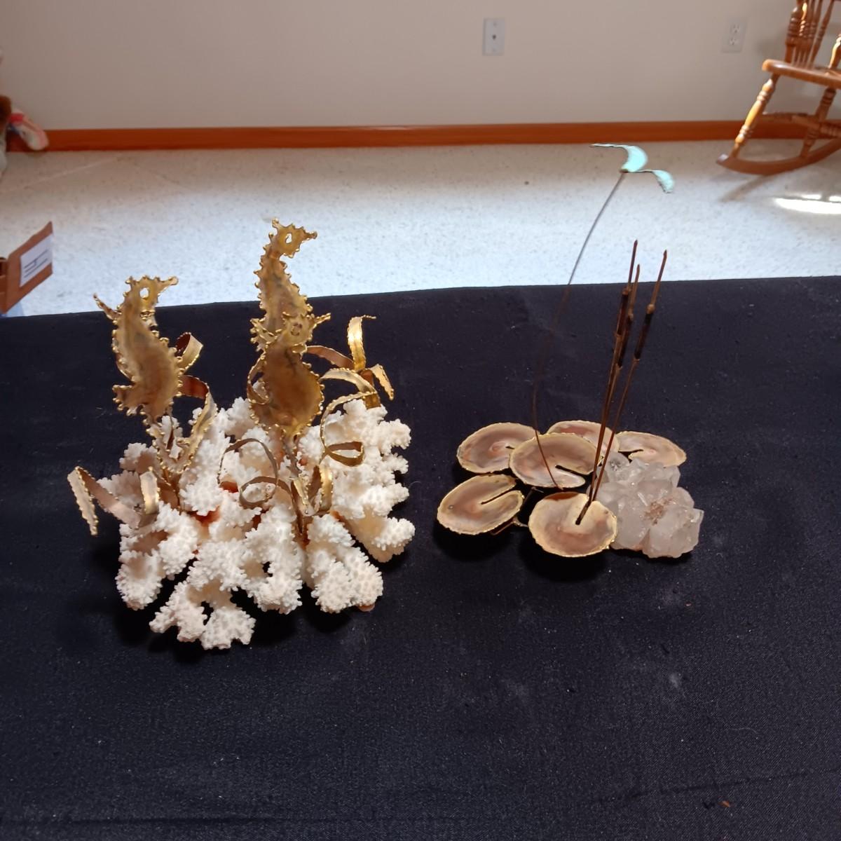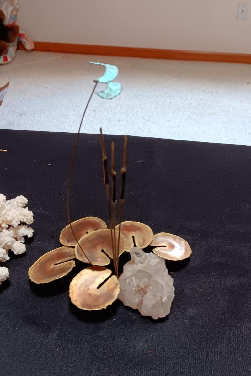 NICE PIECE OF CORAL WITH TIN SEAHORSES AND A CRYSTAL AMONG TIN LILY PADS AND A FLYING BIRD