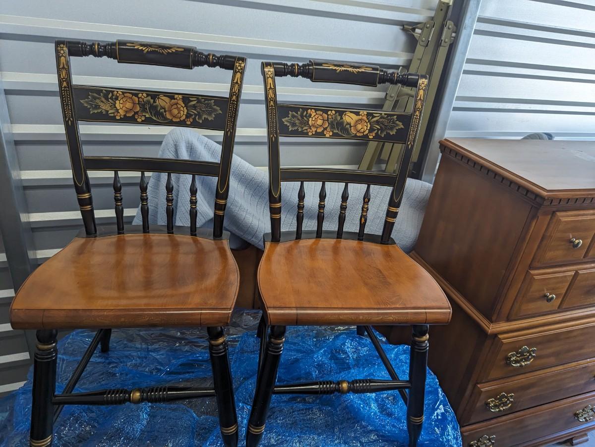 Nice American Folk Style L Hitchcock table and chairs with floral stenciled decoration. In excellent shape.
