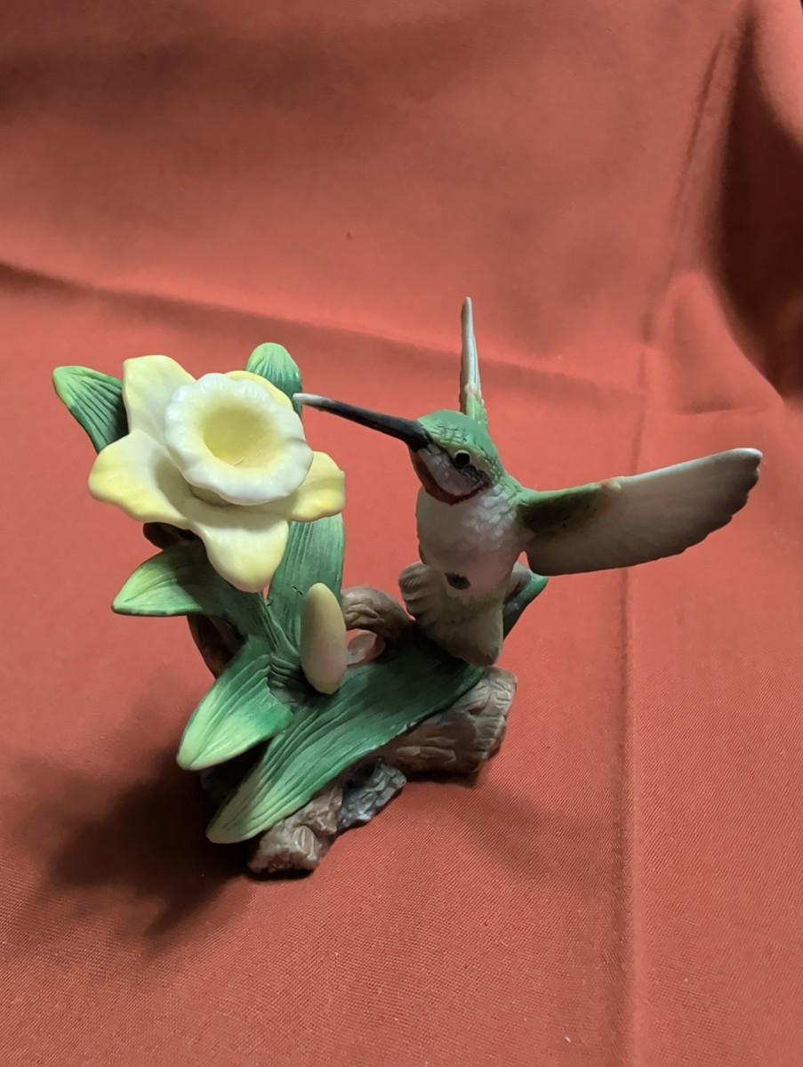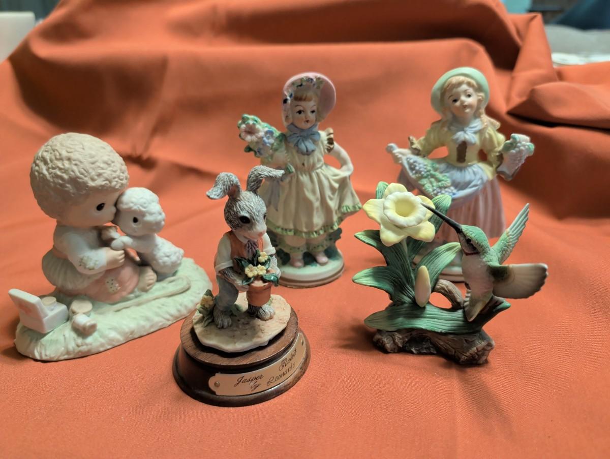 Two vintage porcelain Victorian lady figurines, 1976 precious moments, a little girl and a lamb 1989 Jasper rabbit, figurine and a resin hummingbird and a yellow flower figurine. Well come on