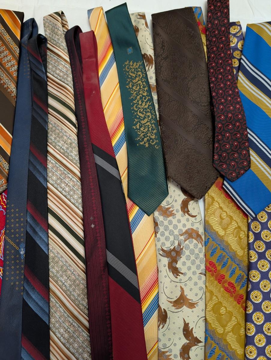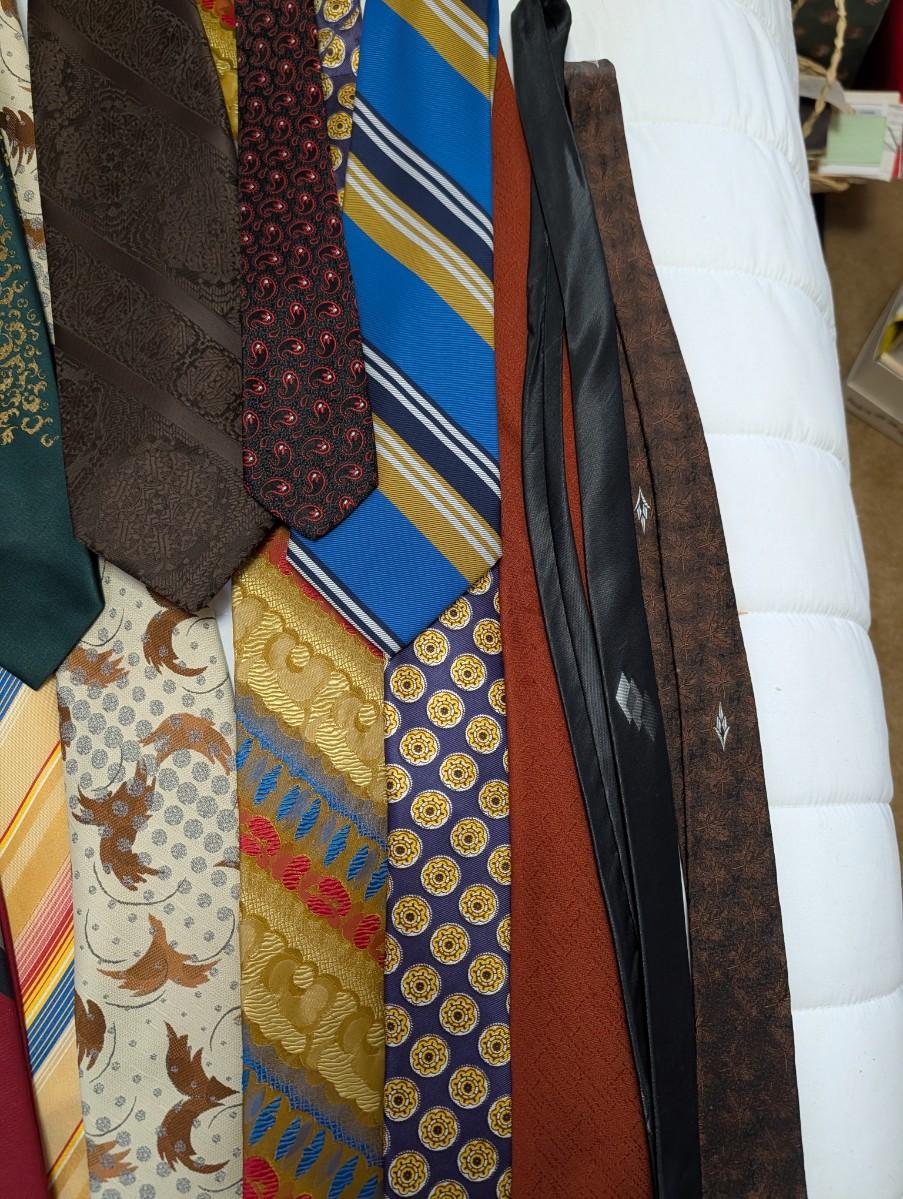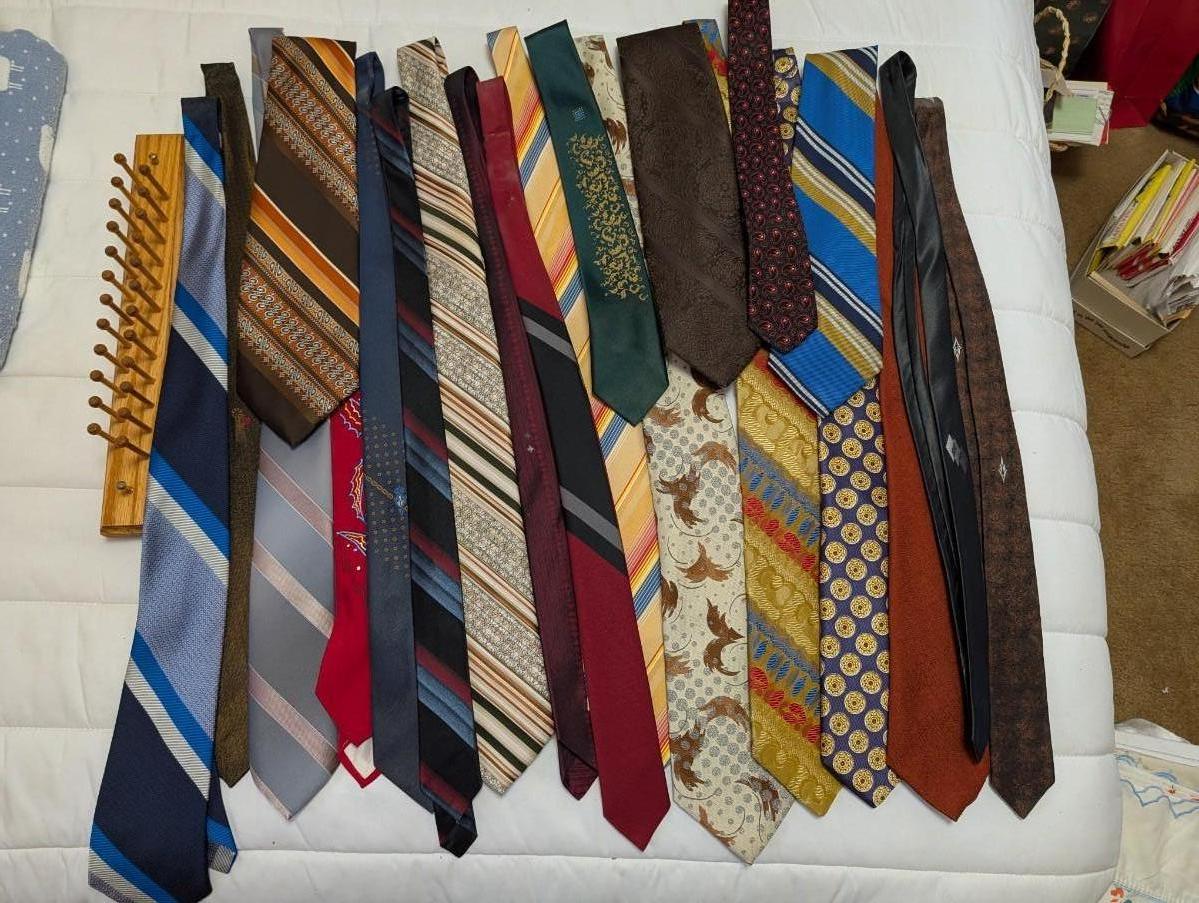 A nice selection of colorful men's tie, a great variety of types and colors. Wooden tie hanger.