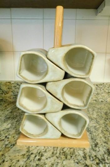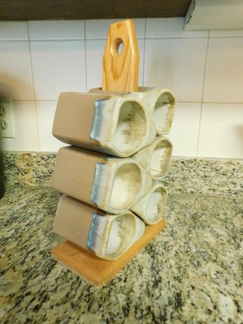 Nice Set of Heavy Pottery Drinking Mugs with Wood Holder
