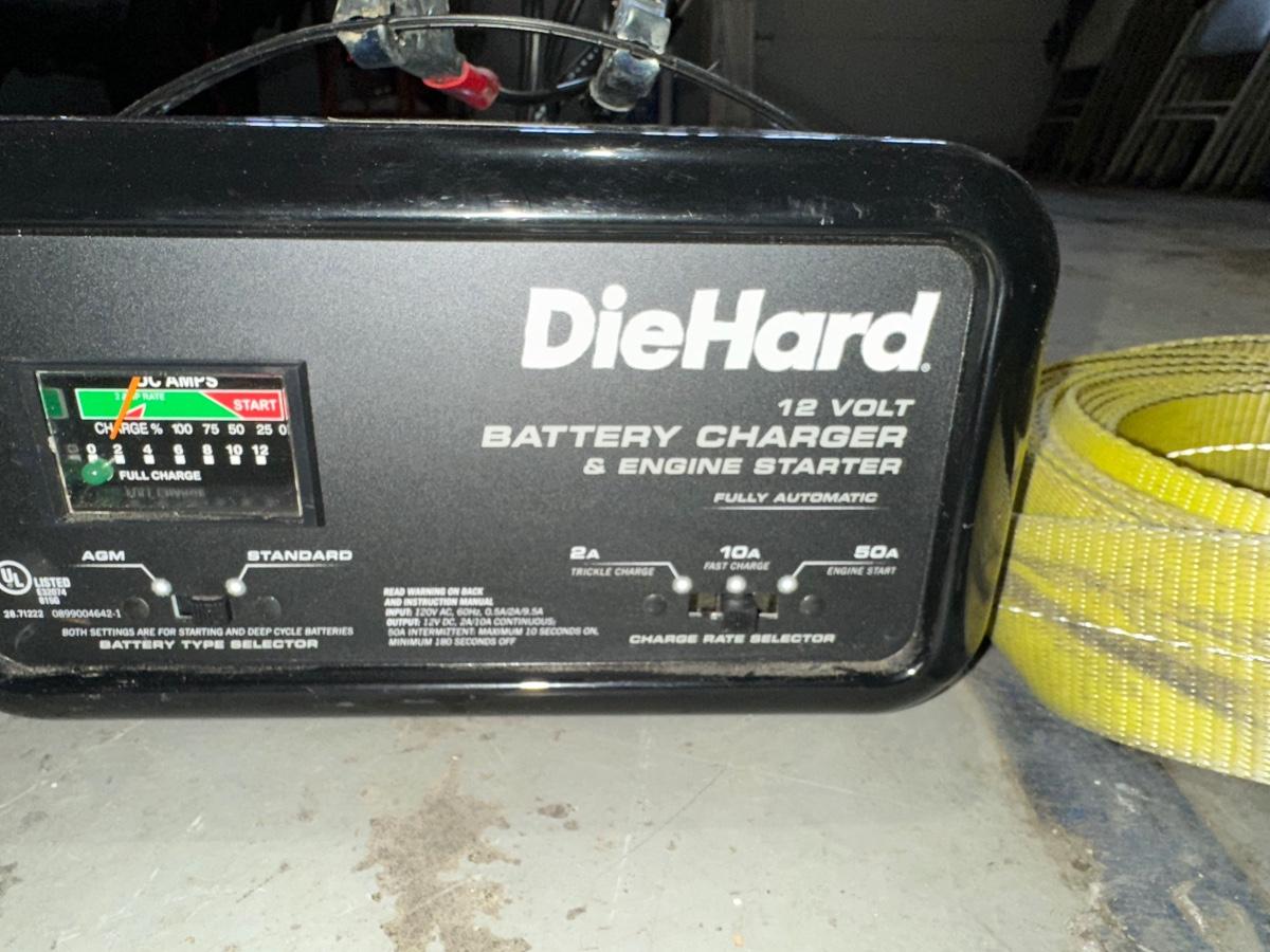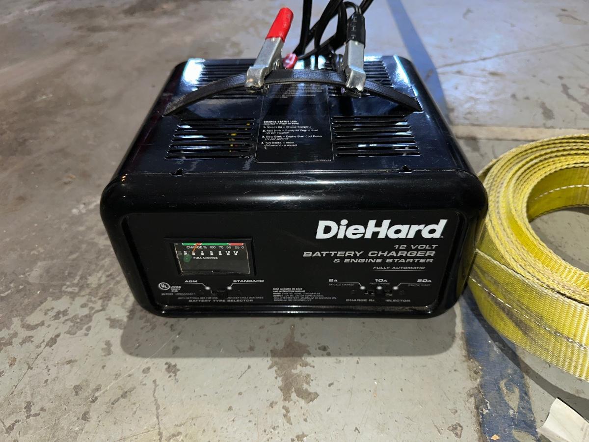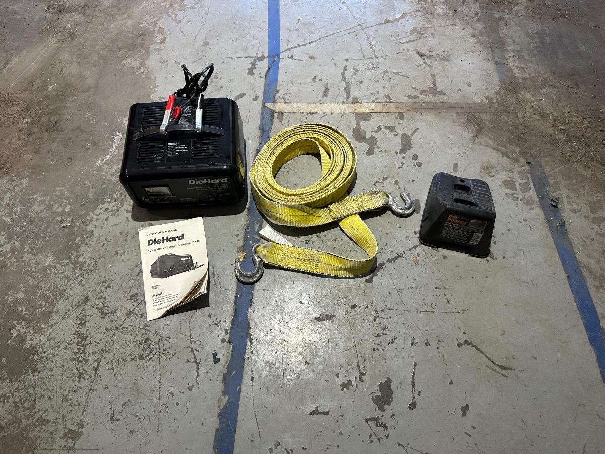 NICE TOW ROPE, DIEHARD BATTERY CHARGER AND WHEEL CHOCK