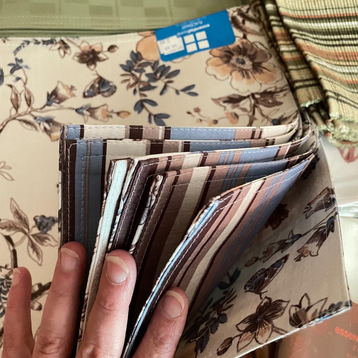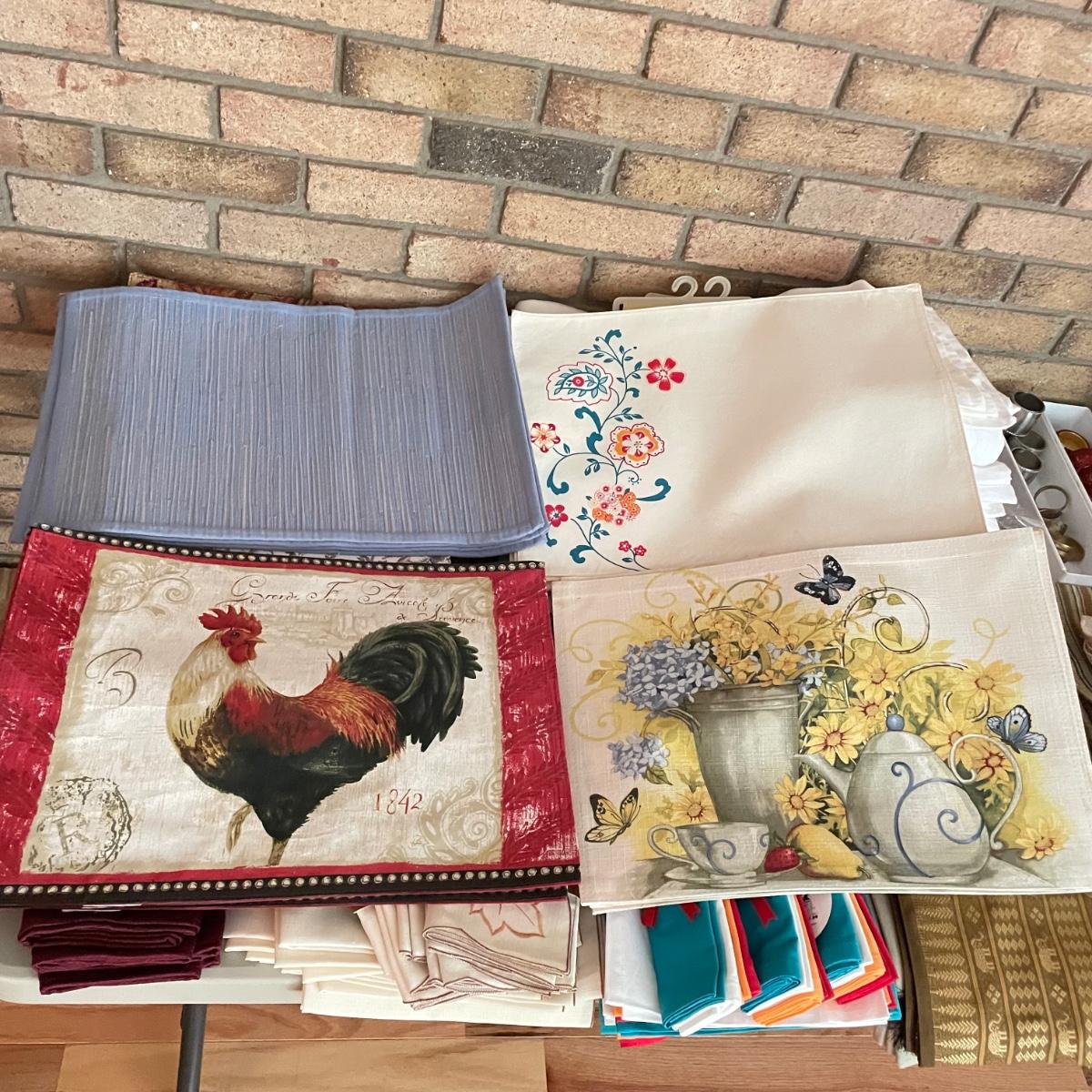 A nice selection of placemats, cloth napkins, napkin holders with a couple table cloths and an elephant embellished table runner. Of the placemats- 11 designs are in sets of four, three sets are of a larger quantity see photos showing quantities by lifting the corners. Lot also includes a variety of napkins, the largest sets are in 12 red and 50 in white (40 have slim hems, 10 have larger hems). See images. Shipping available.