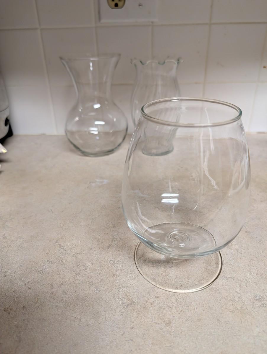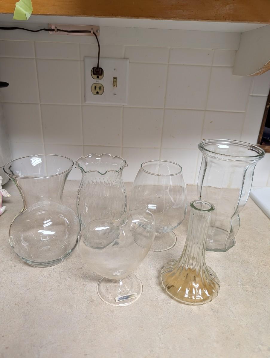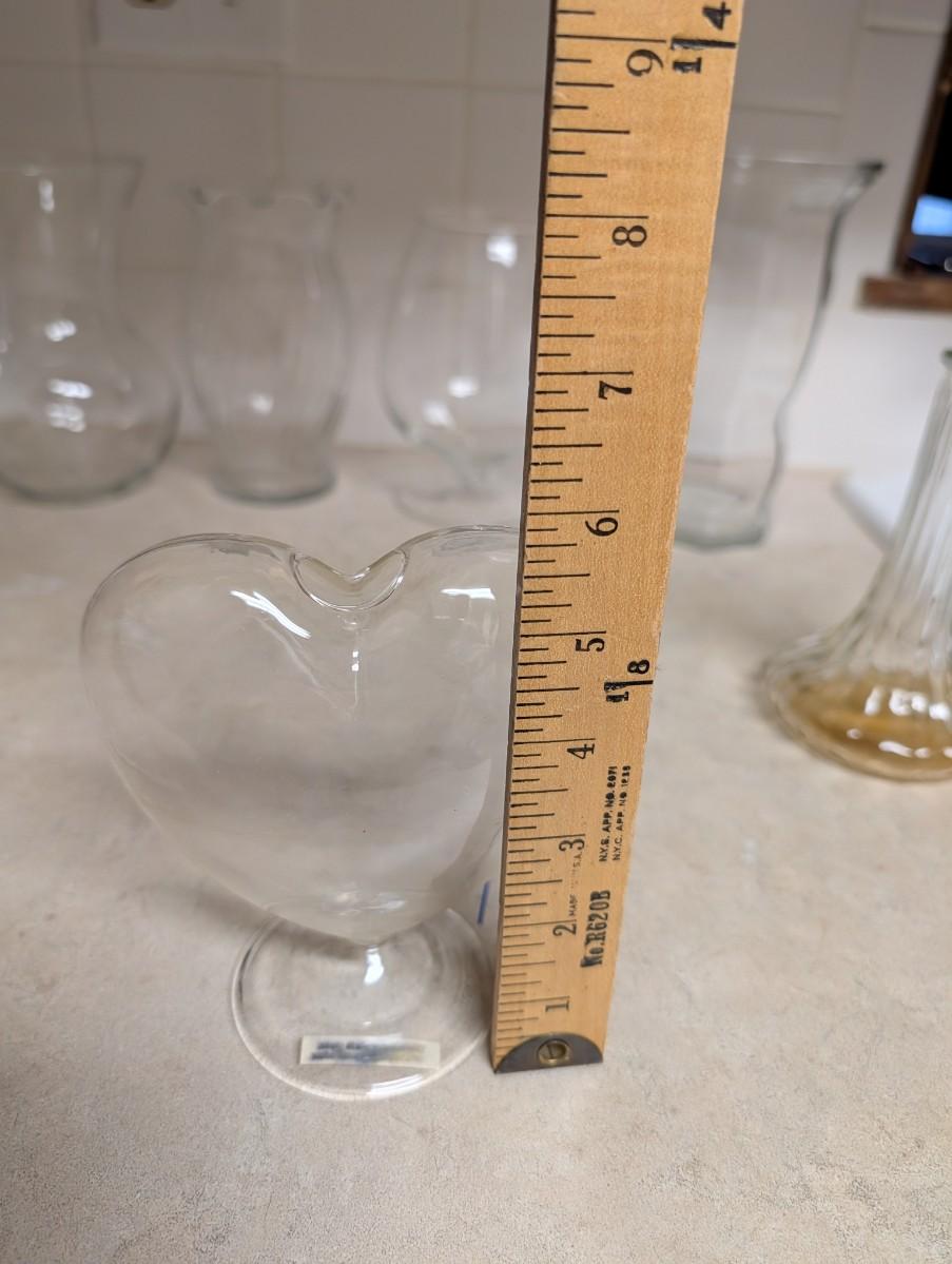 Vintage vertical rib clear wide base vase, clear heart shaped vase, octagon base clear glass, brandy glass style clear glass vase, vintage clear glass vertical twist ruffle top vase, urn style clear glass vase.