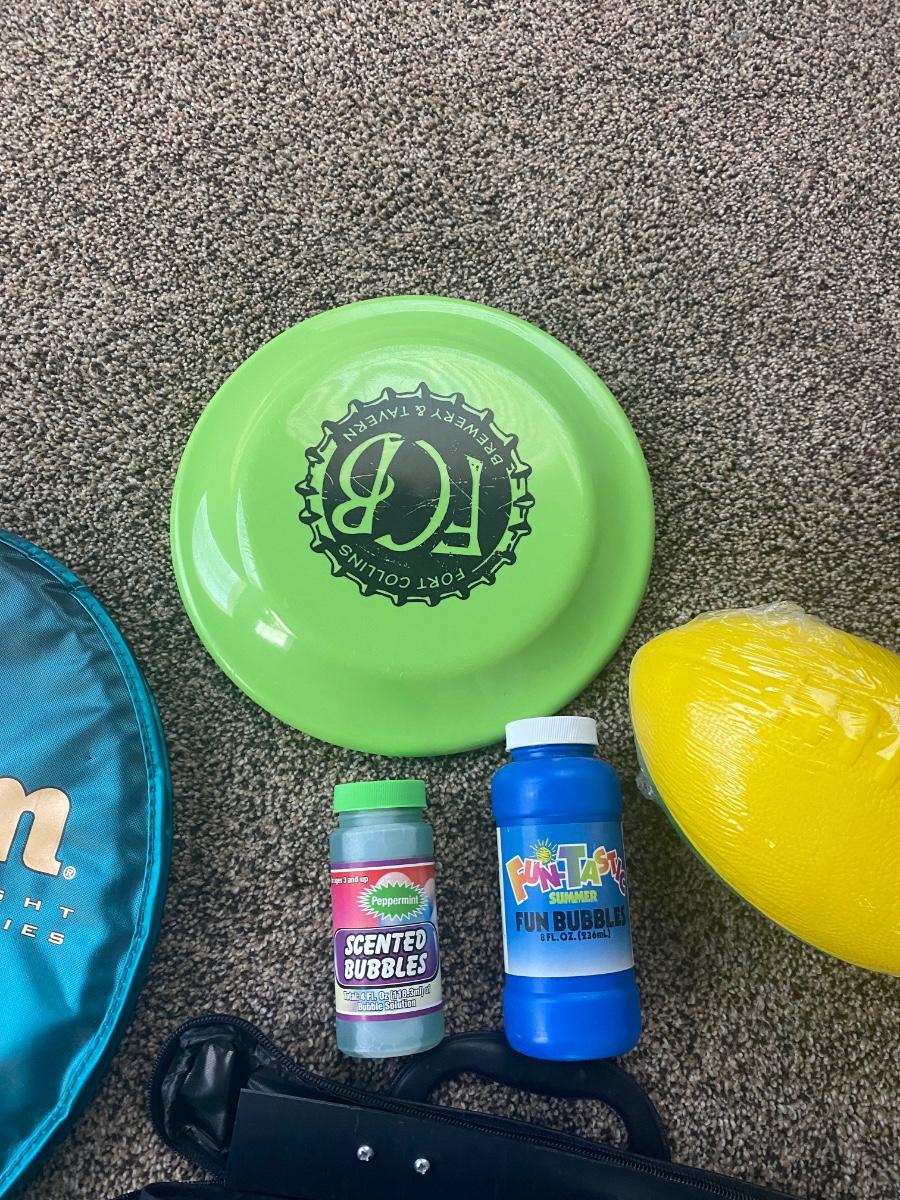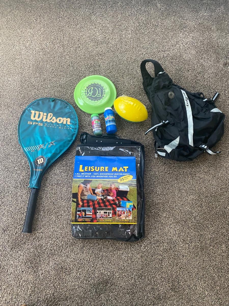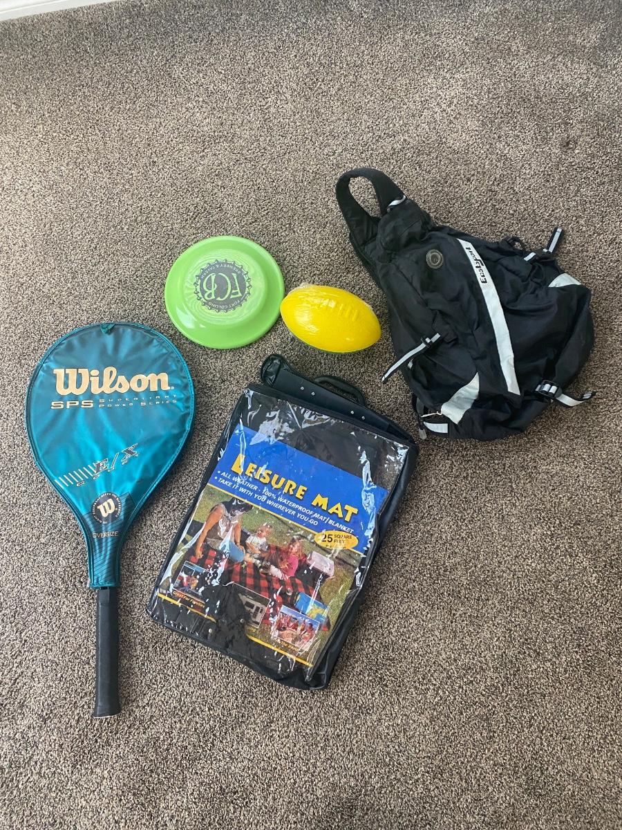 NICE WILSON OVERSIZED TENNIS RACKET, LEISURE MAT, EAST SPORT BACKPACK, FRISBEE AND FOAM FOOTBALL