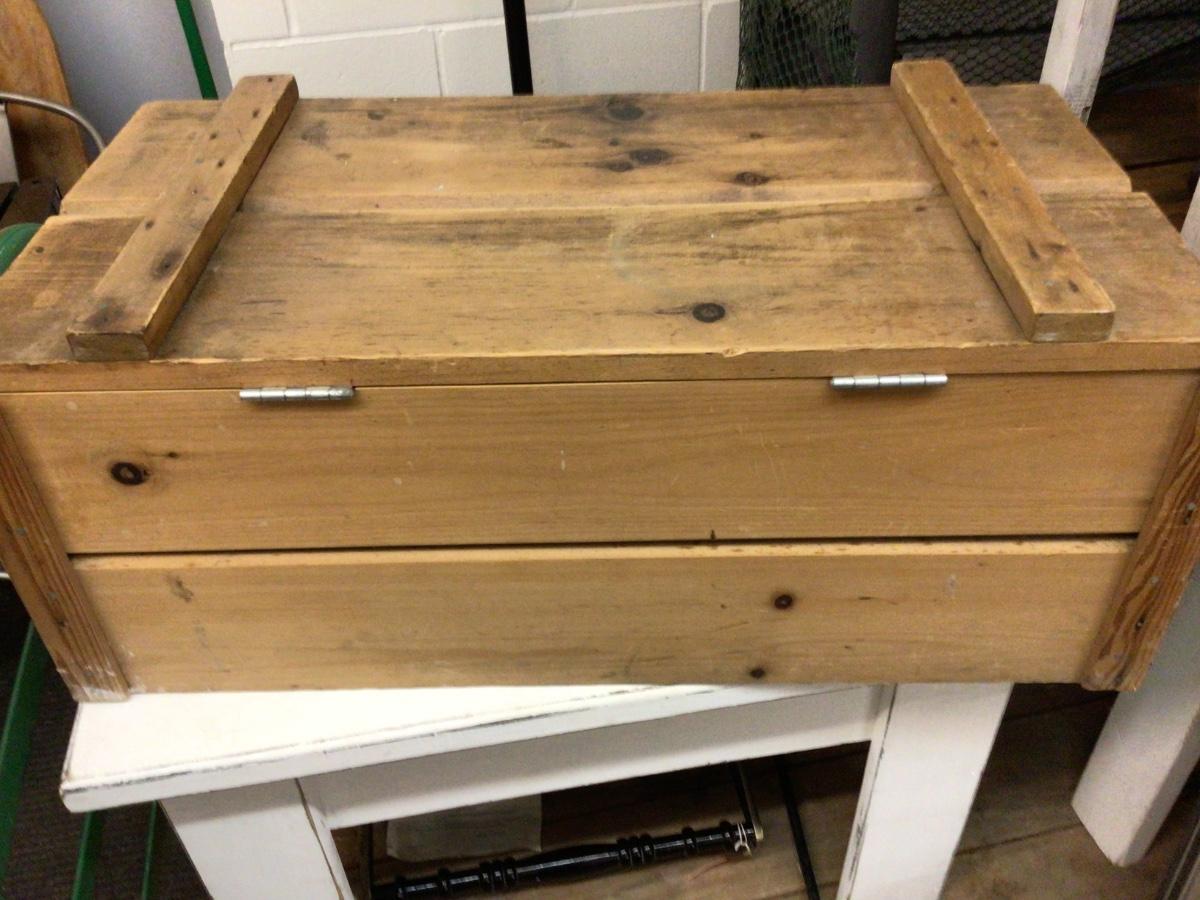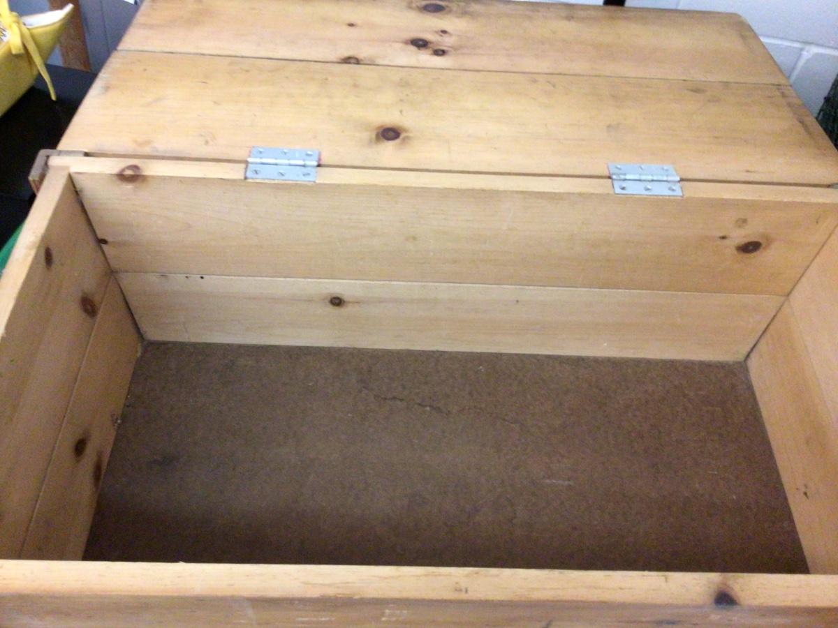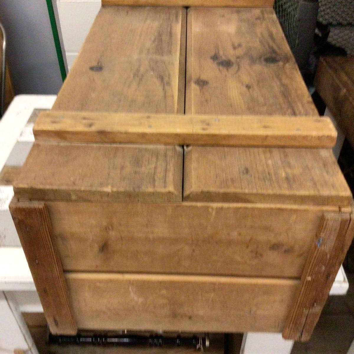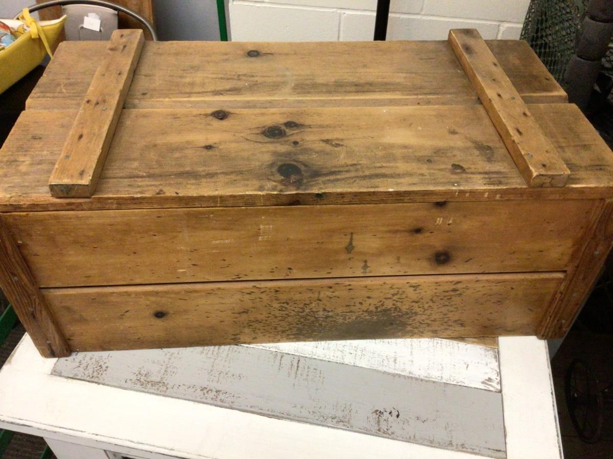 This is a great wood trunk or toy box. The lid has hinges to open the top for storeage of blanks, quilts, shoes, toy or what you need storing.
