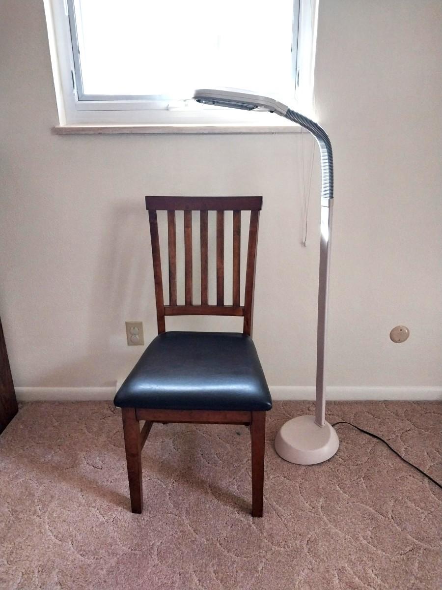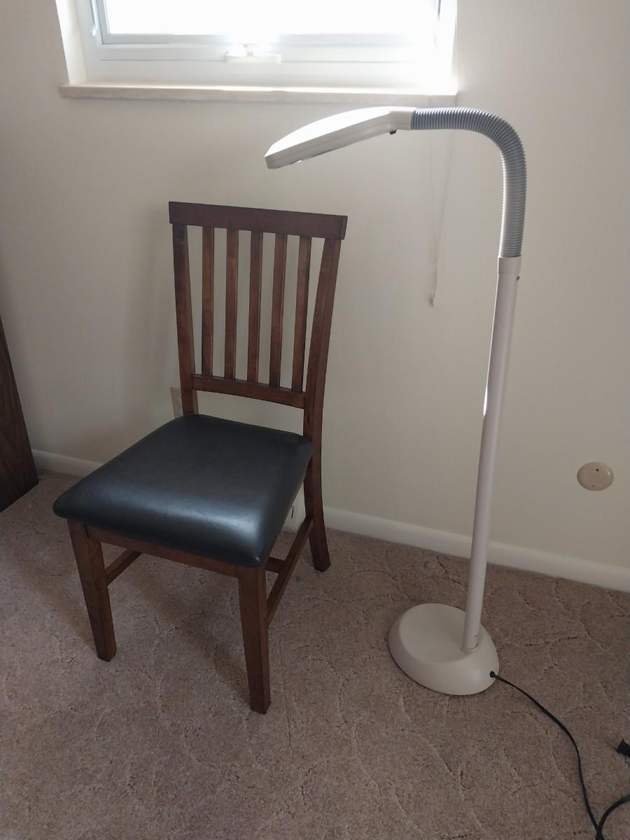 NICE WOODEN CHAIR WITH PADDED SEAT AND ADJUSTIBLE FLOOR LAMP