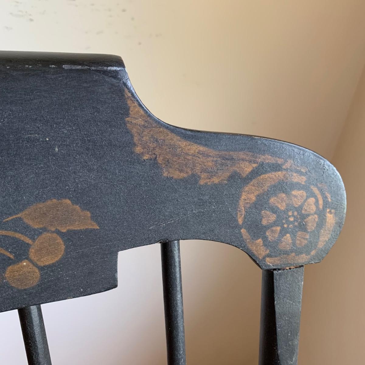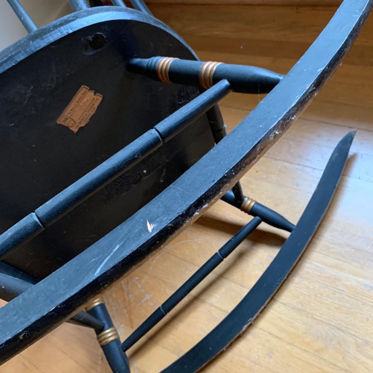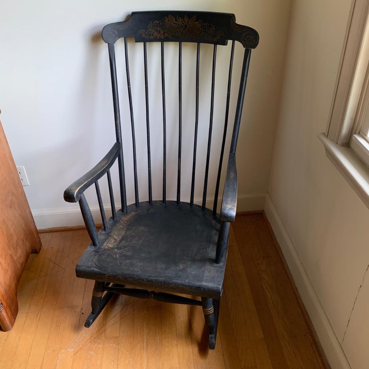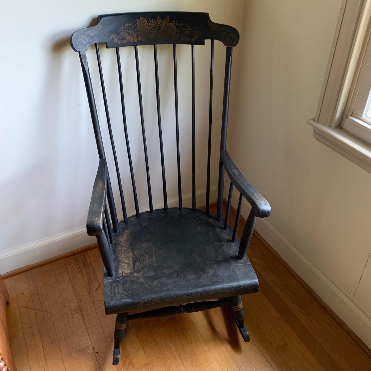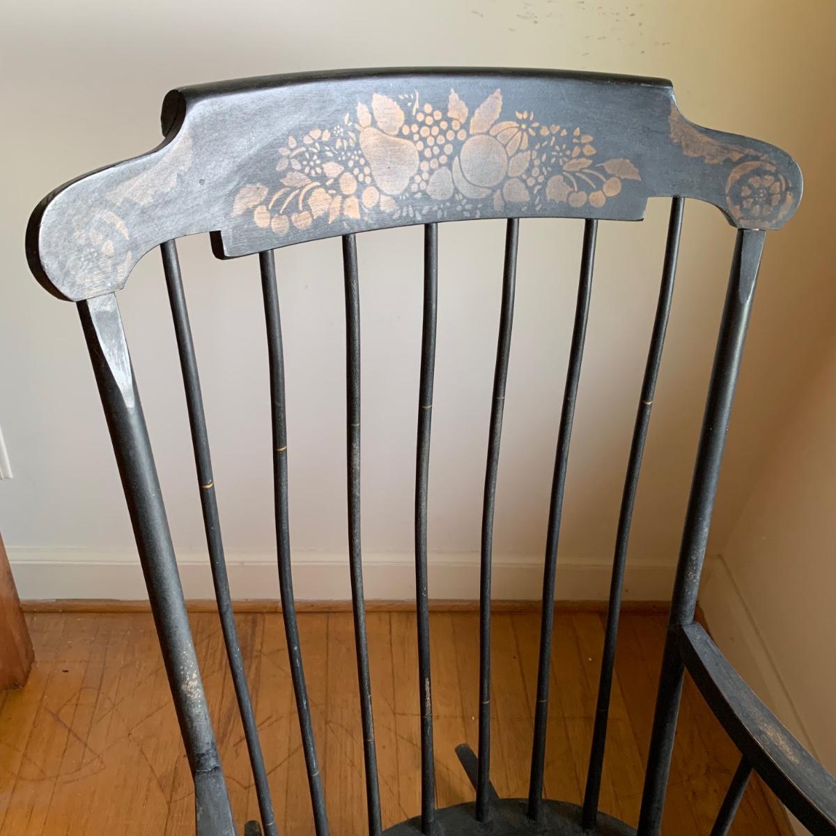 Wood rocking chair from Nichols & Stone Co. It has a distressed black finish and is decorated with a stenciled fruit motif. Structurally the chair is in very good condition. Superficially its finish shows some wear and the fruit motif appears to be a bit faded. The chair measures 23” x 29” x 42.5” with a seat height of 14”. Local pickup only.