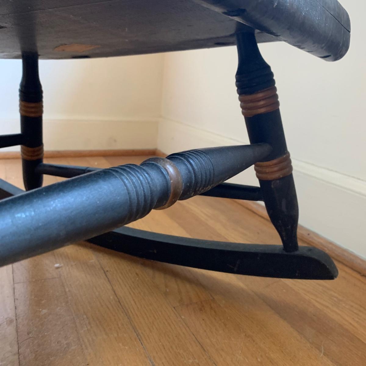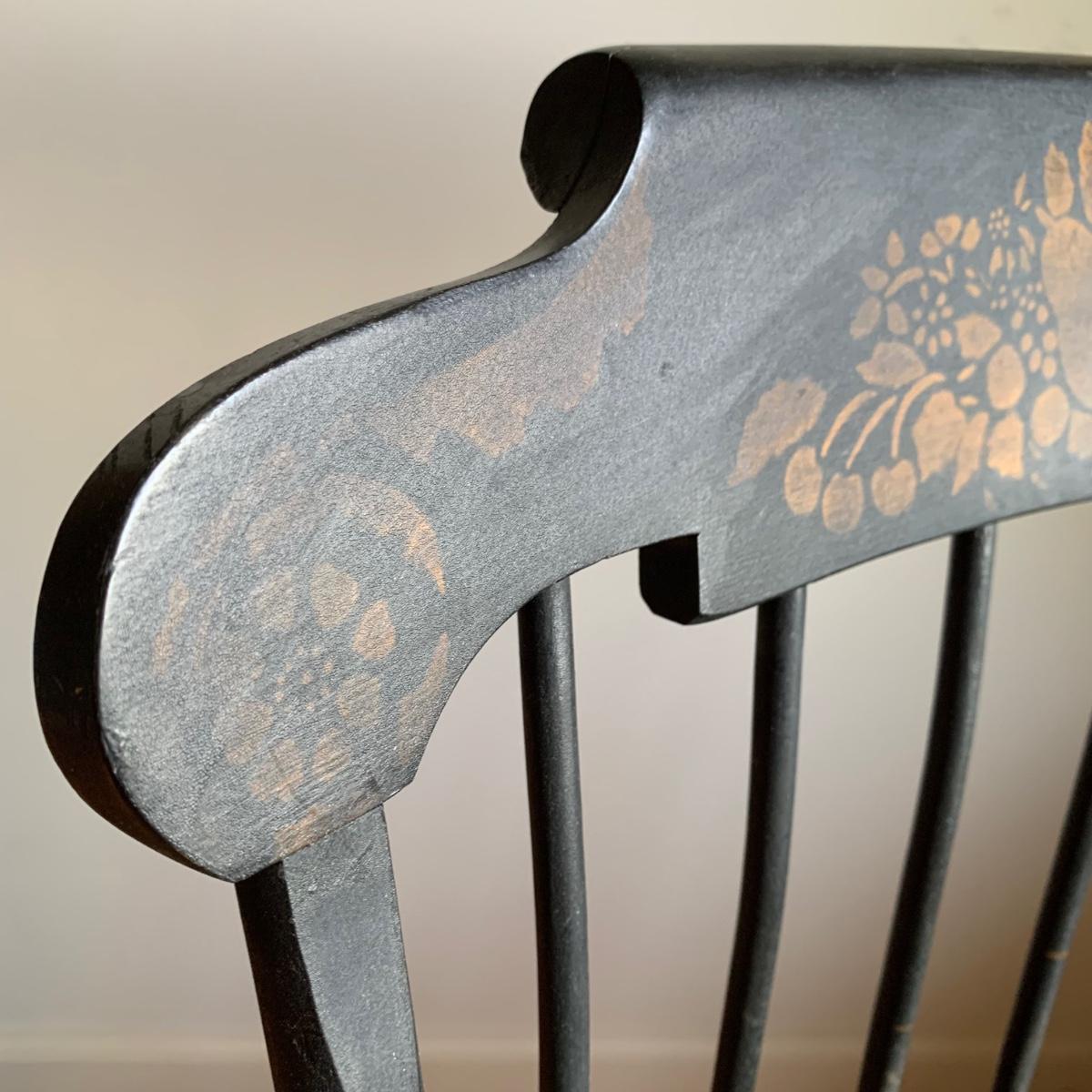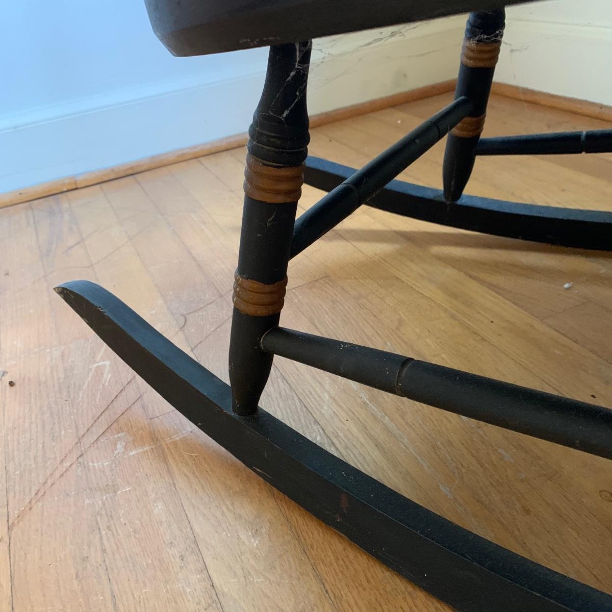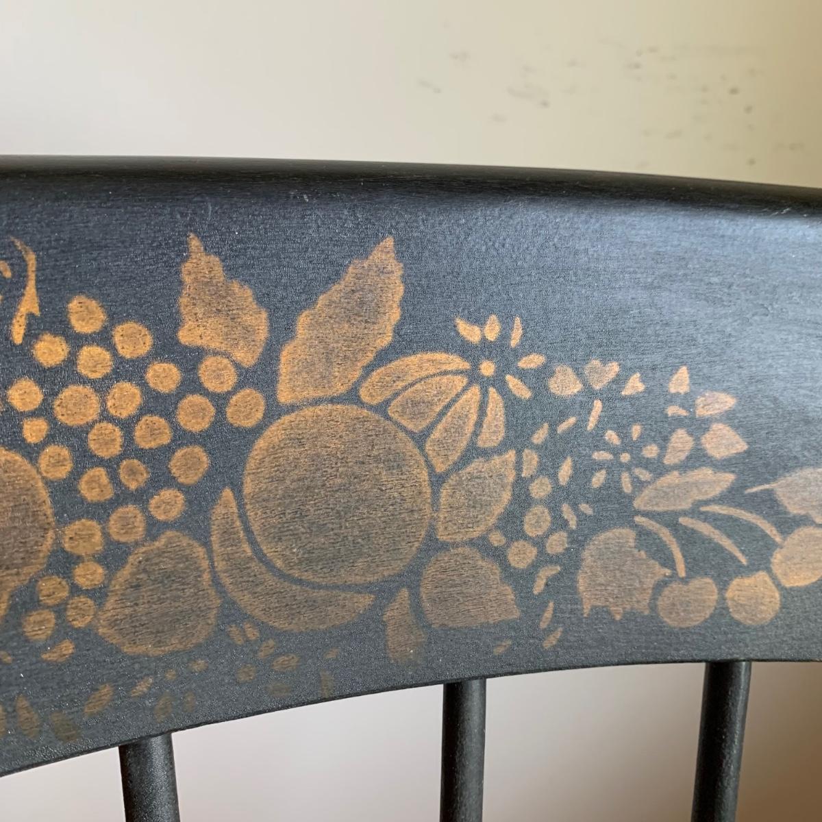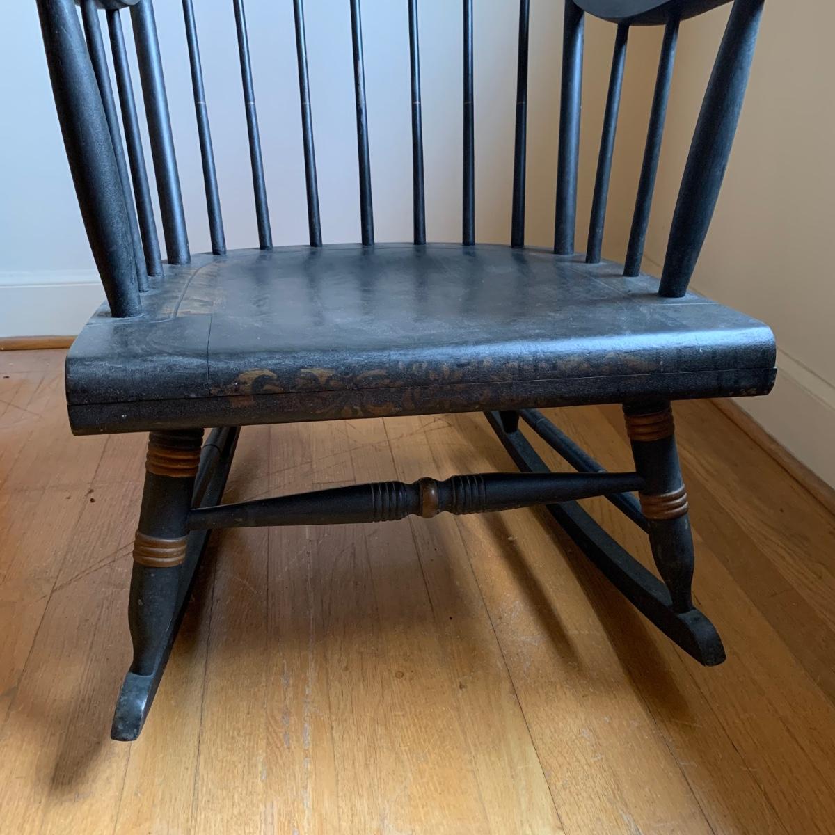 Wood rocking chair from Nichols & Stone Co. It has a distressed black finish and is decorated with a stenciled fruit motif. Structurally the chair is in very good condition. Superficially its finish shows some wear and the fruit motif appears to be a bit faded. The chair measures 23” x 29” x 42.5” with a seat height of 14”. Local pickup only.