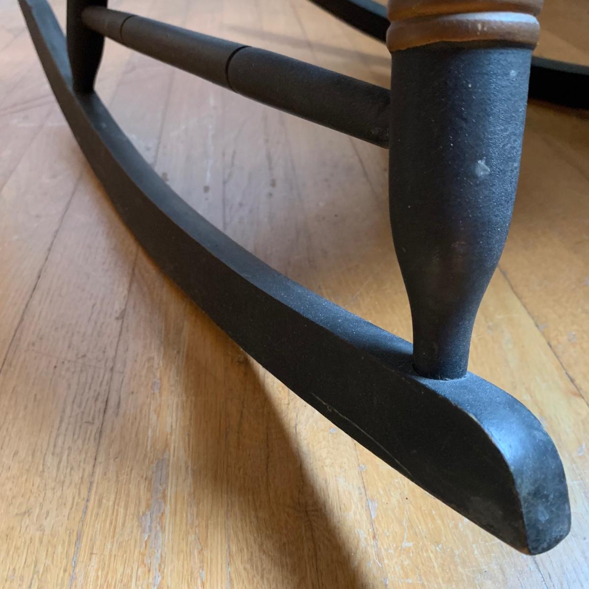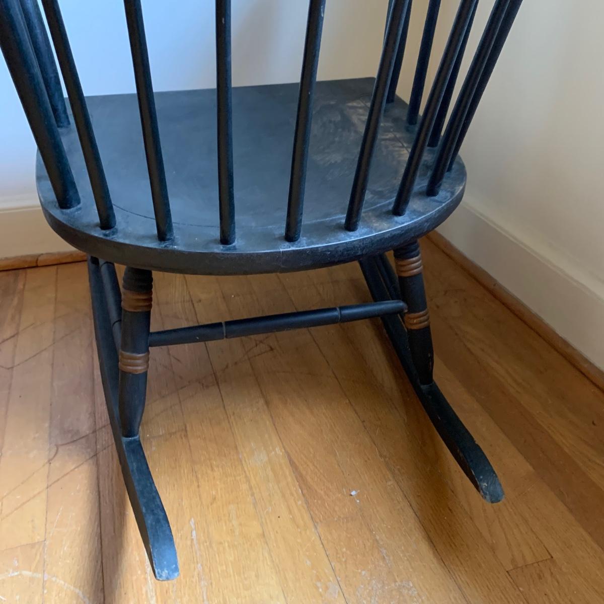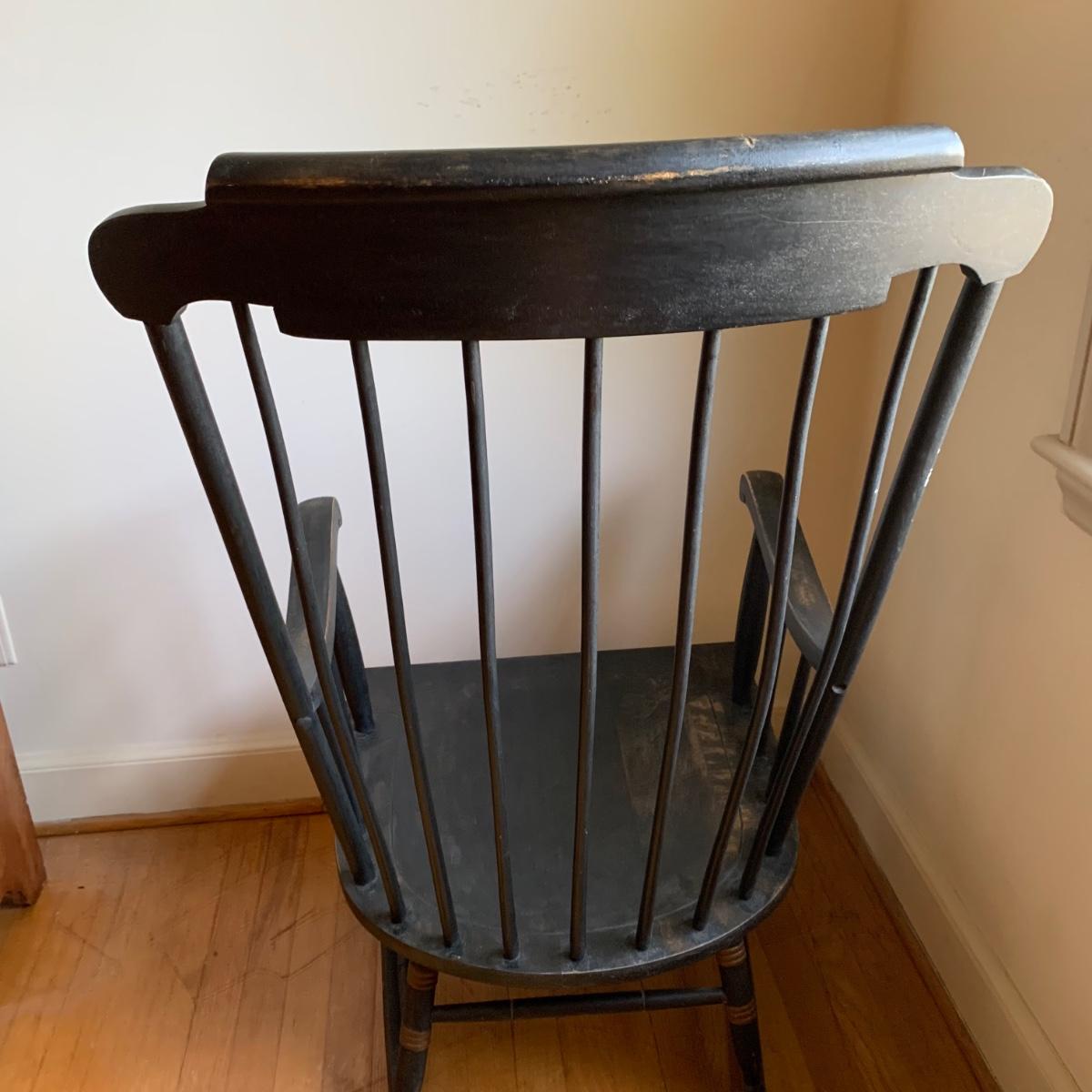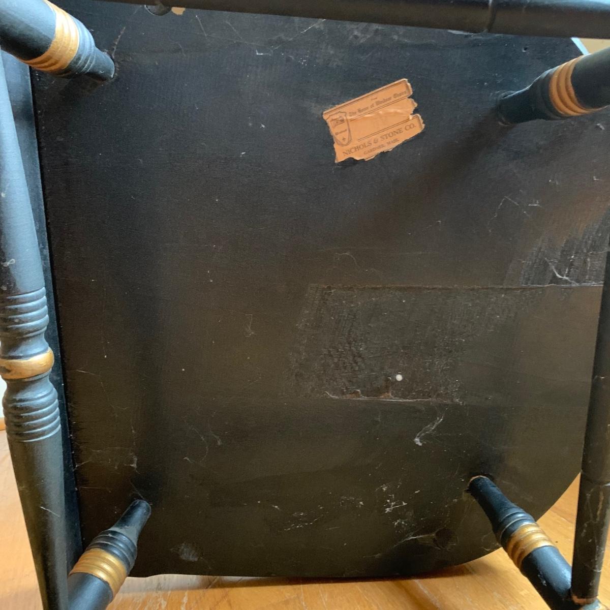 Wood rocking chair from Nichols & Stone Co. It has a distressed black finish and is decorated with a stenciled fruit motif. Structurally the chair is in very good condition. Superficially its finish shows some wear and the fruit motif appears to be a bit faded. The chair measures 23” x 29” x 42.5” with a seat height of 14”. Local pickup only.