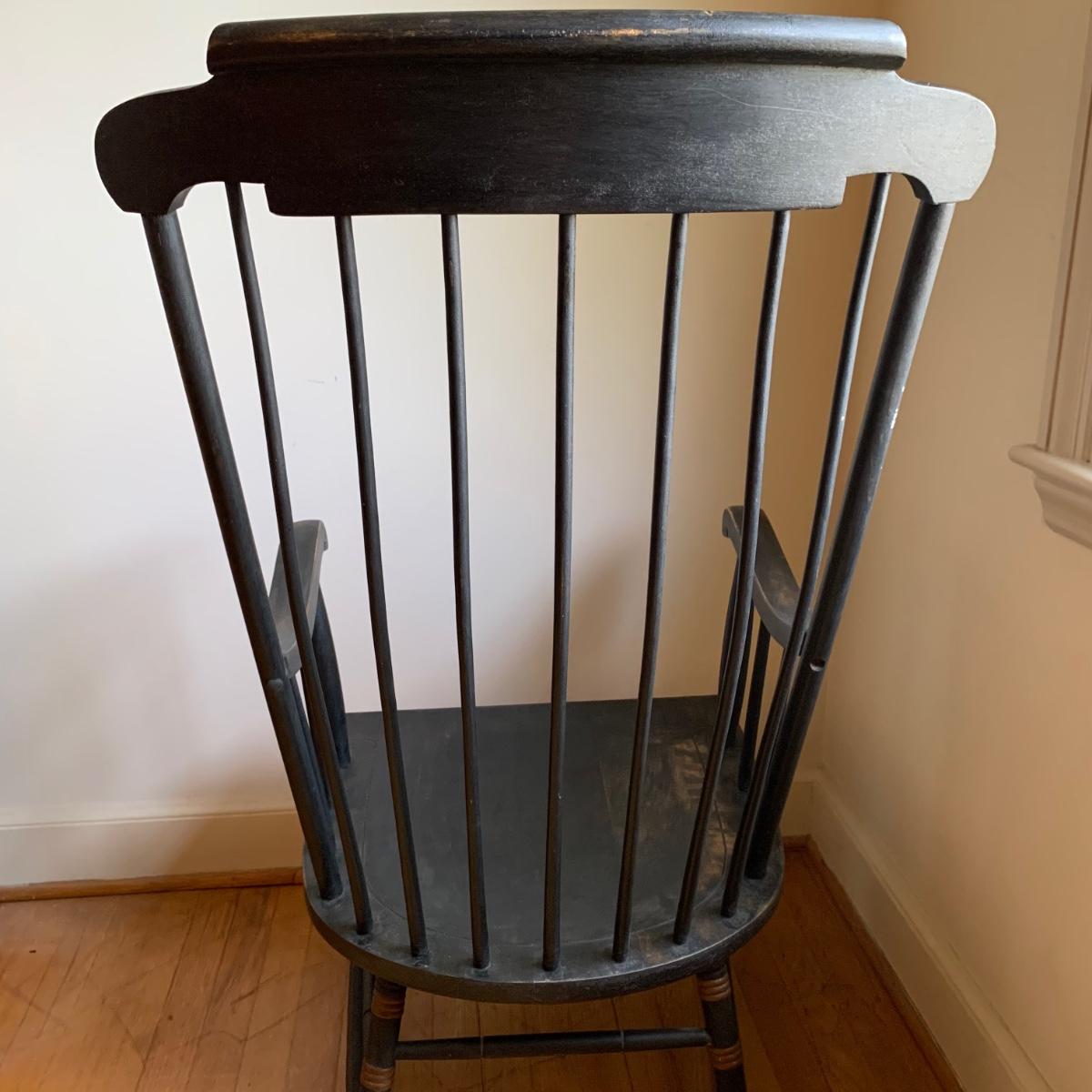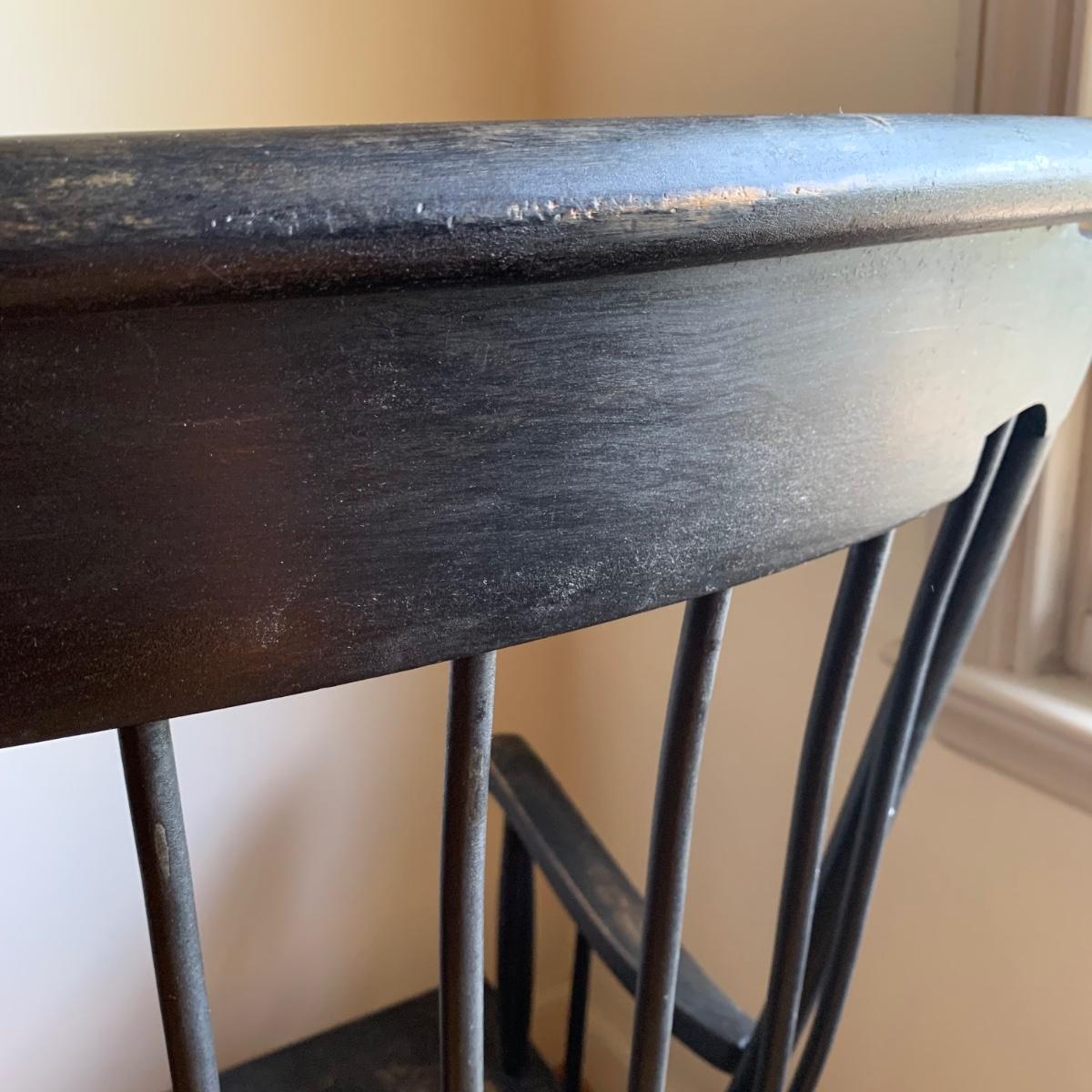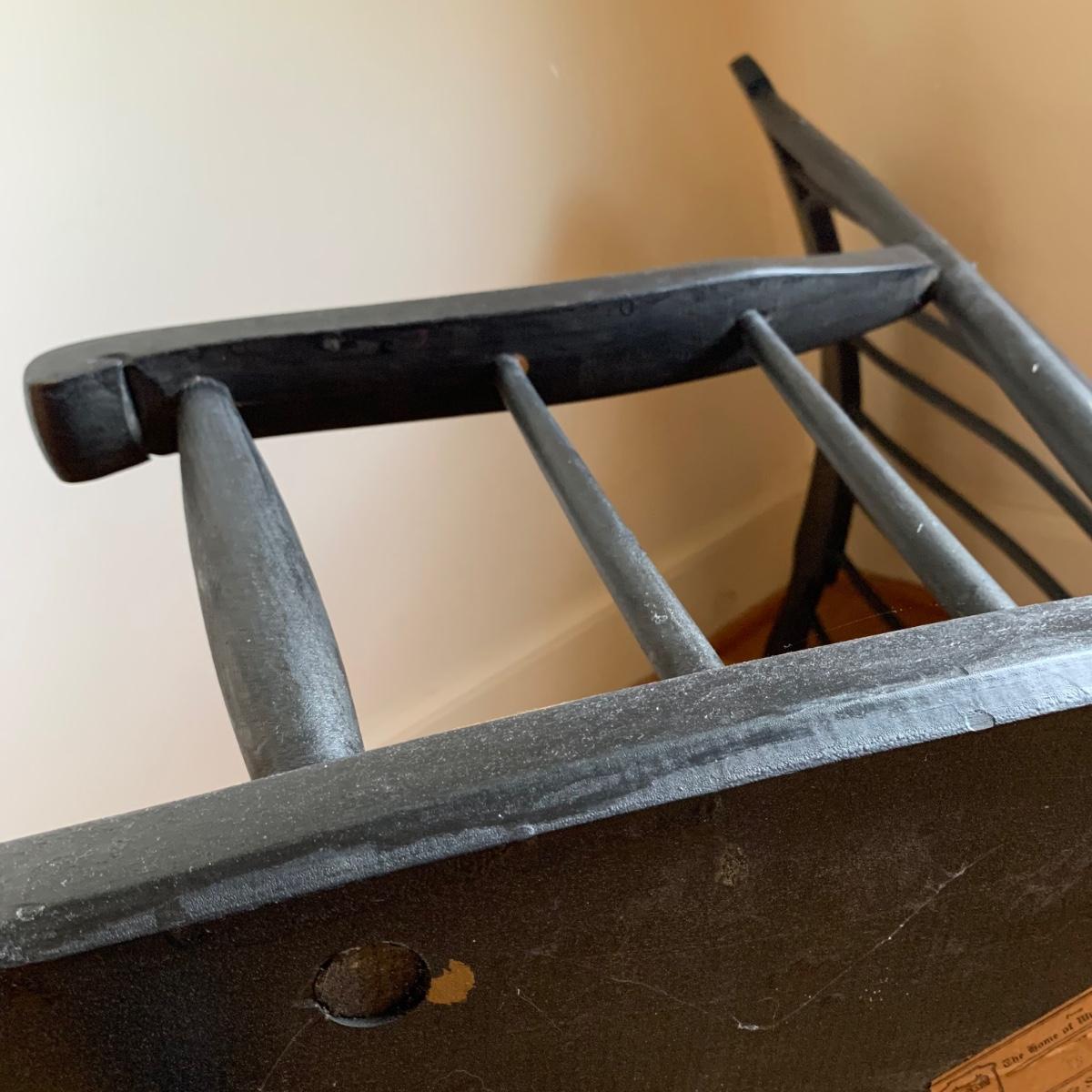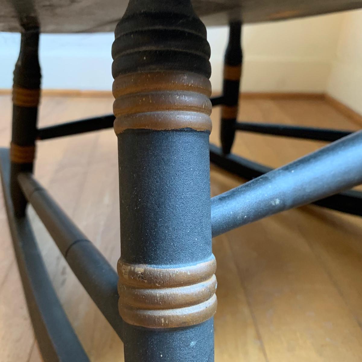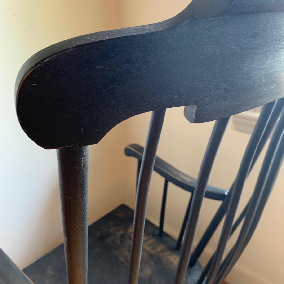 Wood rocking chair from Nichols & Stone Co. It has a distressed black finish and is decorated with a stenciled fruit motif. Structurally the chair is in very good condition. Superficially its finish shows some wear and the fruit motif appears to be a bit faded. The chair measures 23” x 29” x 42.5” with a seat height of 14”. Local pickup only.