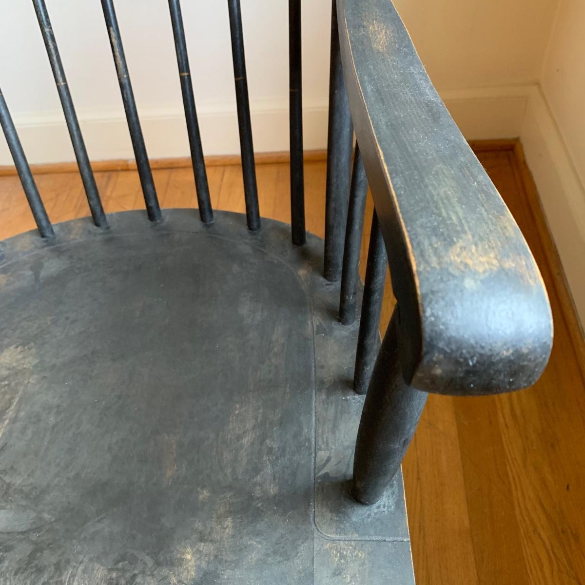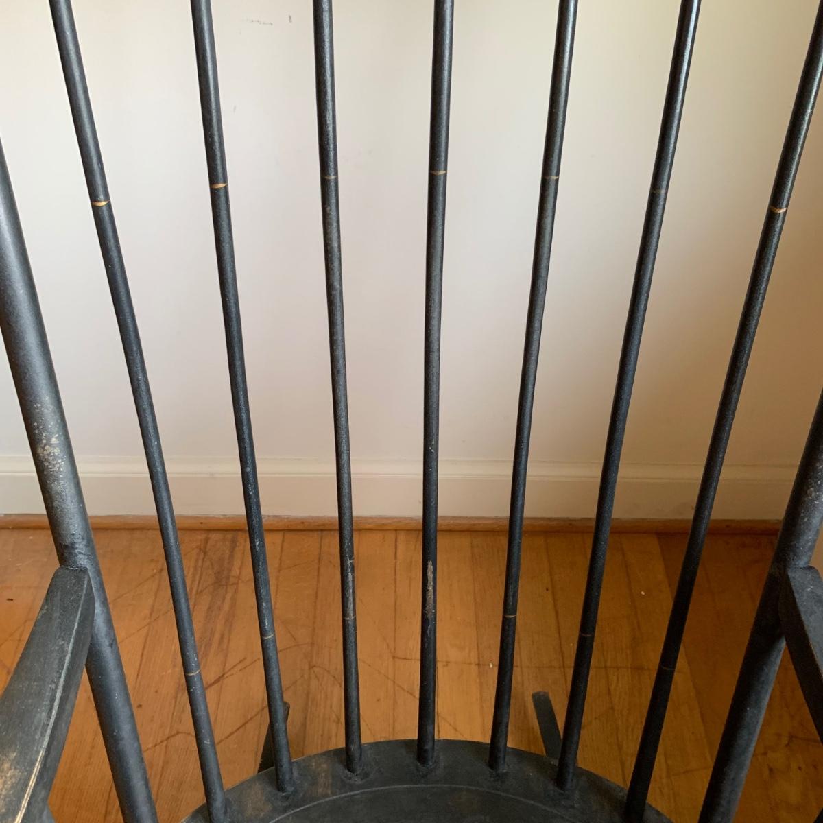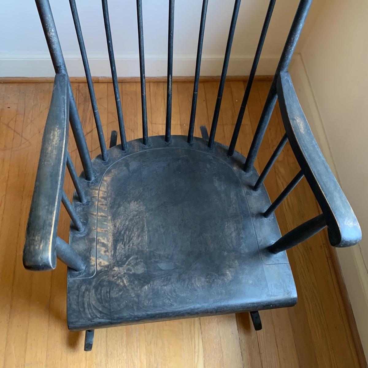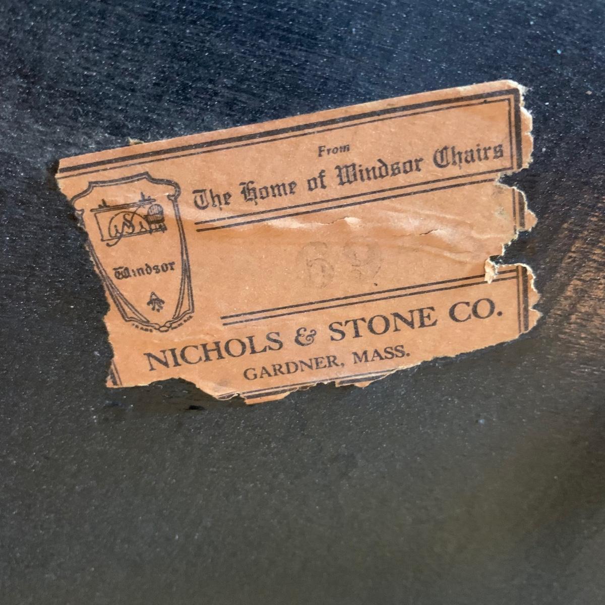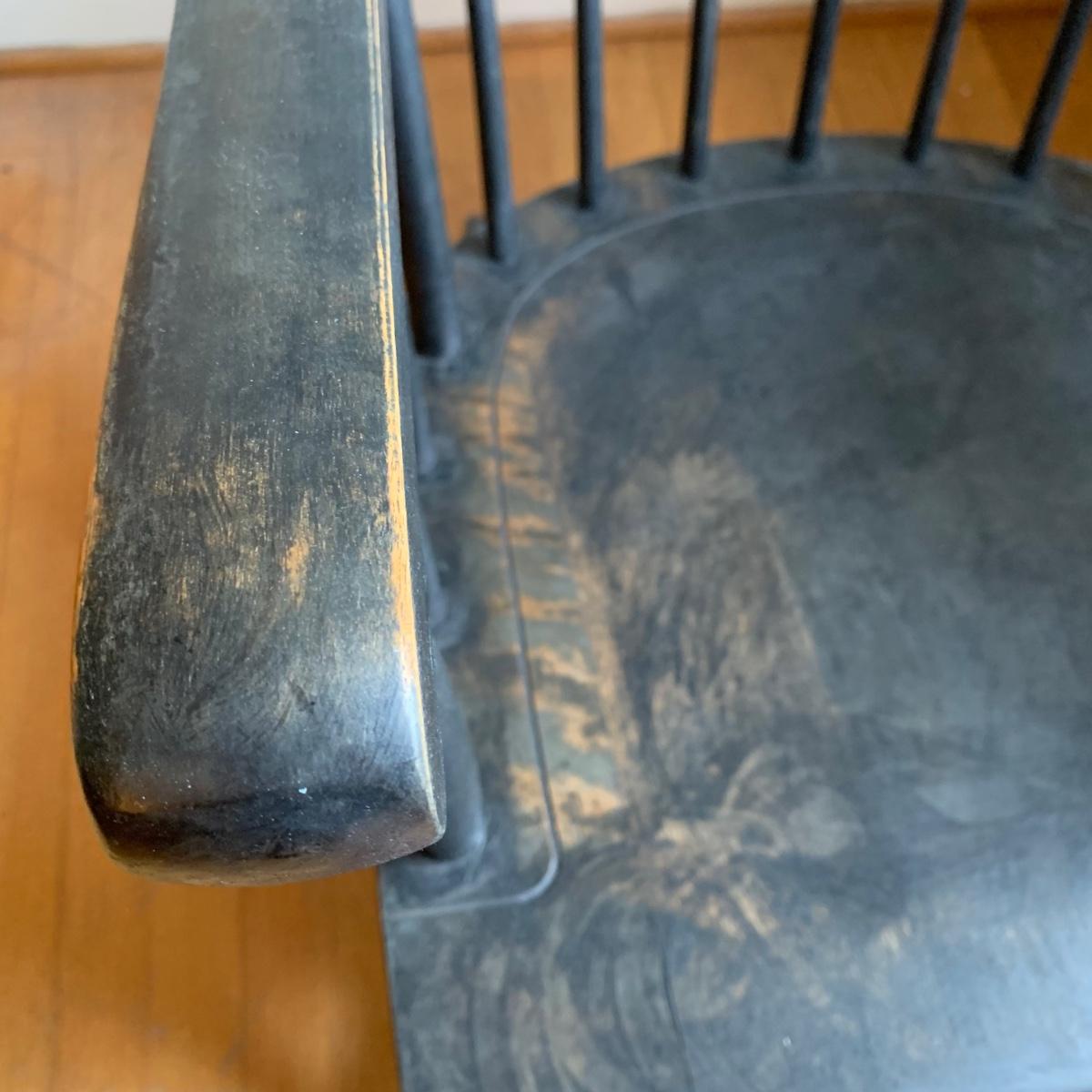 Wood rocking chair from Nichols & Stone Co. It has a distressed black finish and is decorated with a stenciled fruit motif. Structurally the chair is in very good condition. Superficially its finish shows some wear and the fruit motif appears to be a bit faded. The chair measures 23” x 29” x 42.5” with a seat height of 14”. Local pickup only.