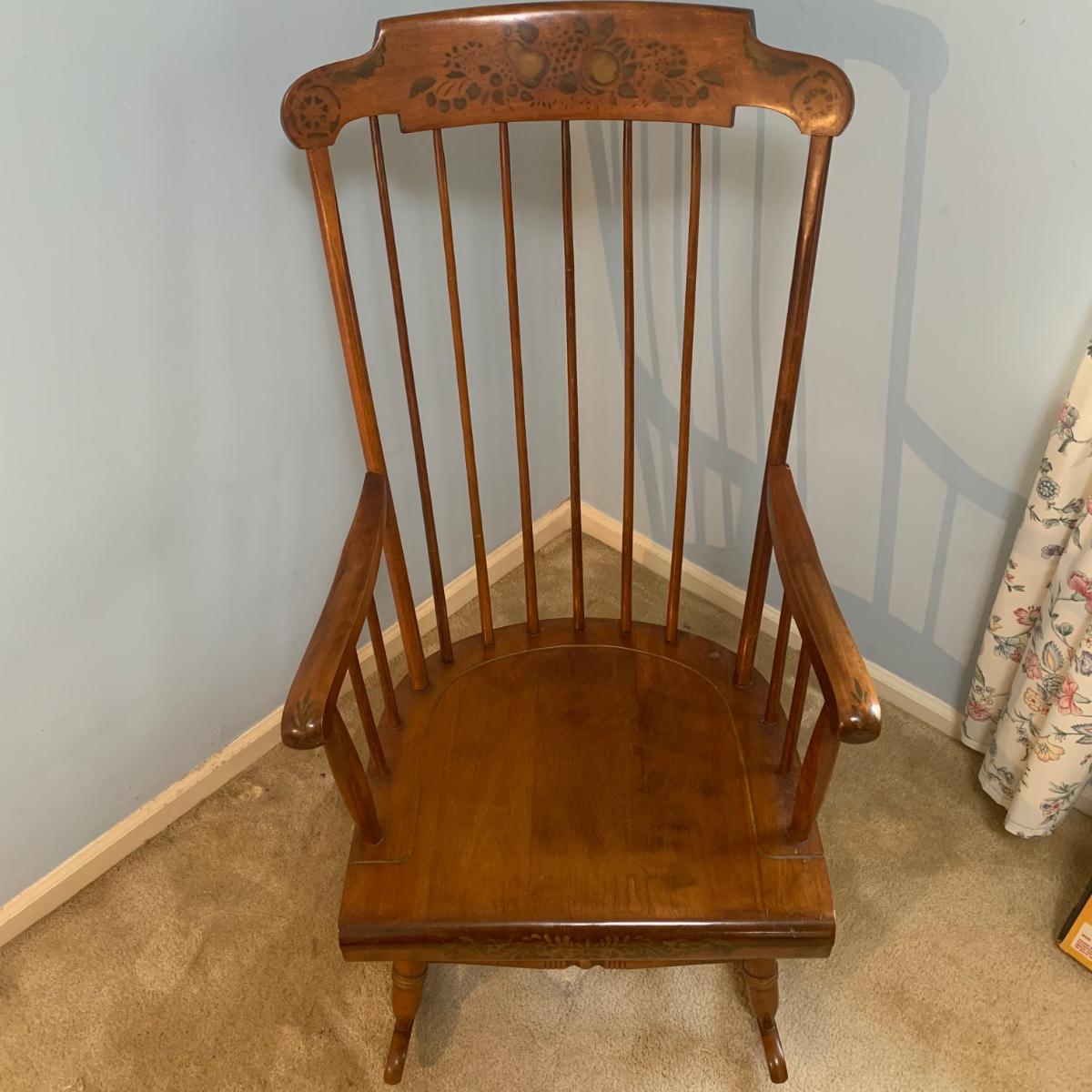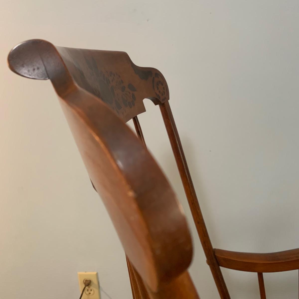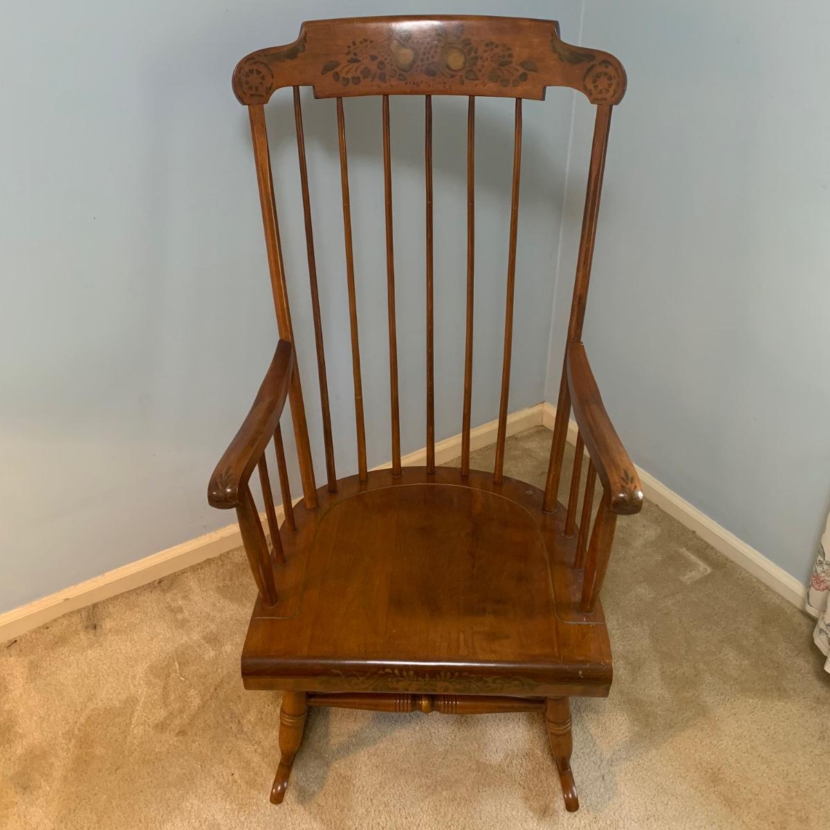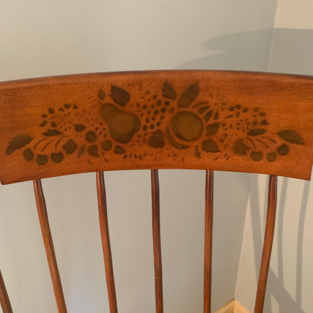 Beautiful Nichols & Stone Co. rocking chair with fruit headrest design. This rocking chair is solid with delicate etching on arms and seat. It is missing one piece of the backrest, but this does not effect the comfort or movement of the chair. Could be repaired, as broken piece is included. See photos for details. This truly is a delightful rocking chair. It measures, 23.5”L x 29”W x 43”H with a seat height of 13.5”H.