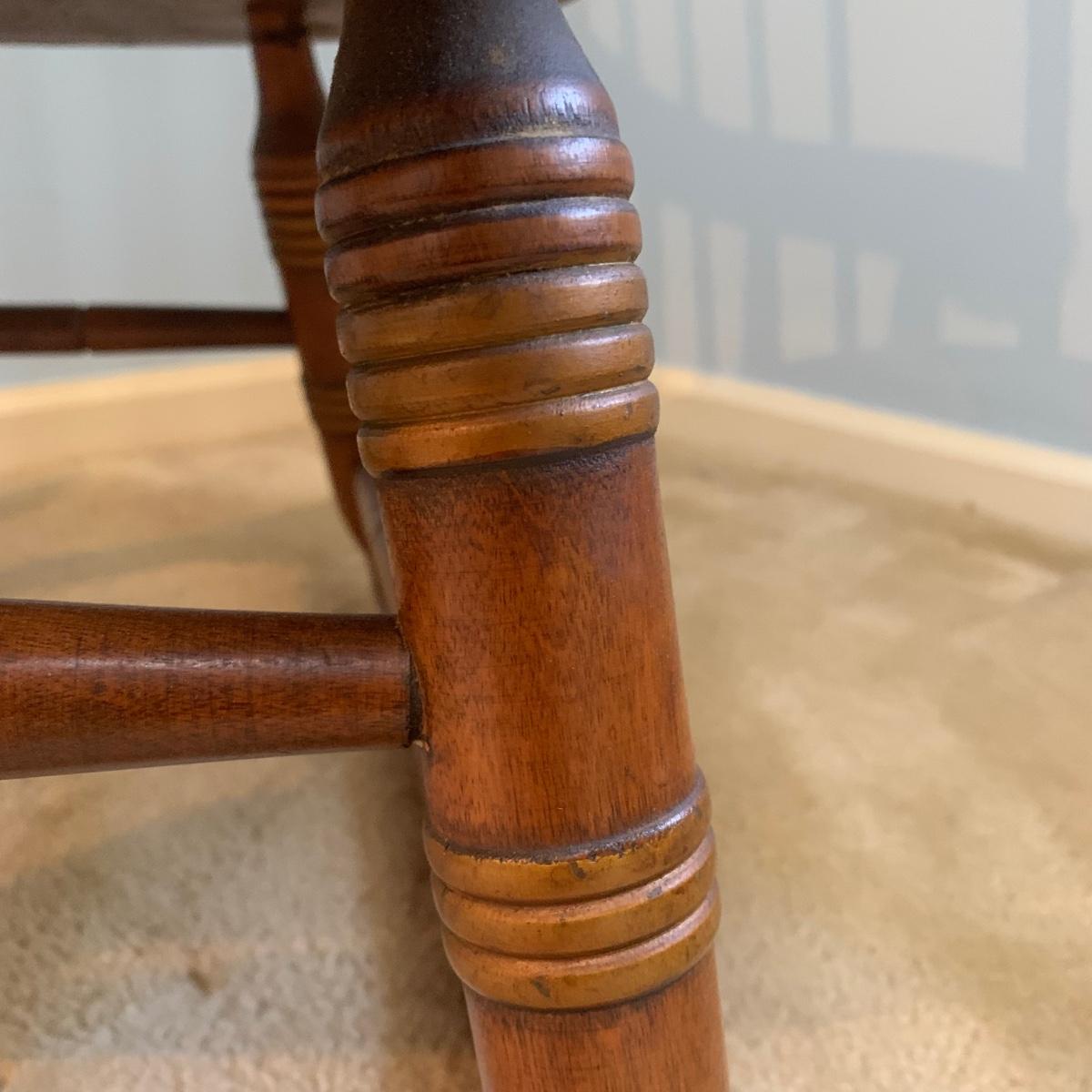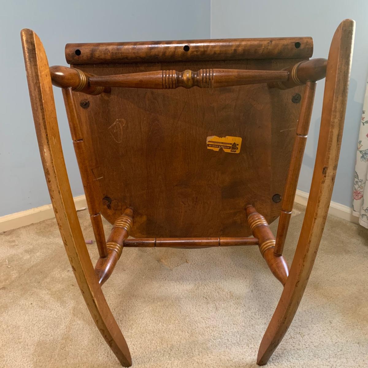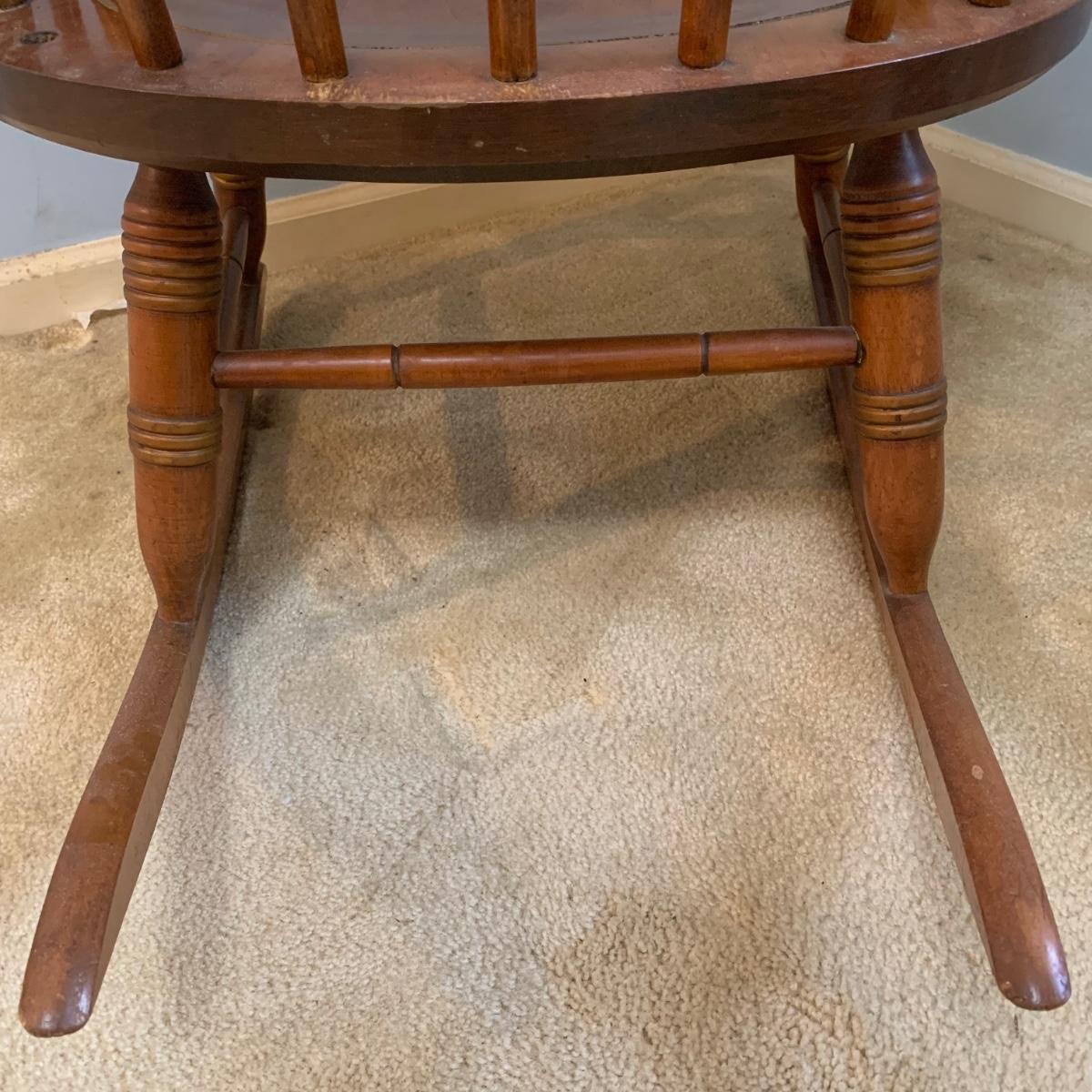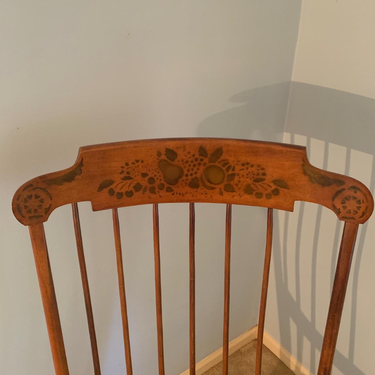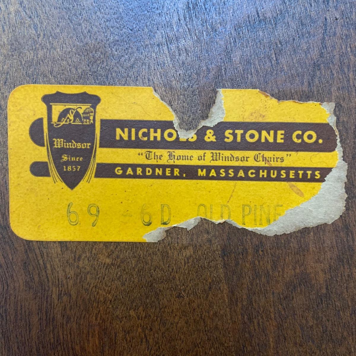 Beautiful Nichols & Stone Co. rocking chair with fruit headrest design. This rocking chair is solid with delicate etching on arms and seat. It is missing one piece of the backrest, but this does not effect the comfort or movement of the chair. Could be repaired, as broken piece is included. See photos for details. This truly is a delightful rocking chair. It measures, 23.5”L x 29”W x 43”H with a seat height of 13.5”H.