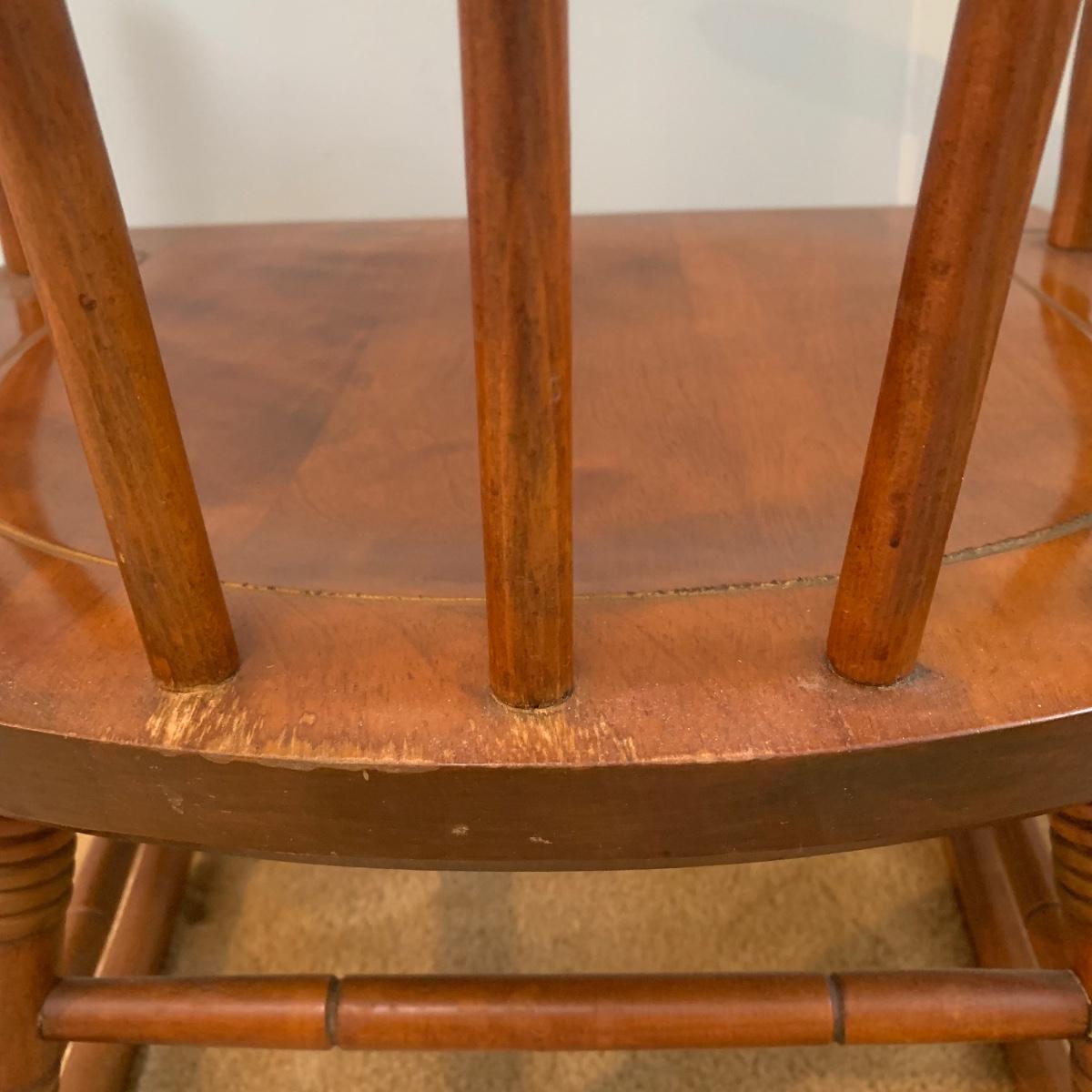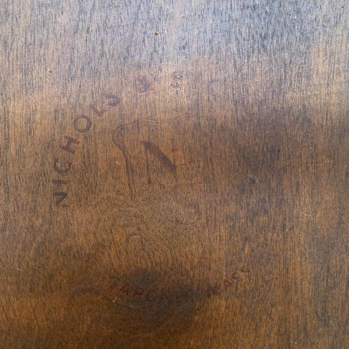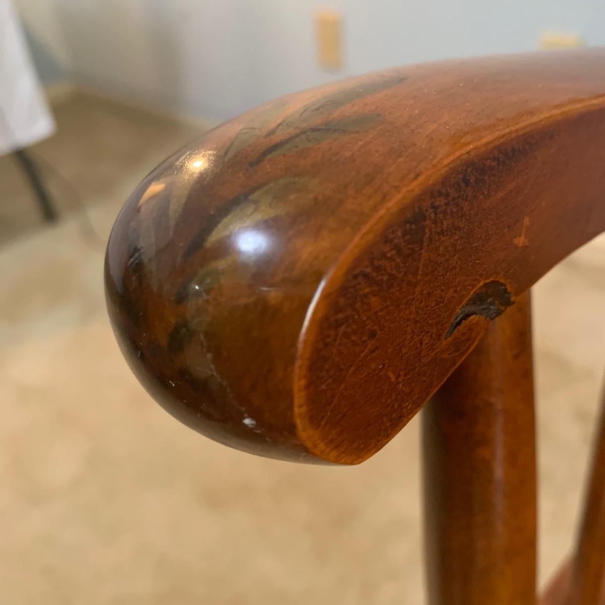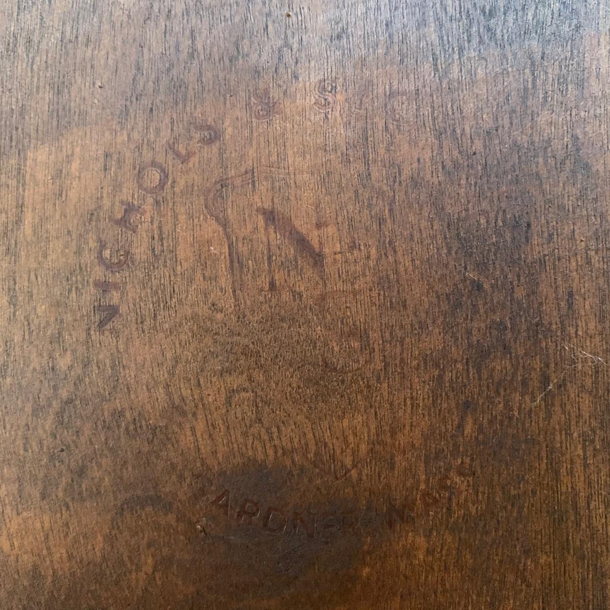 Beautiful Nichols & Stone Co. rocking chair with fruit headrest design. This rocking chair is solid with delicate etching on arms and seat. It is missing one piece of the backrest, but this does not effect the comfort or movement of the chair. Could be repaired, as broken piece is included. See photos for details. This truly is a delightful rocking chair. It measures, 23.5”L x 29”W x 43”H with a seat height of 13.5”H.