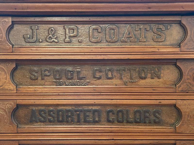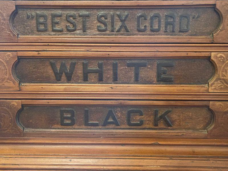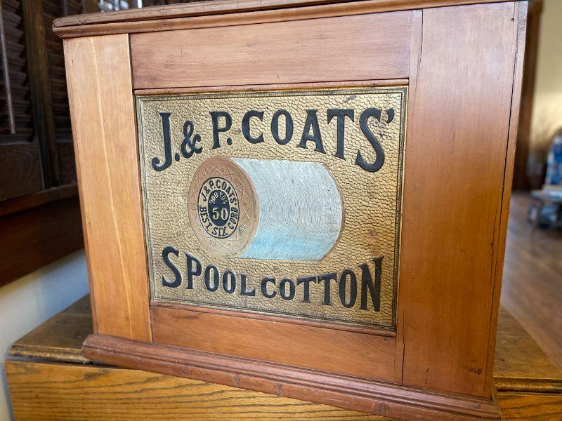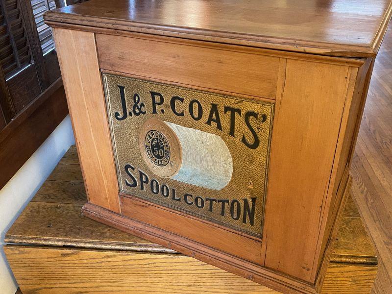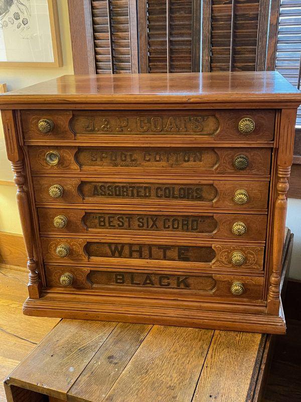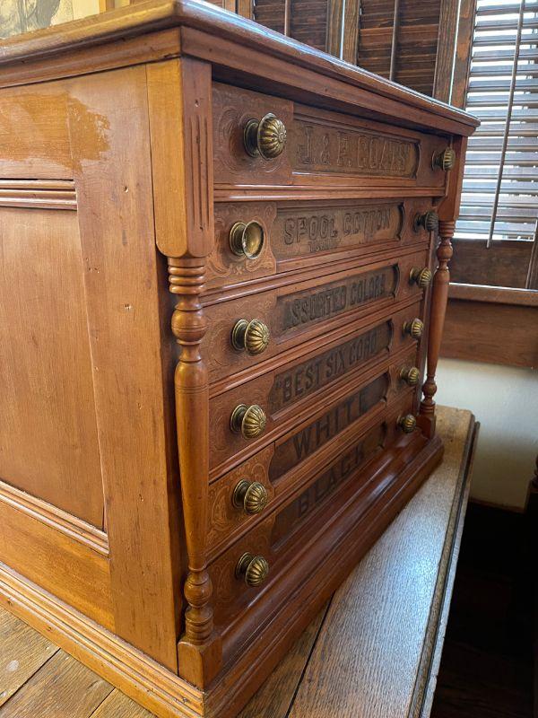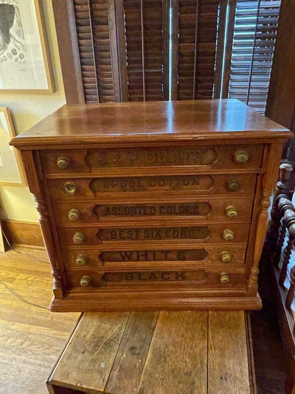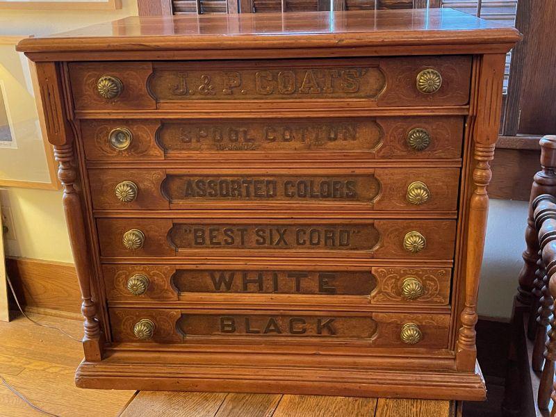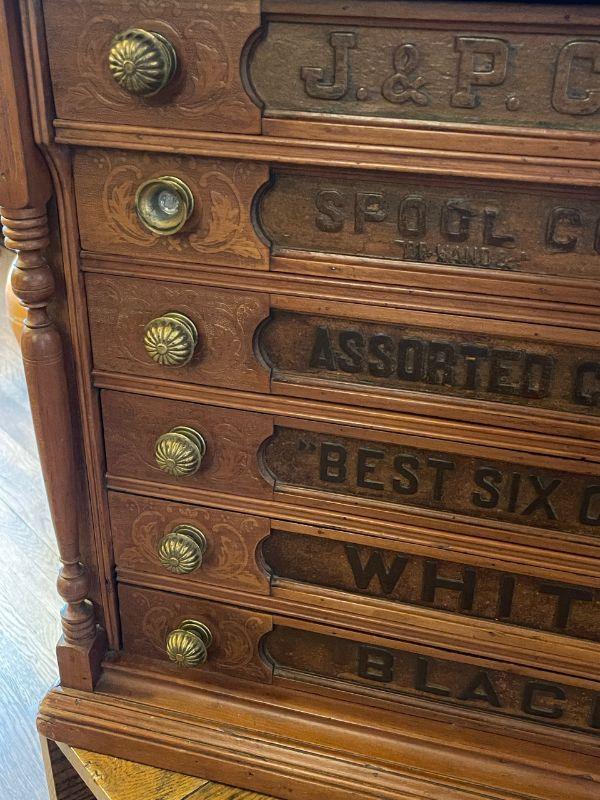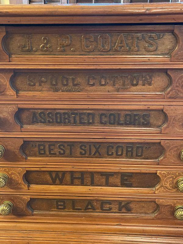 This Classic American Victorian spool cabinet was originally purchased for display use in the Miller Store in Morrill, Kansas by the great great grandfather of the seller. The case is fronted with six shallow drawers, all of which retain the original contents labels. The back side of the cabinet has in in-set panel decorated with large, bold graphics that read, “J & P Coats Spool Cotton. (see photos). The case has a tight hairline shrinkage crack to the top of the case, a small, missing bit of molding underneath the top, a ding to the inset panel, and one missing pull cap, but is in otherwise strong structural condition. Appraisal value: $795.