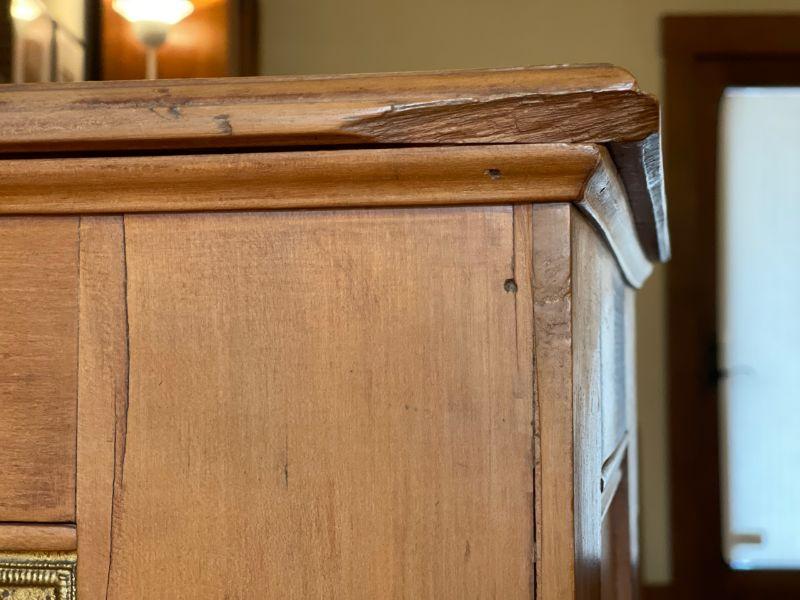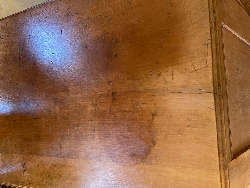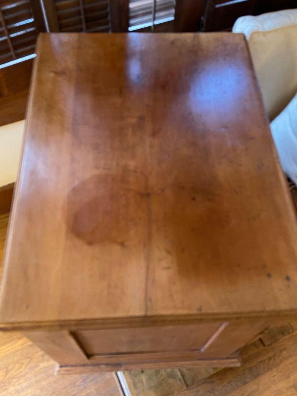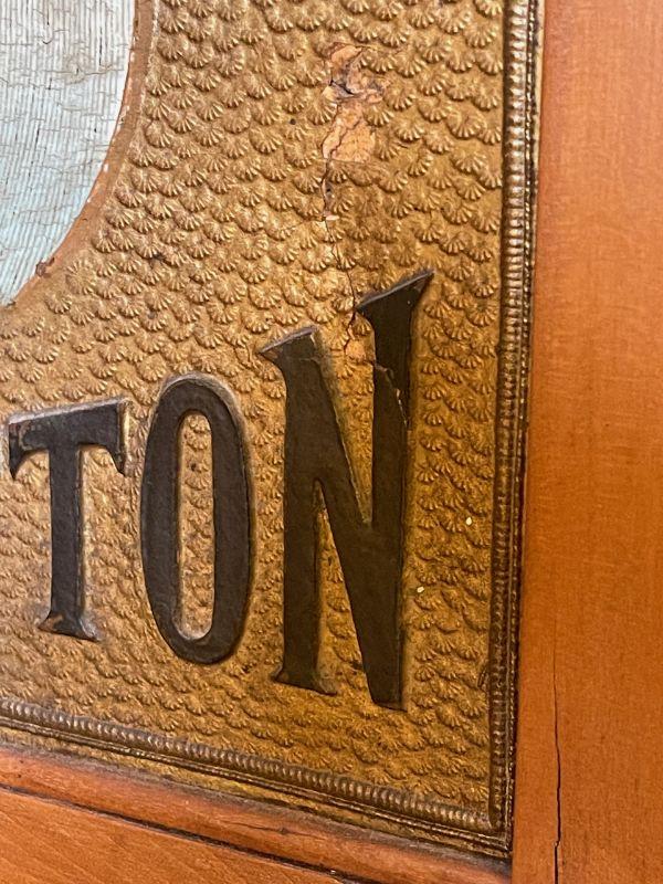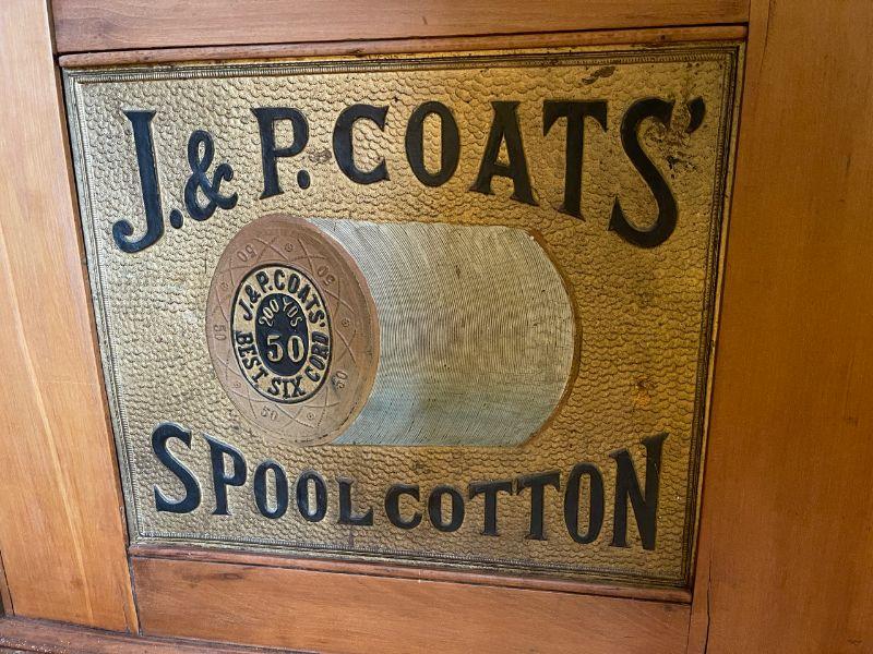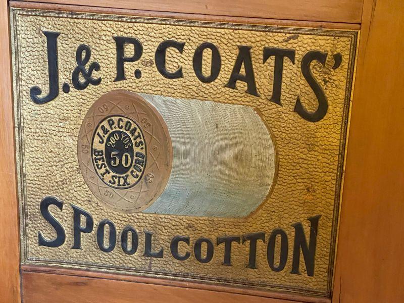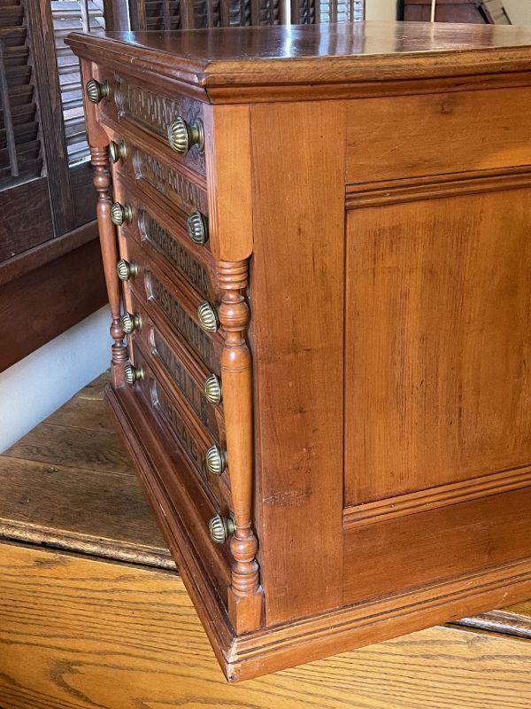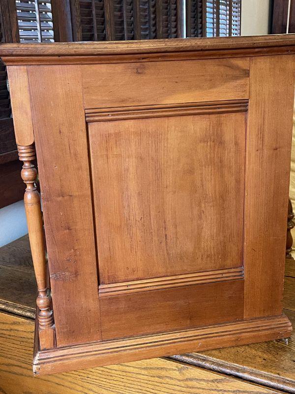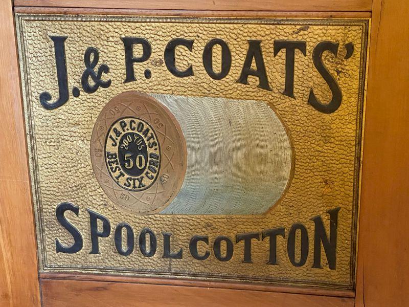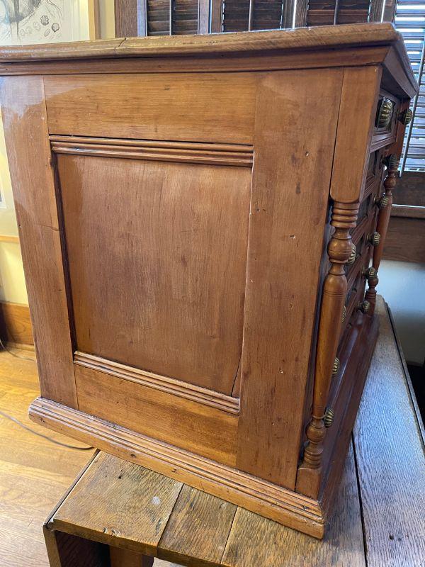 This Classic American Victorian spool cabinet was originally purchased for display use in the Miller Store in Morrill, Kansas by the great great grandfather of the seller. The case is fronted with six shallow drawers, all of which retain the original contents labels. The back side of the cabinet has in in-set panel decorated with large, bold graphics that read, “J & P Coats Spool Cotton. (see photos). The case has a tight hairline shrinkage crack to the top of the case, a small, missing bit of molding underneath the top, a ding to the inset panel, and one missing pull cap, but is in otherwise strong structural condition. Appraisal value: $795.