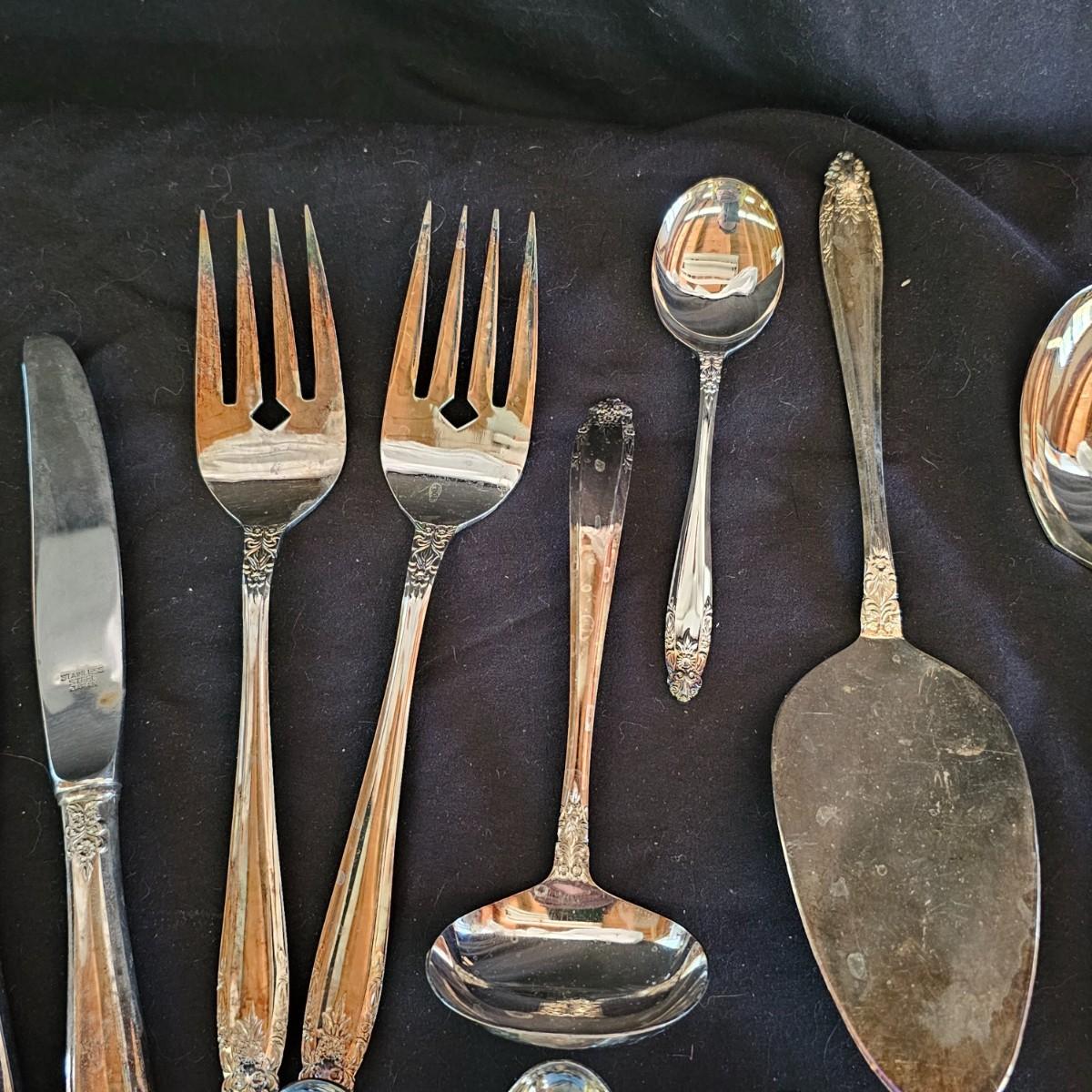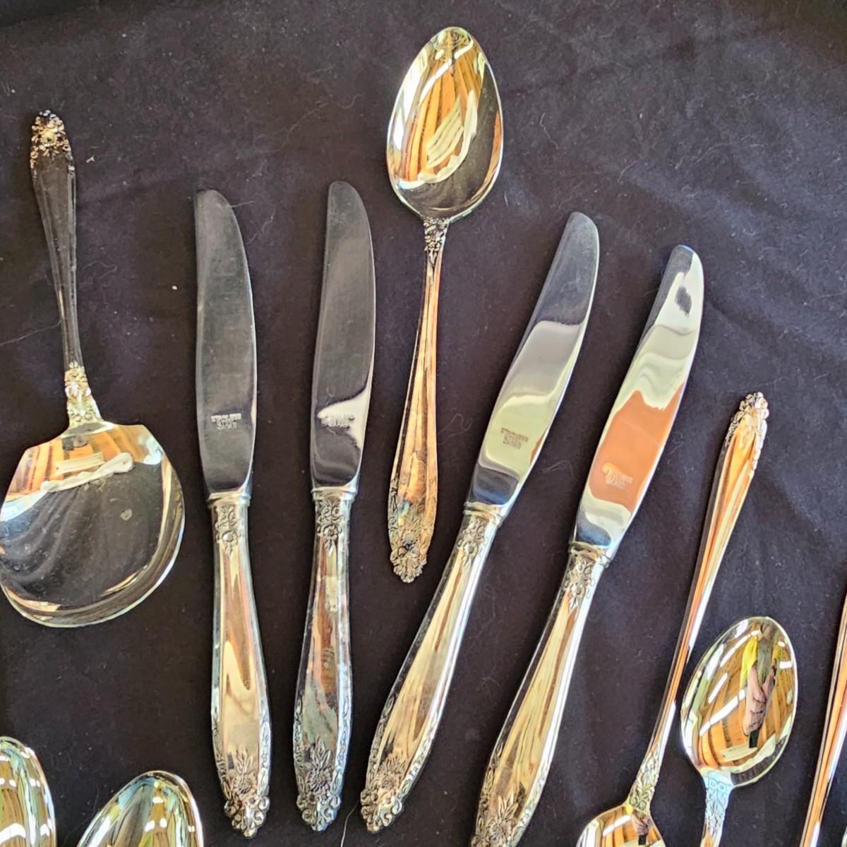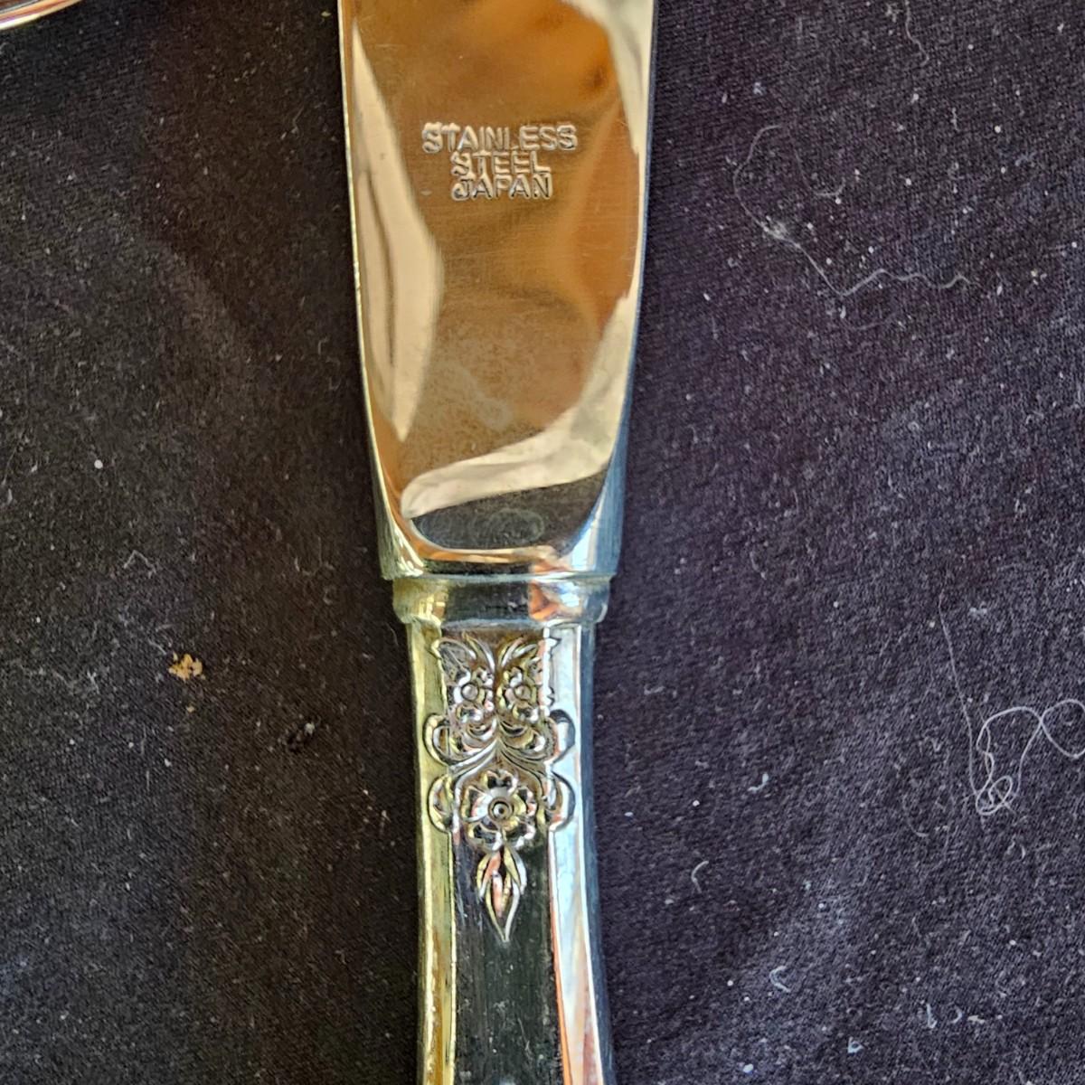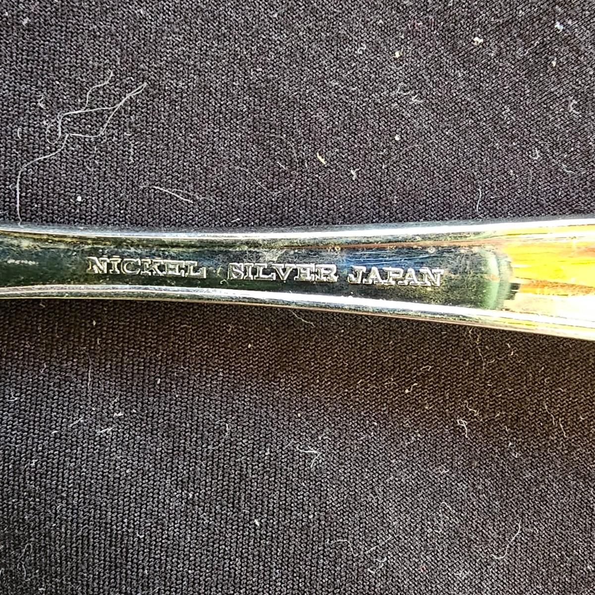 Knives, spoons, forks, serving pieces. These items are all marked nickel silver Japan. Tea and soup spoons, dinner and dessert forks. Ice tea spoons. Cocktail forks and sugar spoons. Some pieces have tarnish, see photos for details. There are five complete place settings within this collection. Shipping available.