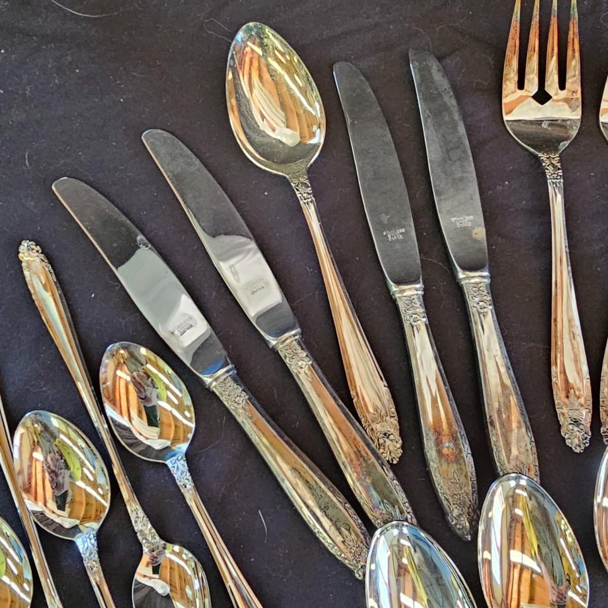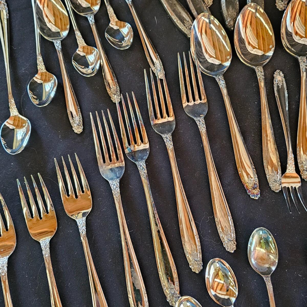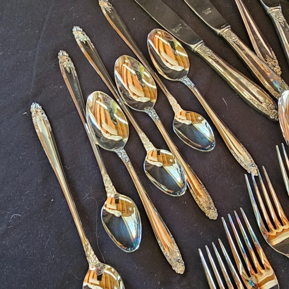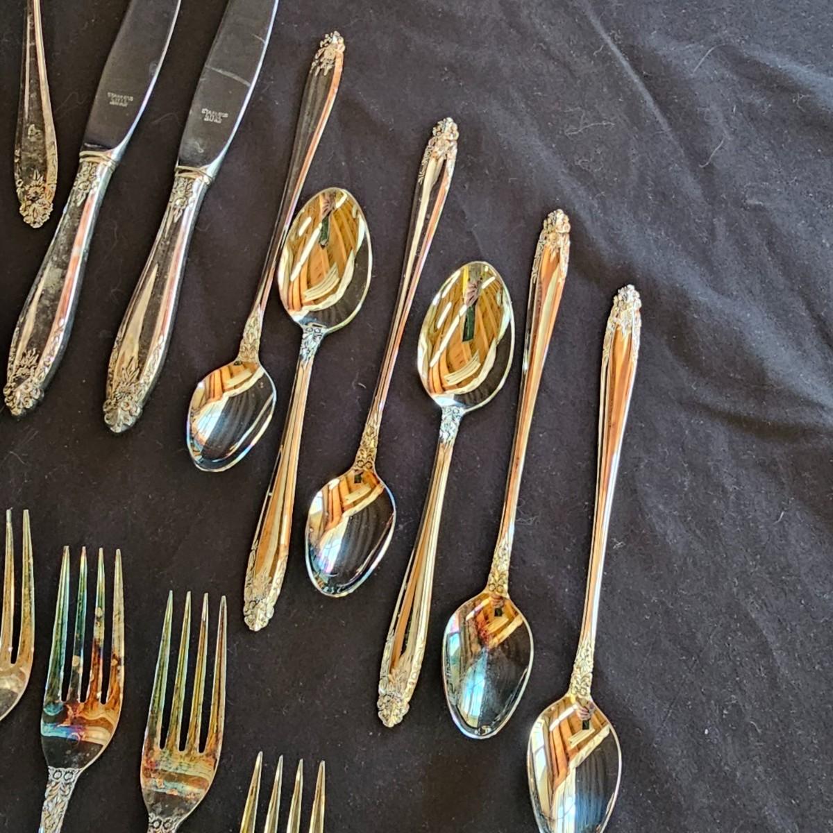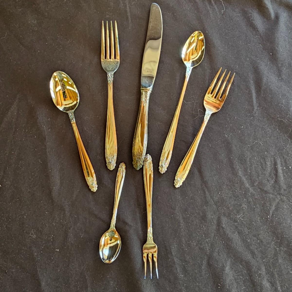 Knives, spoons, forks, serving pieces. These items are all marked nickel silver Japan. Tea and soup spoons, dinner and dessert forks. Ice tea spoons. Cocktail forks and sugar spoons. Some pieces have tarnish, see photos for details. There are five complete place settings within this collection. Shipping available.