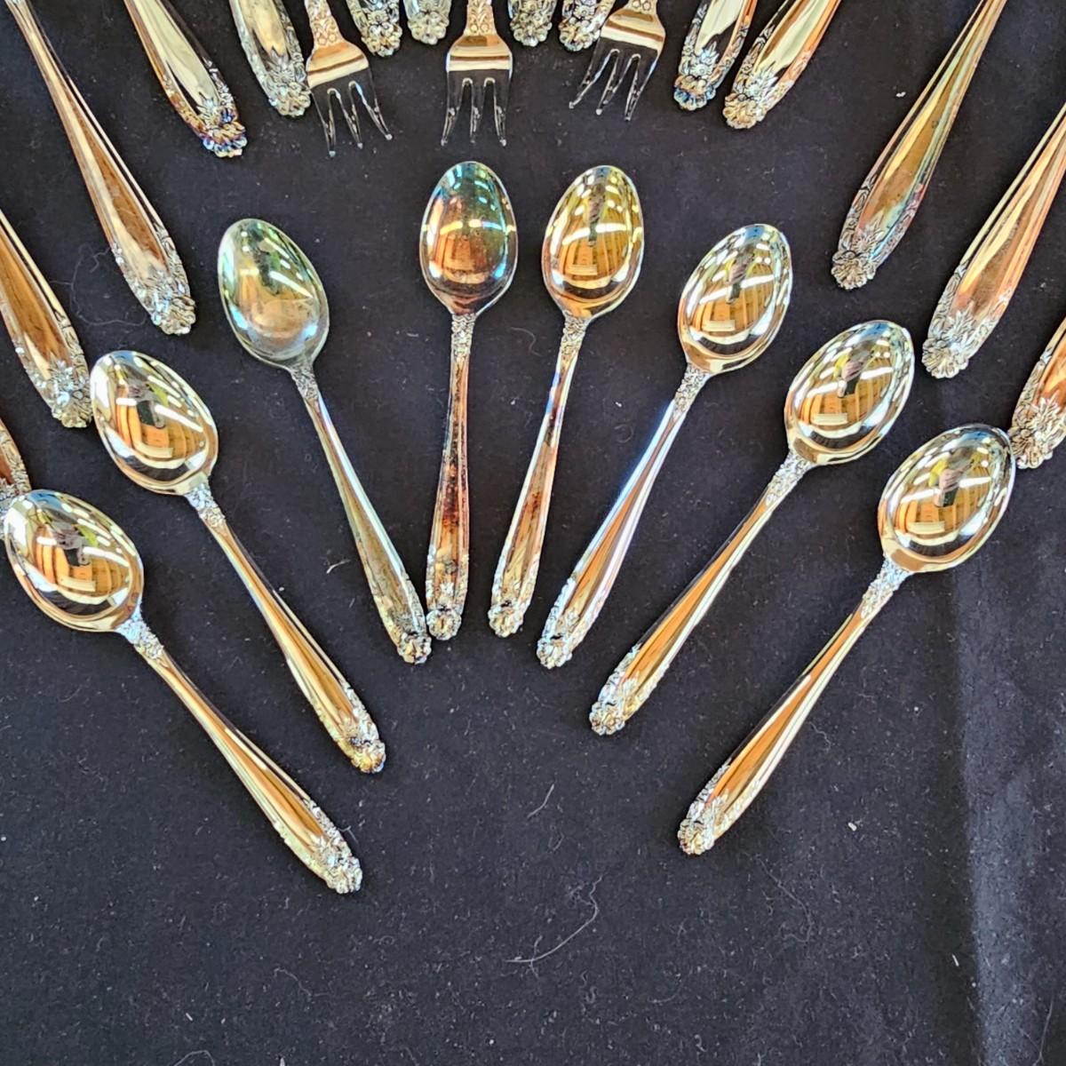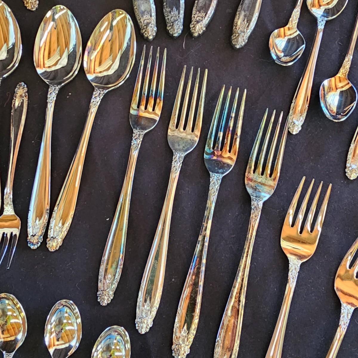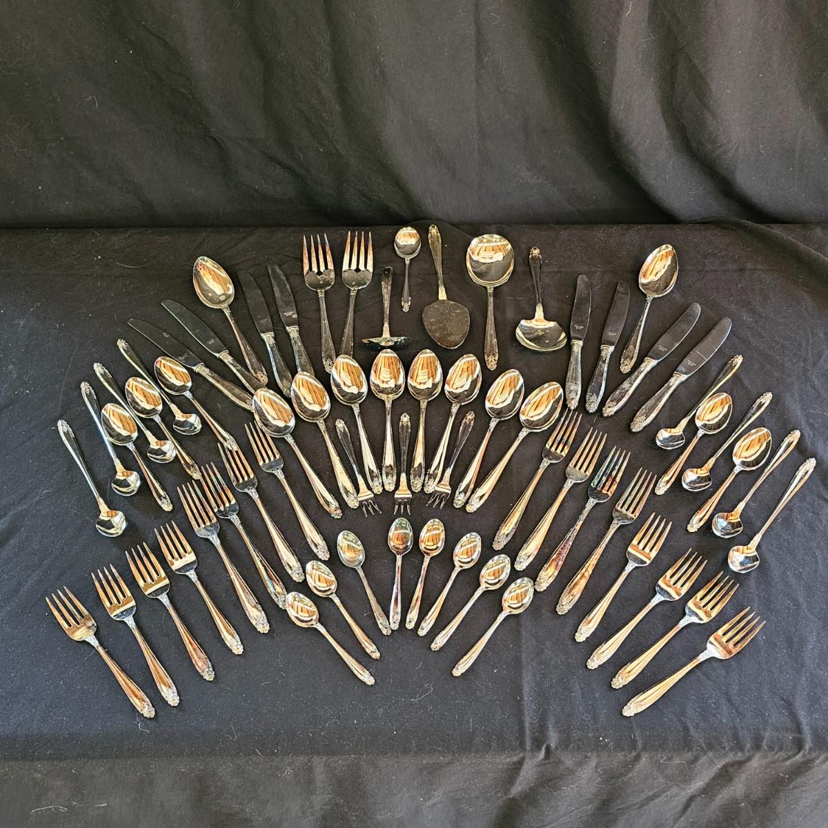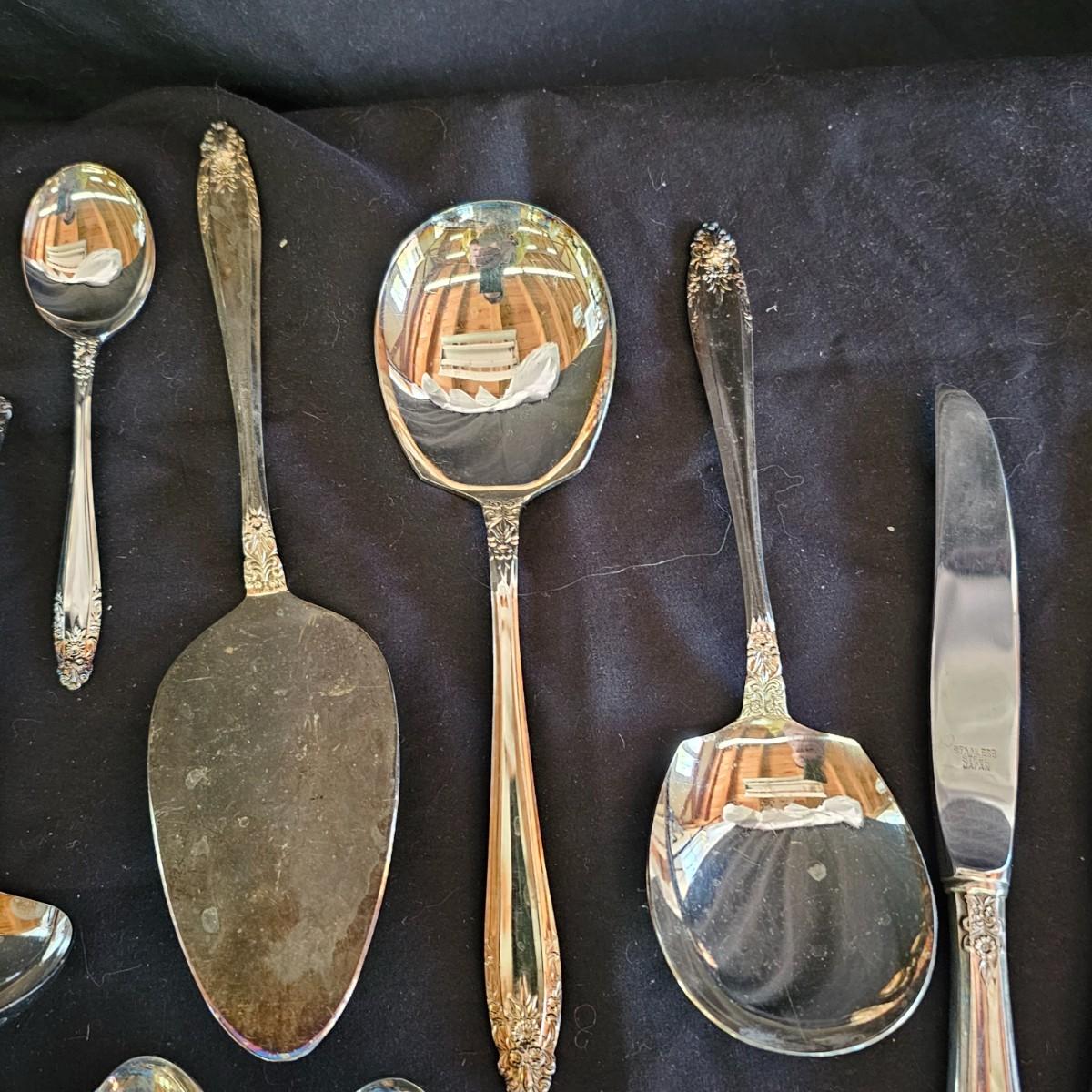 Knives, spoons, forks, serving pieces. These items are all marked nickel silver Japan. Tea and soup spoons, dinner and dessert forks. Ice tea spoons. Cocktail forks and sugar spoons. Some pieces have tarnish, see photos for details. There are five complete place settings within this collection. Shipping available.