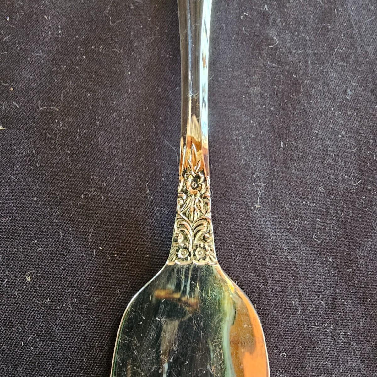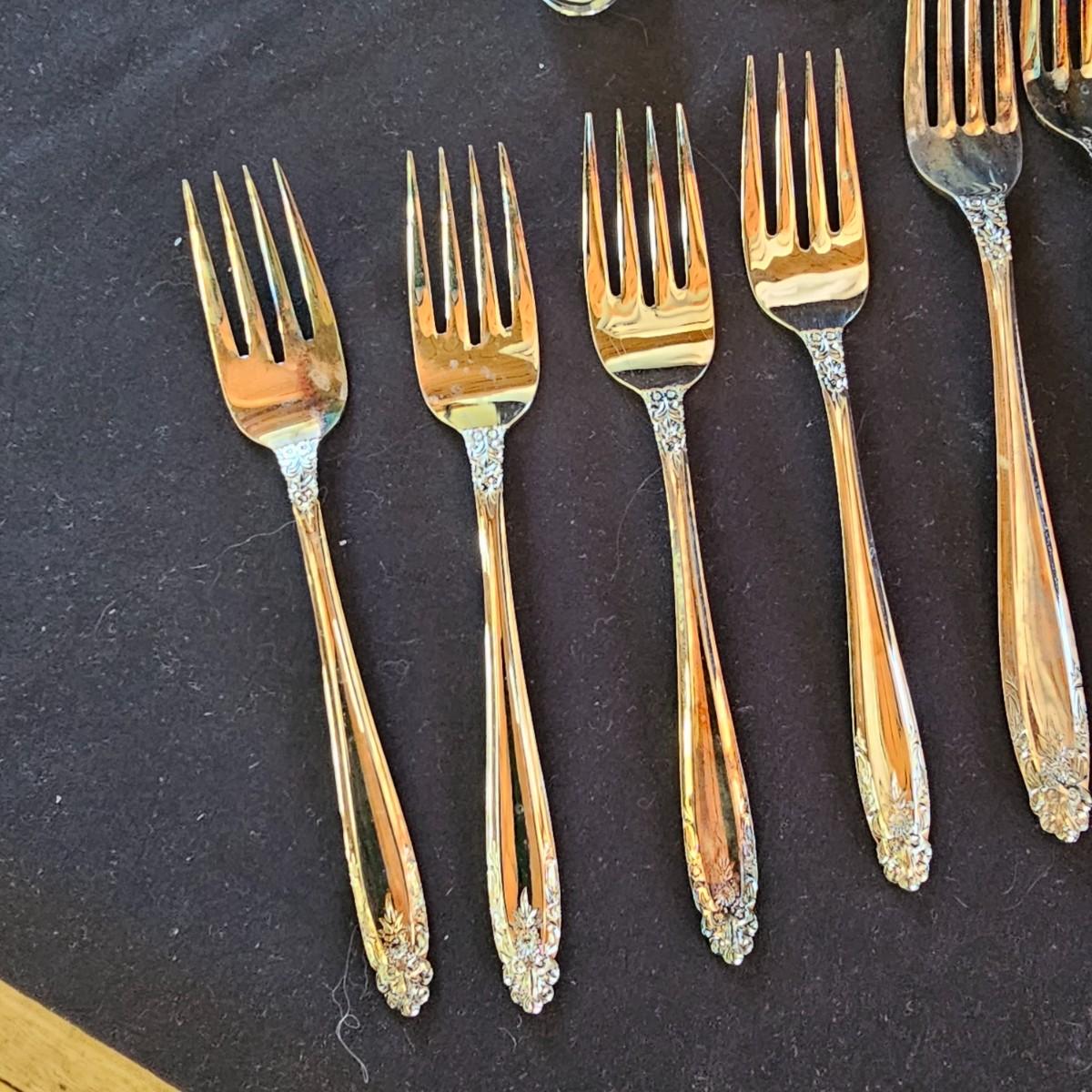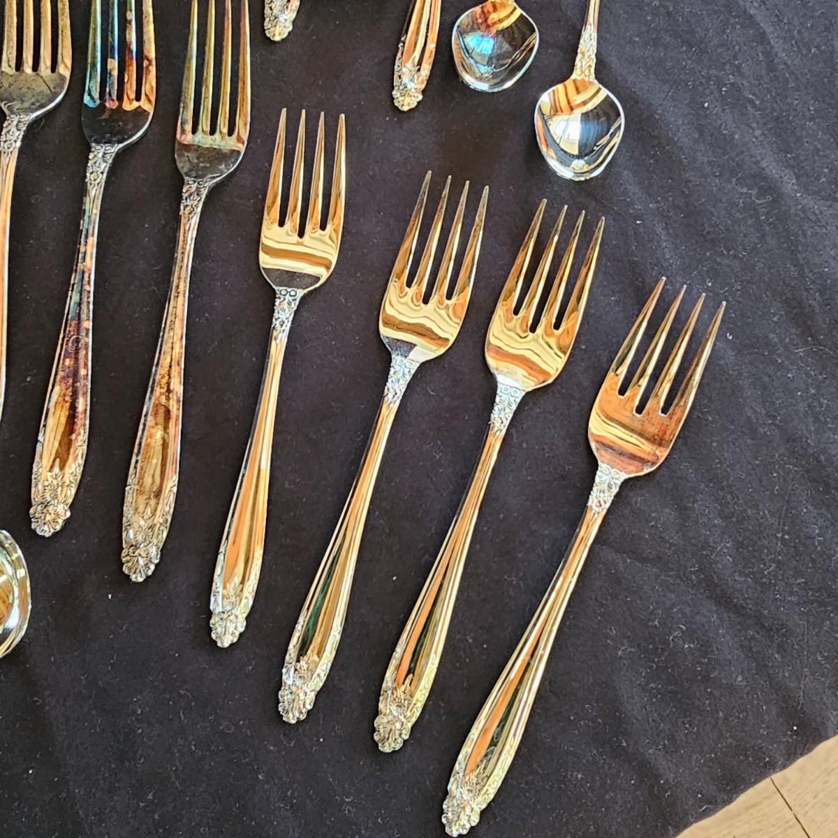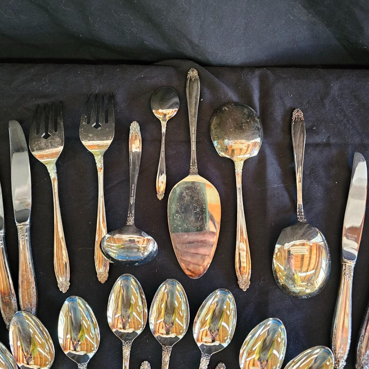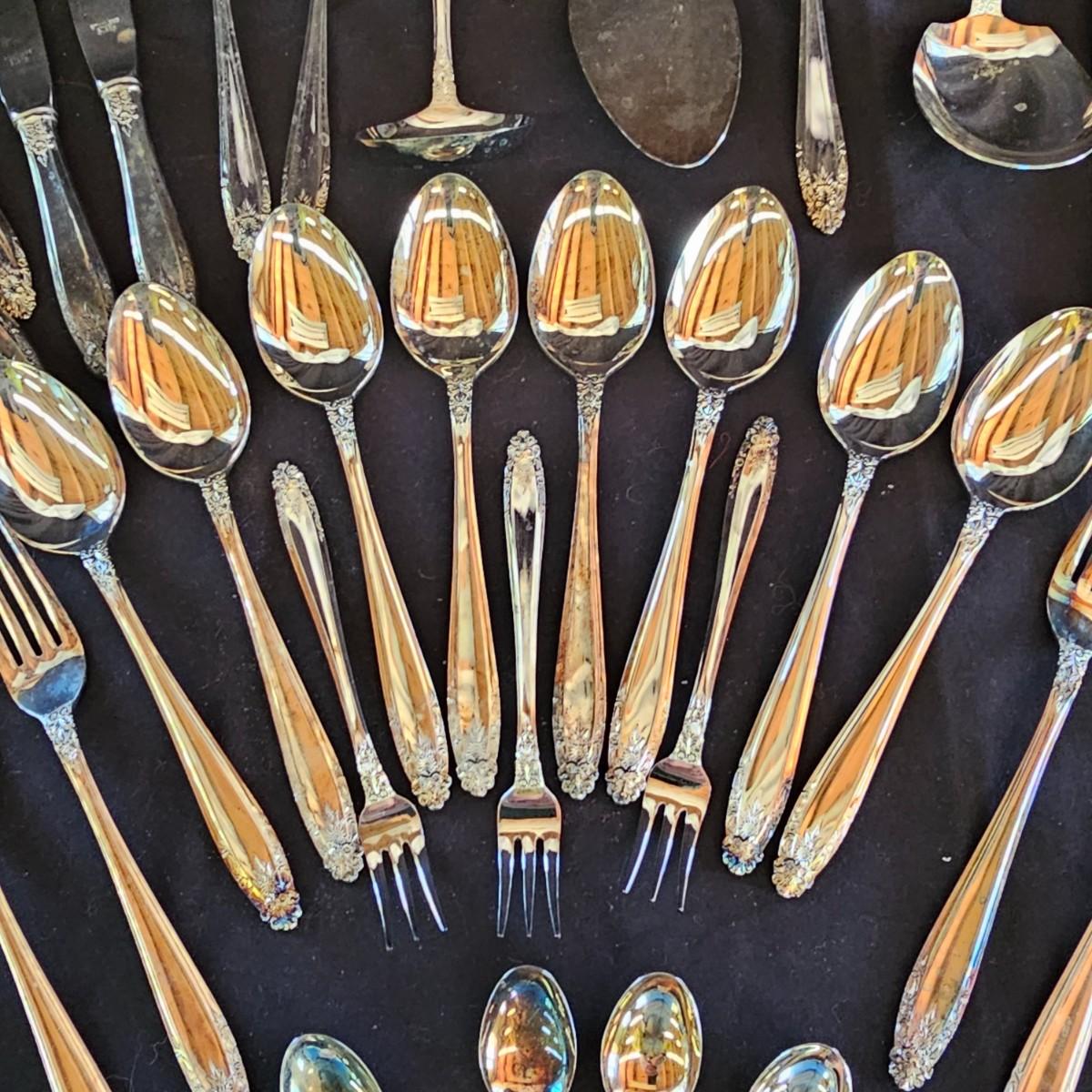 Knives, spoons, forks, serving pieces. These items are all marked nickel silver Japan. Tea and soup spoons, dinner and dessert forks. Ice tea spoons. Cocktail forks and sugar spoons. Some pieces have tarnish, see photos for details. There are five complete place settings within this collection. Shipping available.