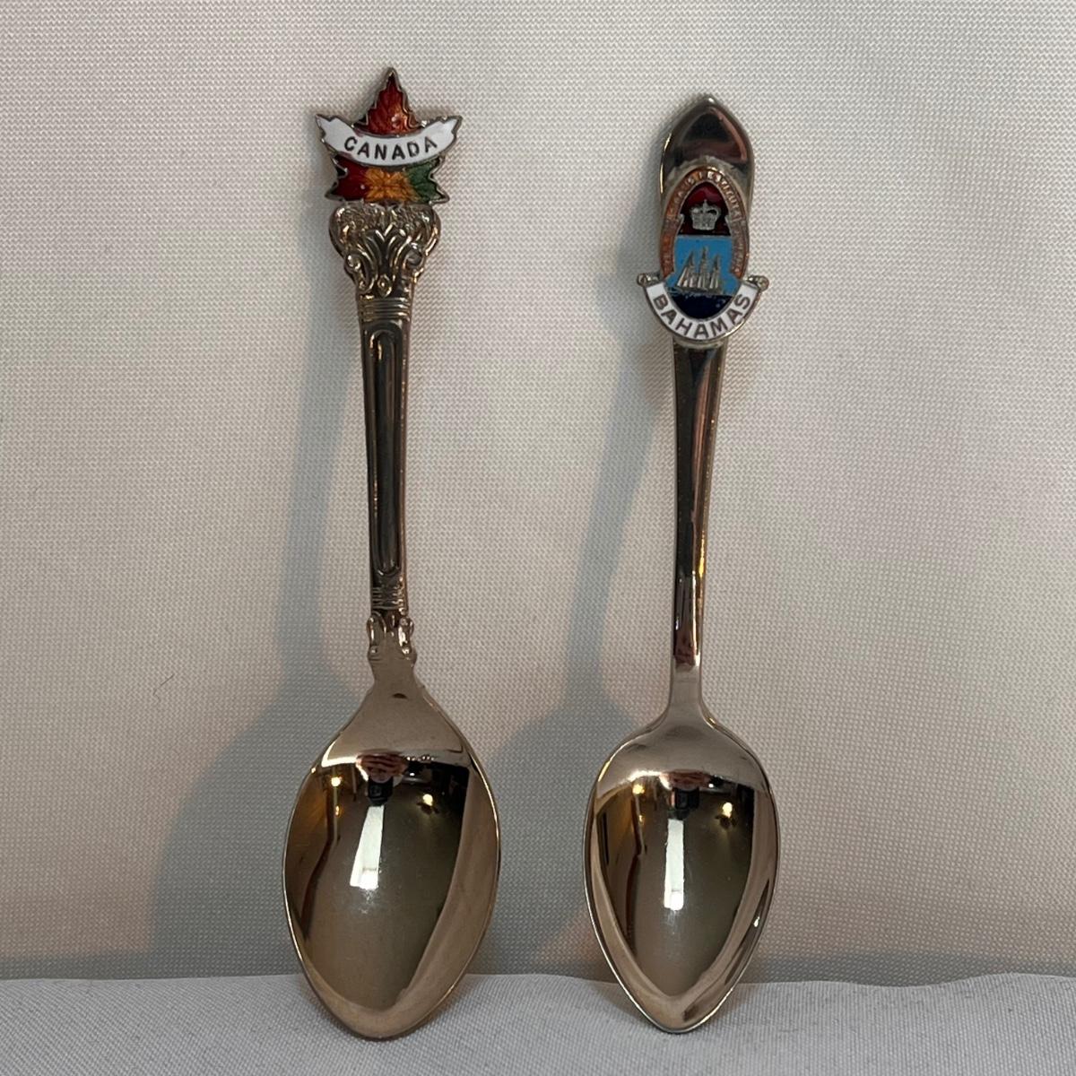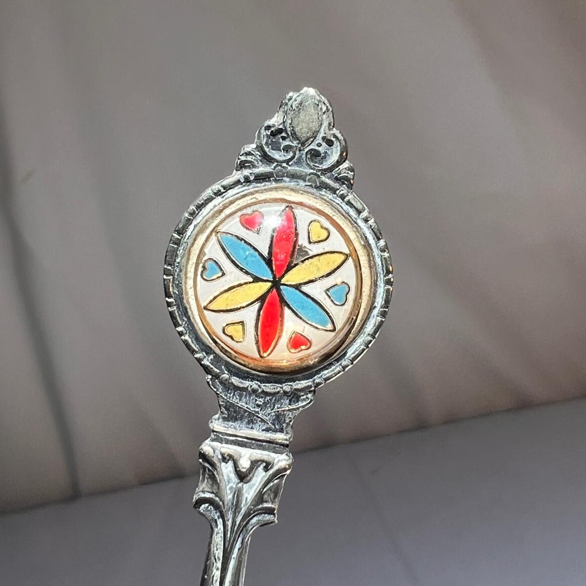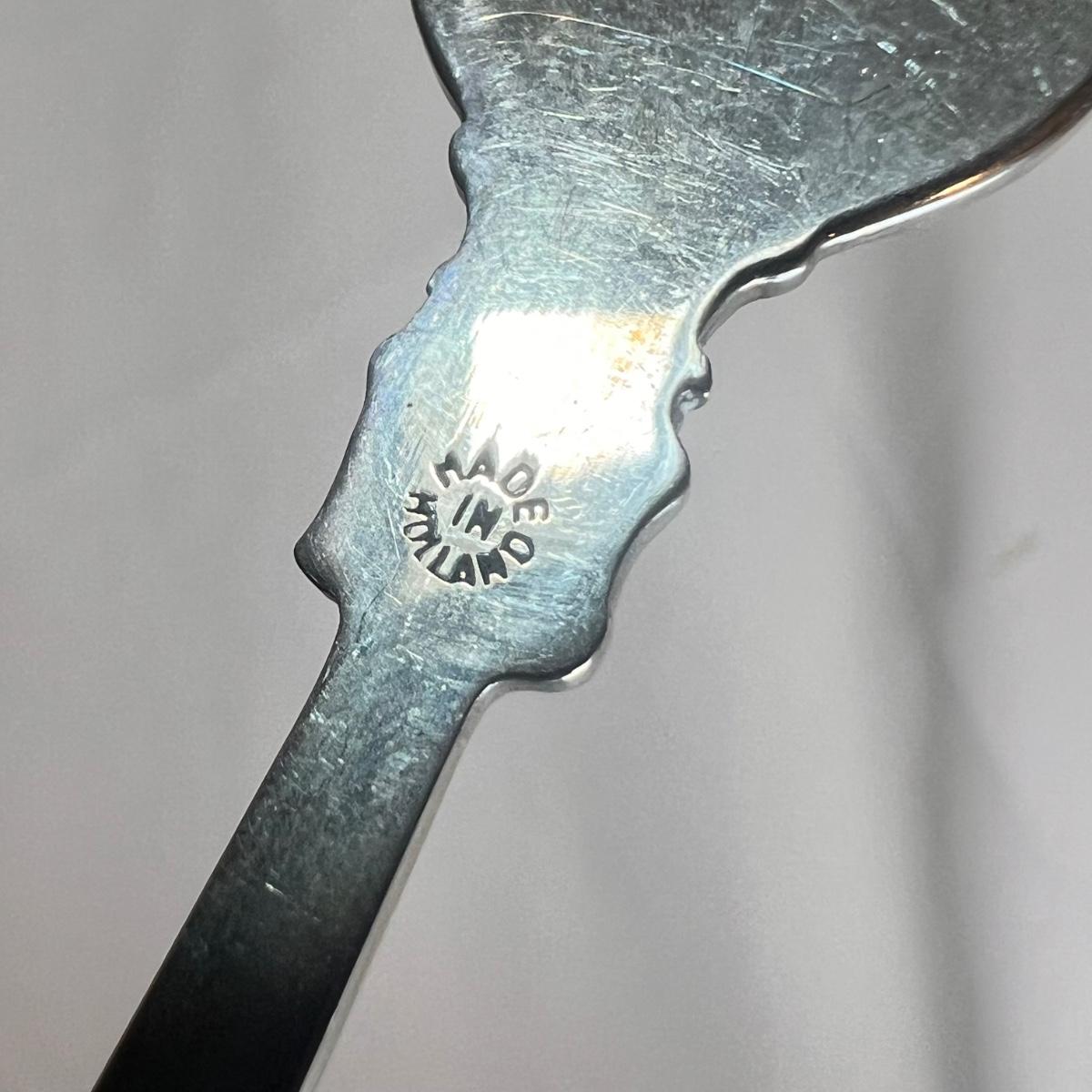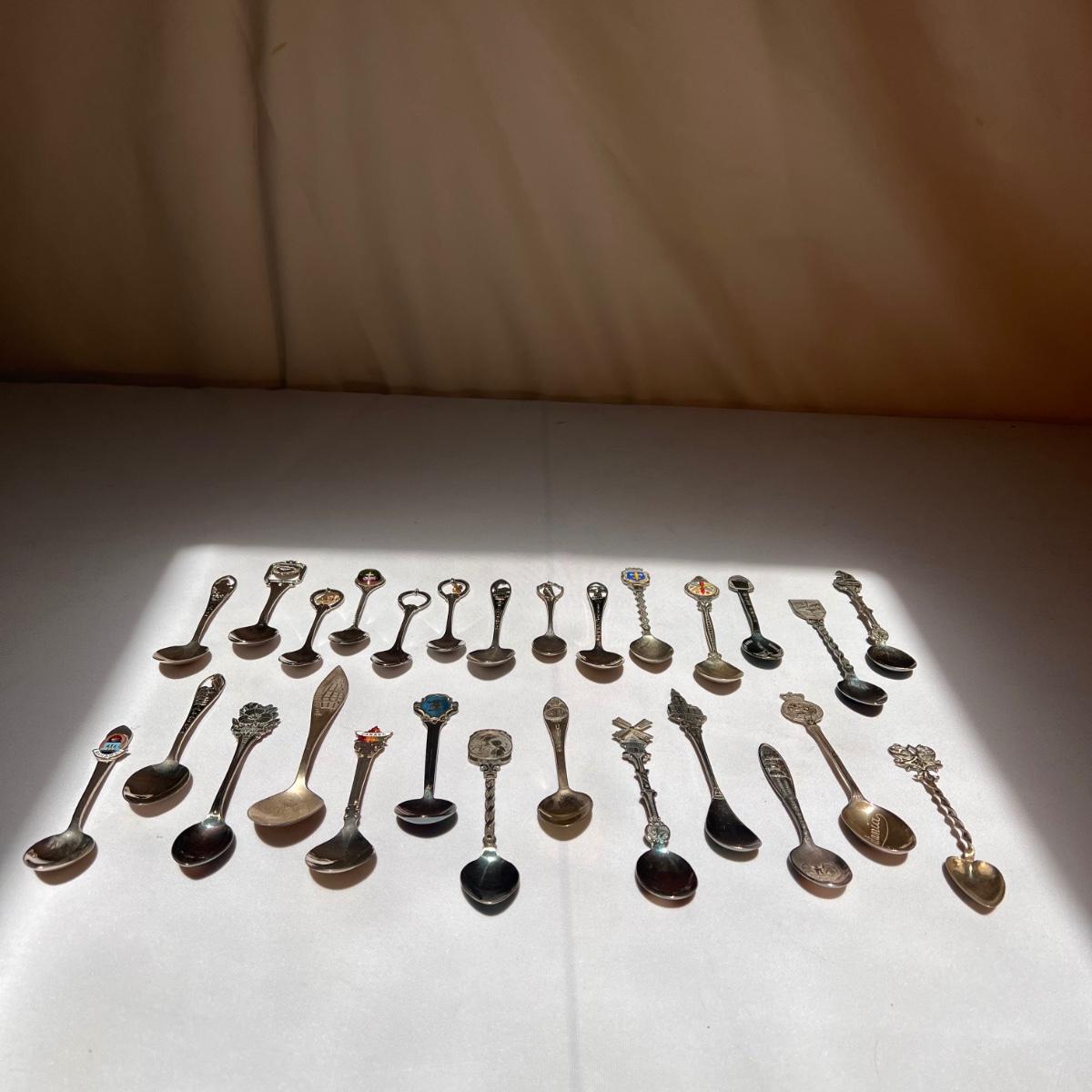 This lot included twenty seven collectible spoons from all over the world. Several spoons appear to be made and stamped in Holland. There are a handful of nickel silver spoons and one marked Sterling as well. The largest spoon is the one with a colorful flower on the top - it measures 5”H. Shipping available.