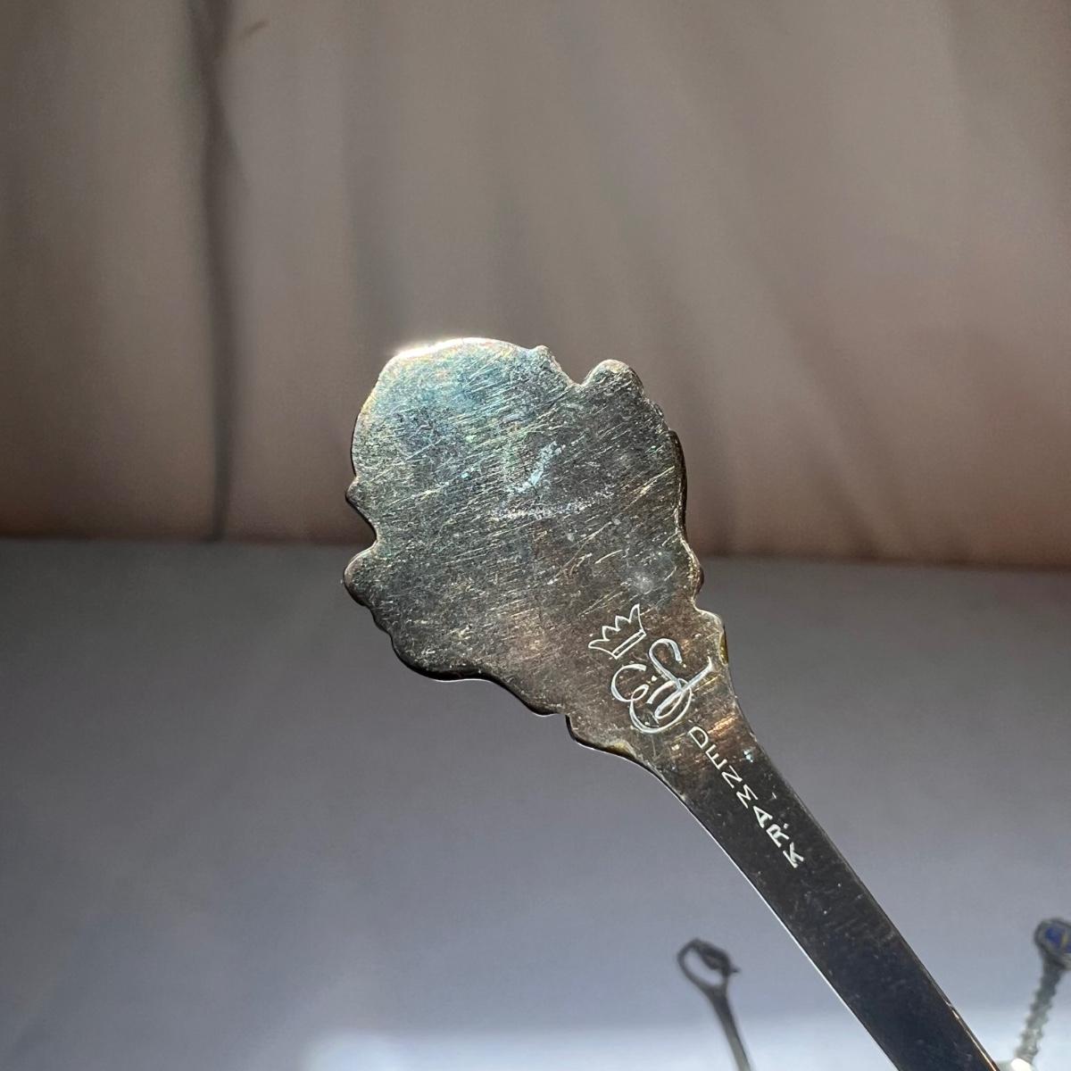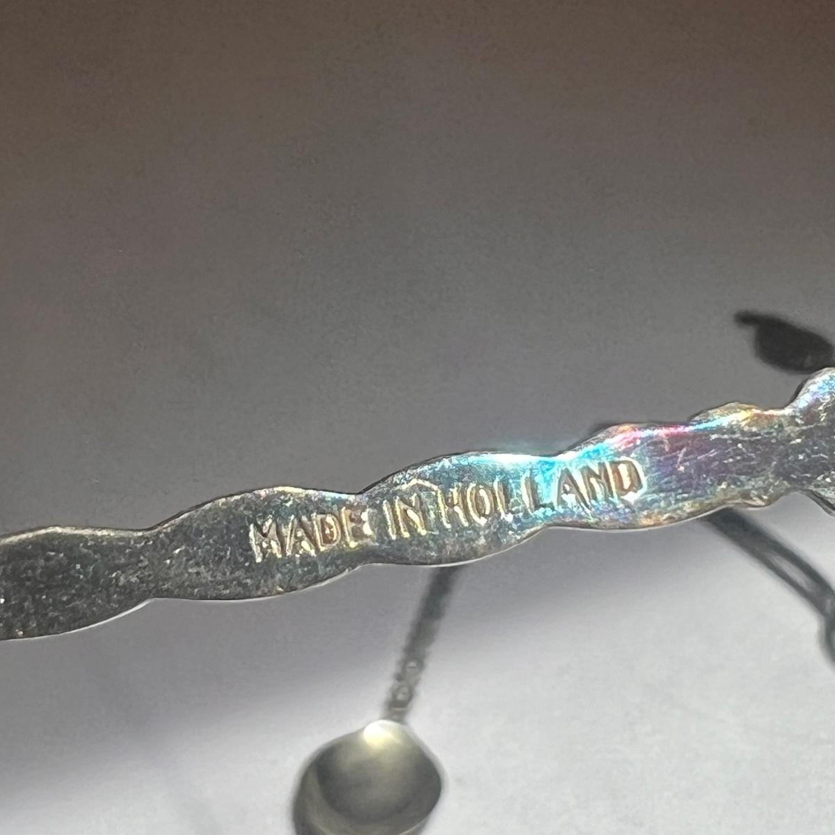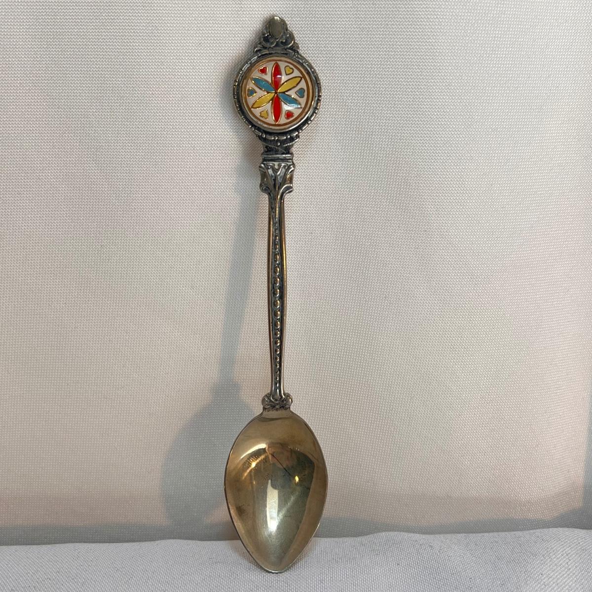 This lot included twenty seven collectible spoons from all over the world. Several spoons appear to be made and stamped in Holland. There are a handful of nickel silver spoons and one marked Sterling as well. The largest spoon is the one with a colorful flower on the top - it measures 5”H. Shipping available.