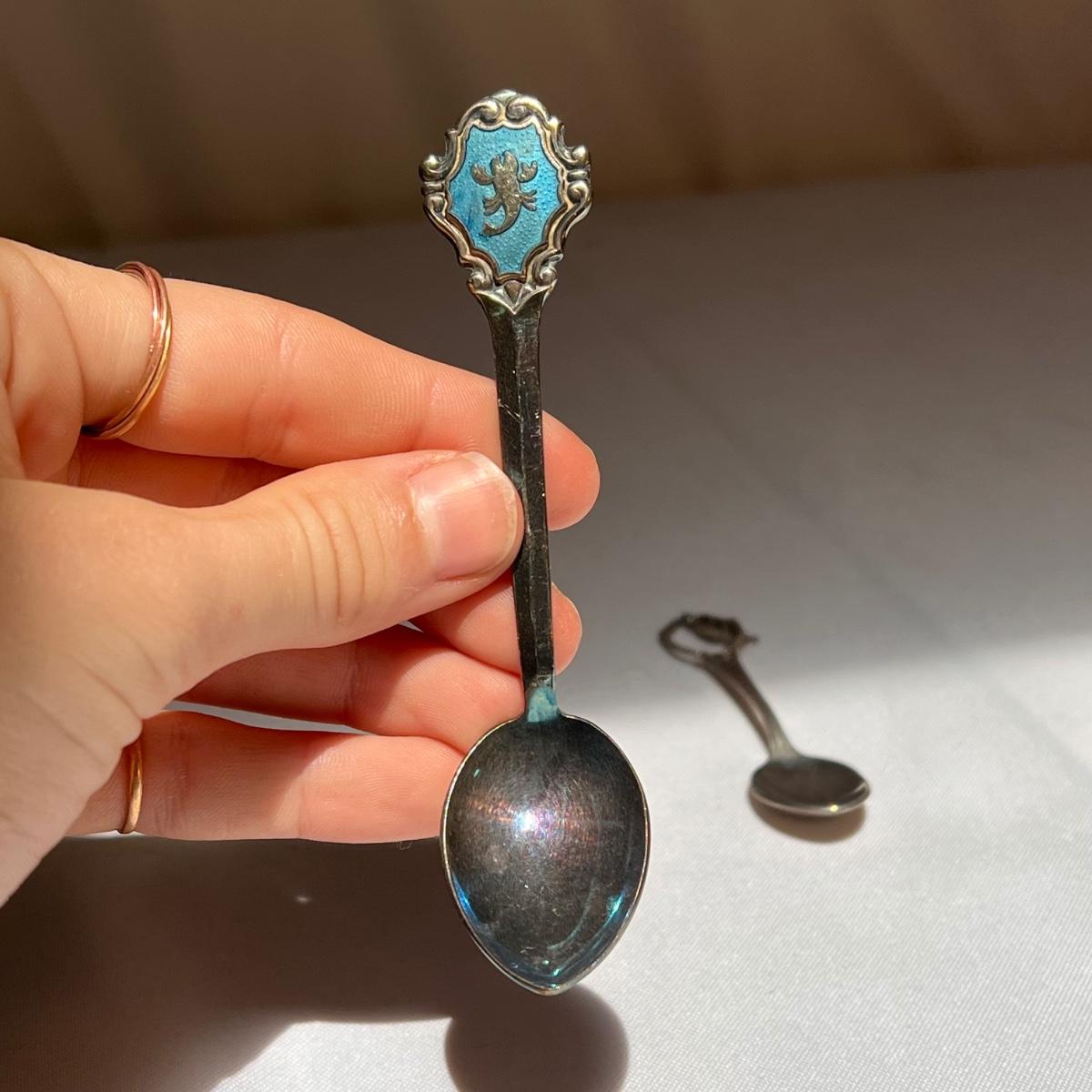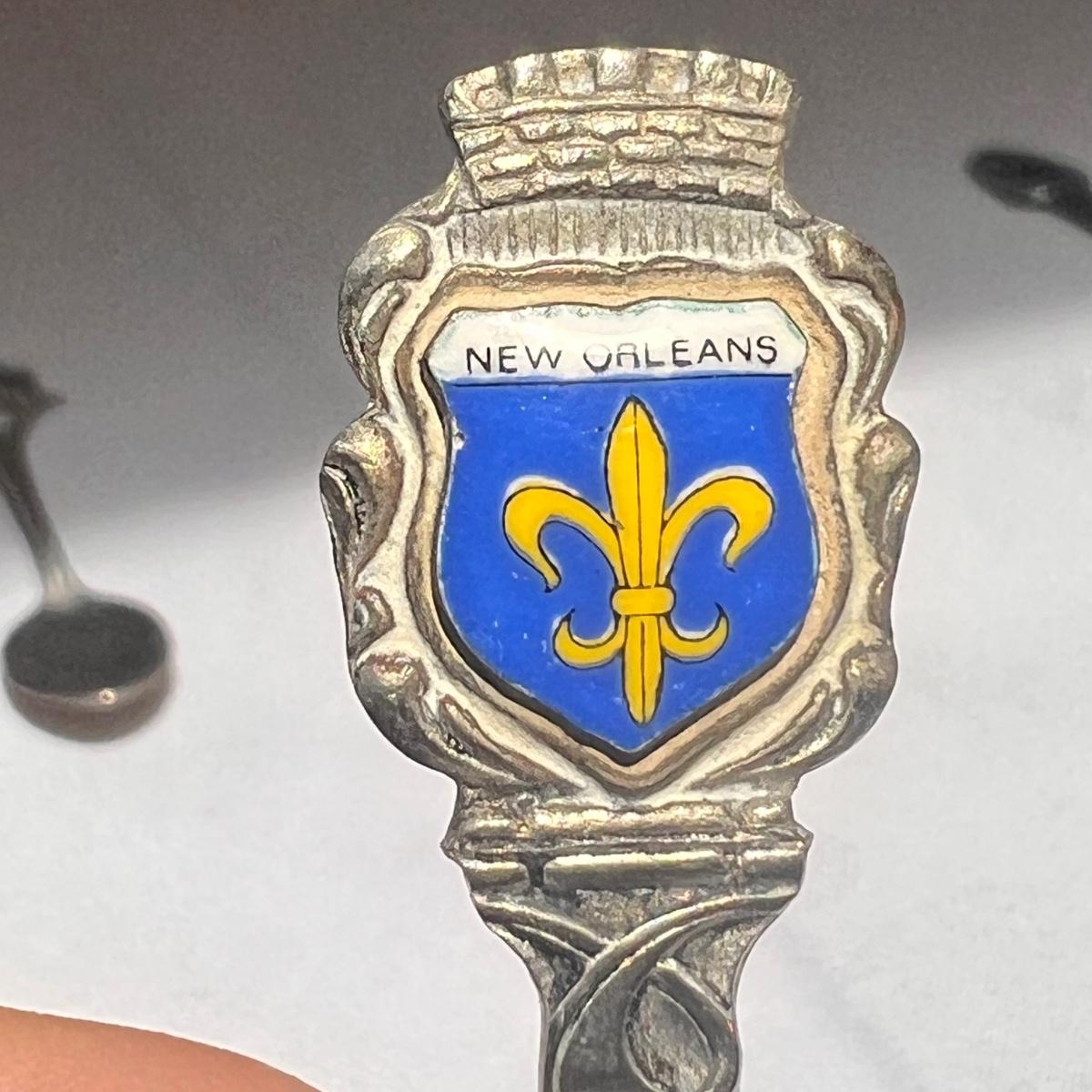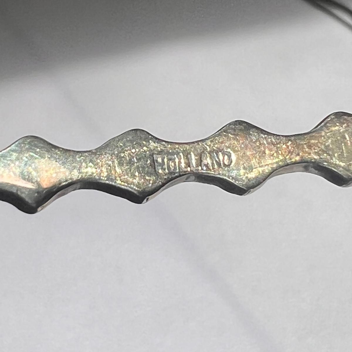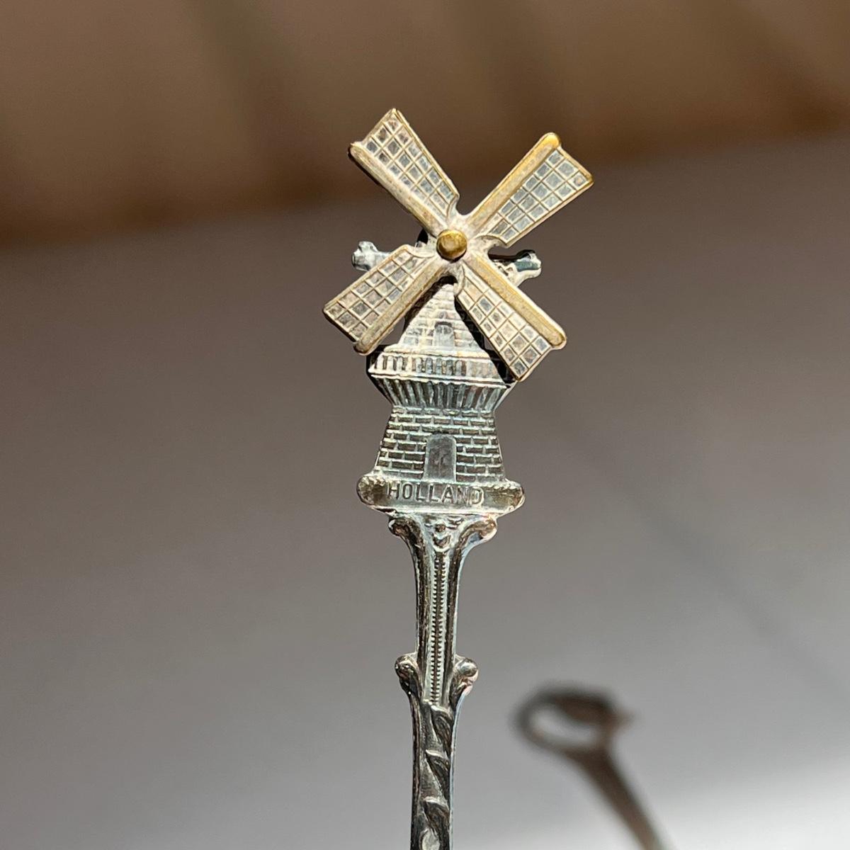 This lot included twenty seven collectible spoons from all over the world. Several spoons appear to be made and stamped in Holland. There are a handful of nickel silver spoons and one marked Sterling as well. The largest spoon is the one with a colorful flower on the top - it measures 5”H. Shipping available.