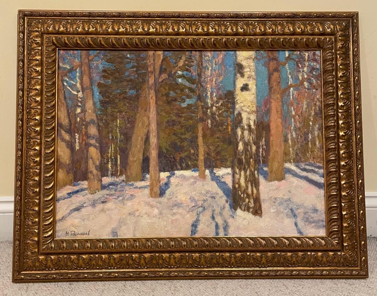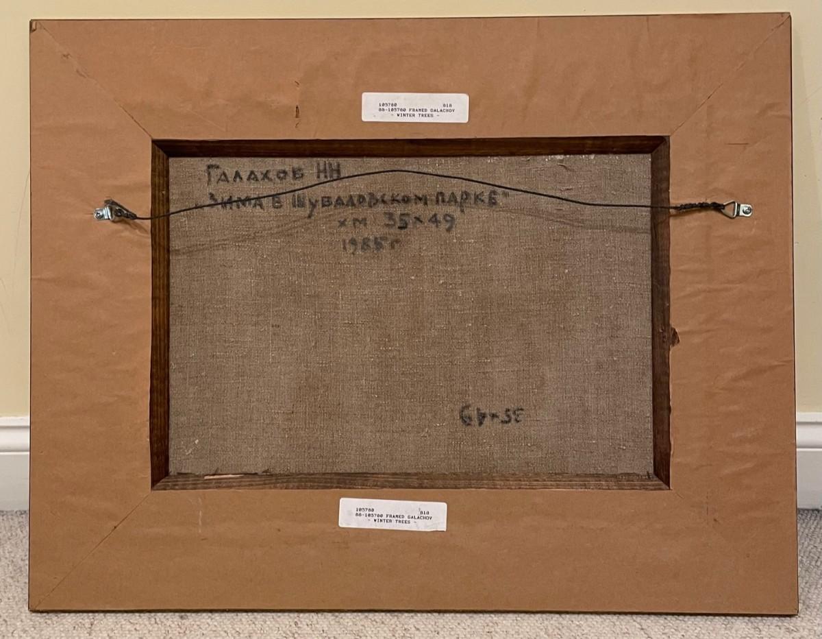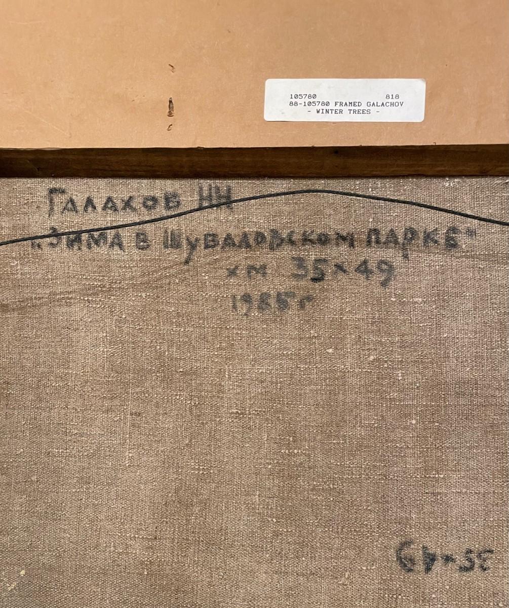 Description: Nicolai Galakhov oil painting on canvas/ WINTER TREES. Nikolai Galakhov is a Postwar & Contemporary painter who was born in 1928.The State Russian Museum featured Nikolai Galakhov's work in the past. Nikolai Galakhov's work has been offered at auction multiple times, with realized prices ranging from 1,152 USD to 19,644 USD, depending on the size and medium of the artwork. Since 2014 the record price for this artist at auction is 19,644 USD for WOODCUTTER'S ROAD, sold at Sotheby's London in 2014.; Material: Oil on canvas; Measurement approximate: 25 x 20 in. (framed), 22 x 17 in. (Canvas)