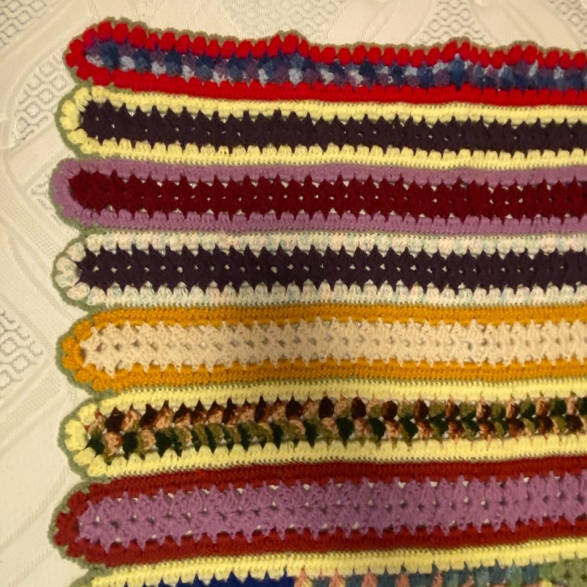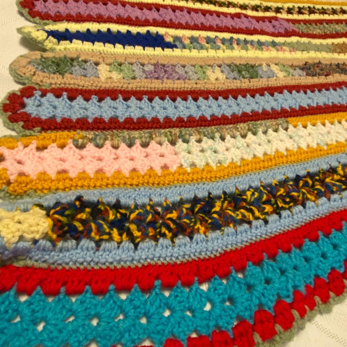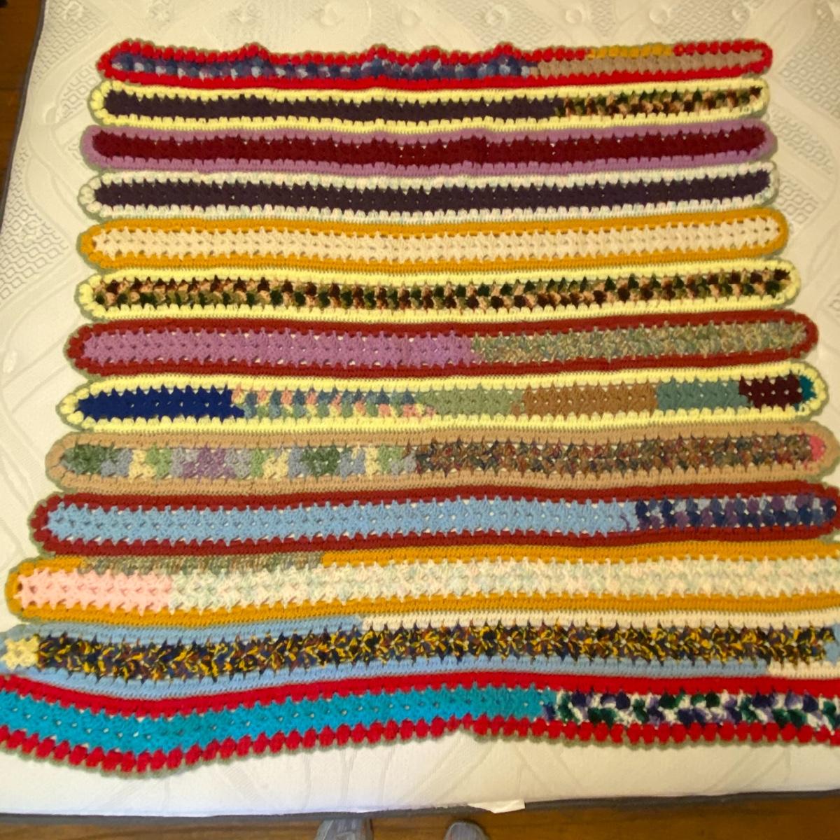 Lot includes two plaid cozies that snap up and resemble a sleeping bag. Lot also includes crocheted blankets with many different colors and patterns. See photos for details. Shipping available