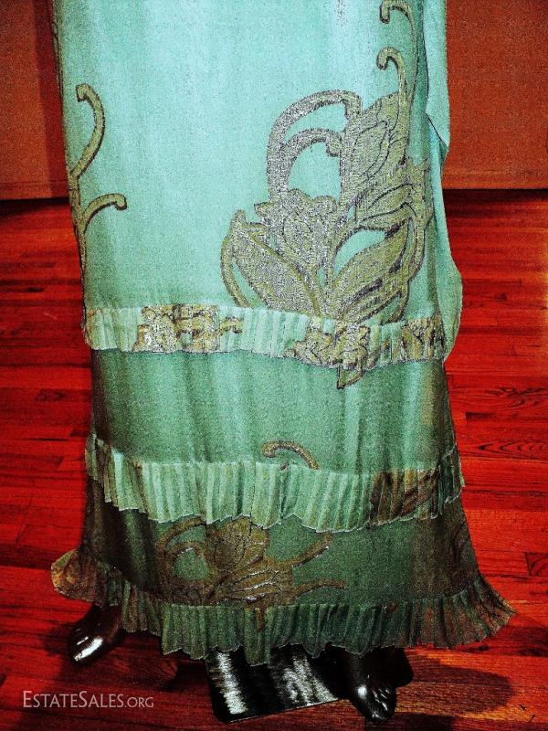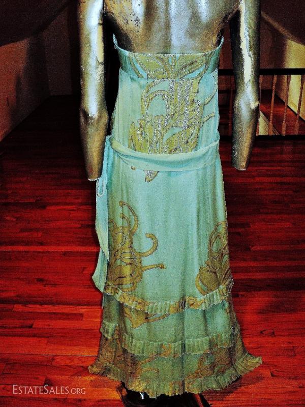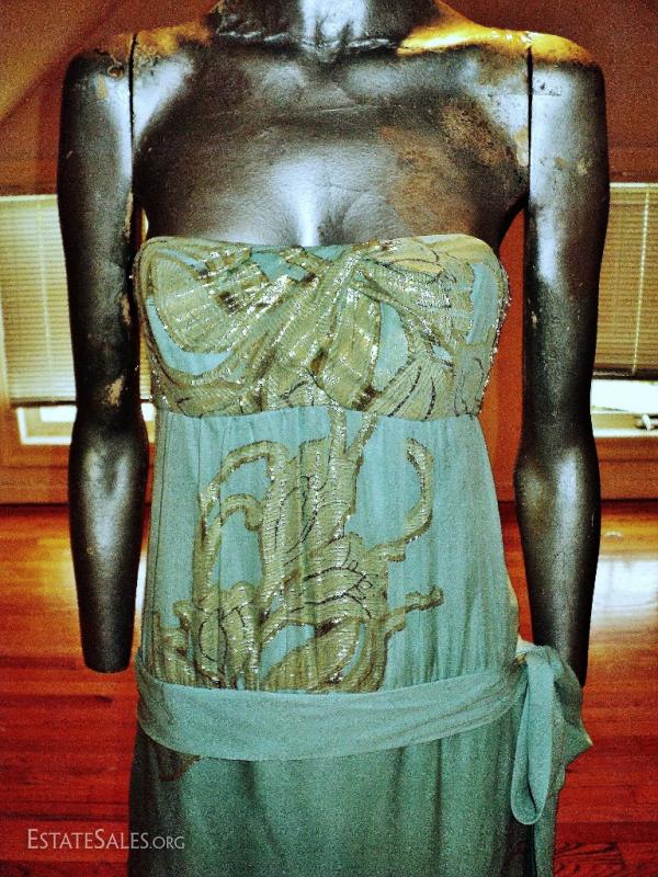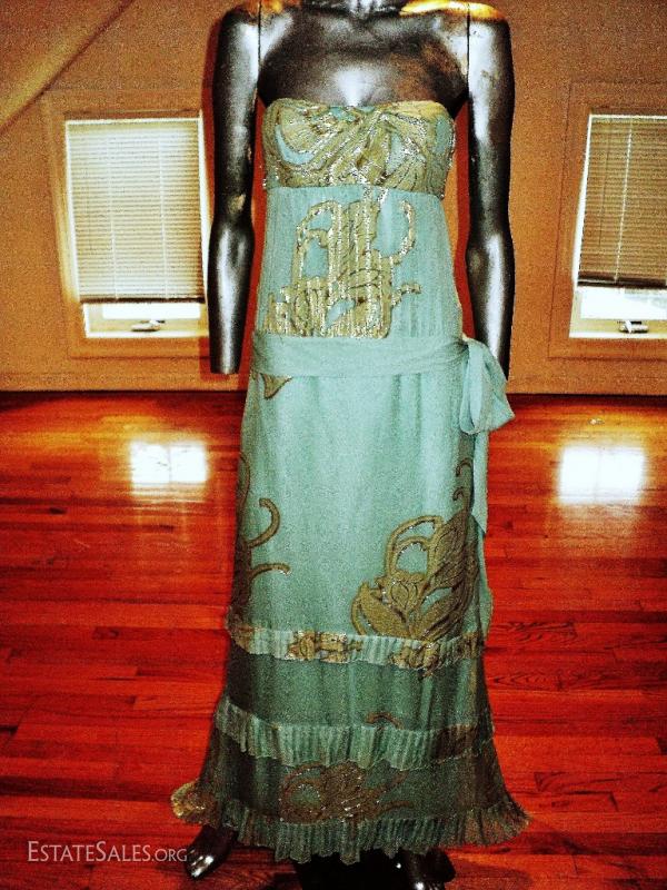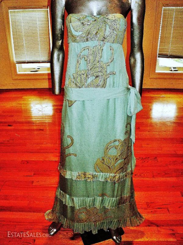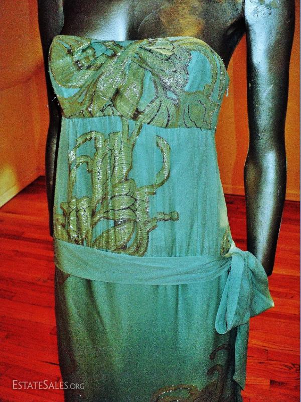 Drop dead gorgeous is this runway gown silk chiffon metallic gold lame' floral design strapless beauty. Bustier bustline . Just perfect.