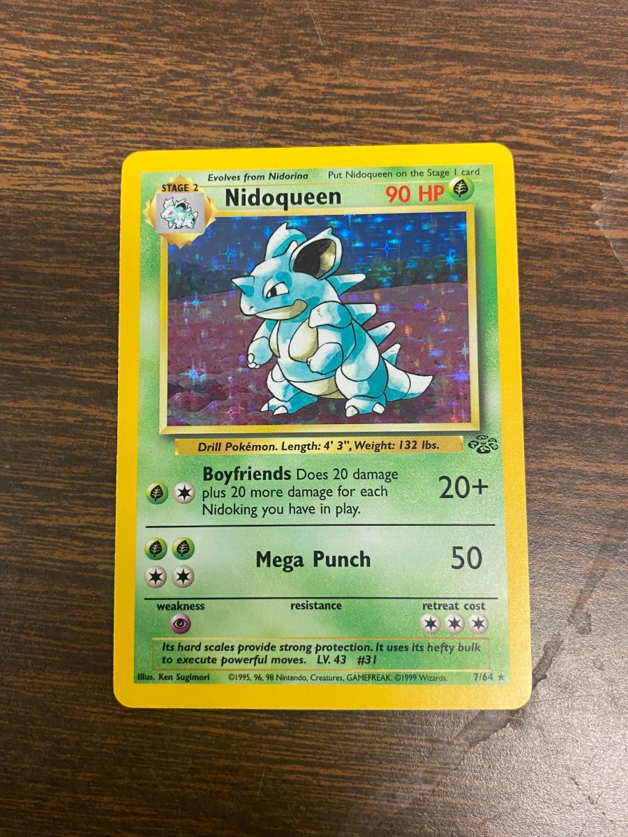 This is a holo Nidoqueen card from the Jungle set of the Pokemon Trading Card Game. Card number 7/64. It has a light play condition with some visible wear on the front and back. Features 90 HP with Boyfriends and Mega Punch attacks. Suitable for collection or play.